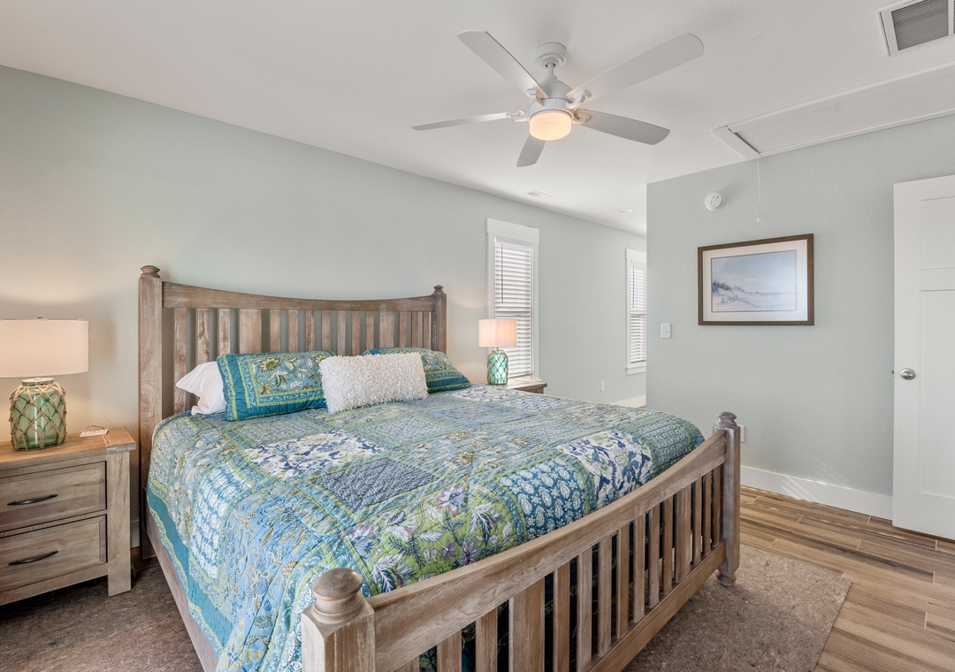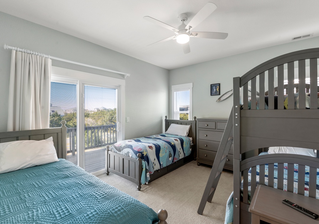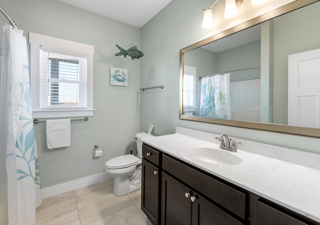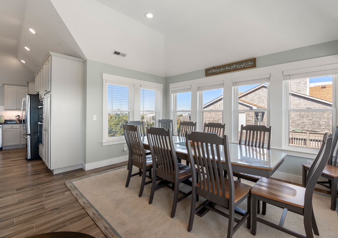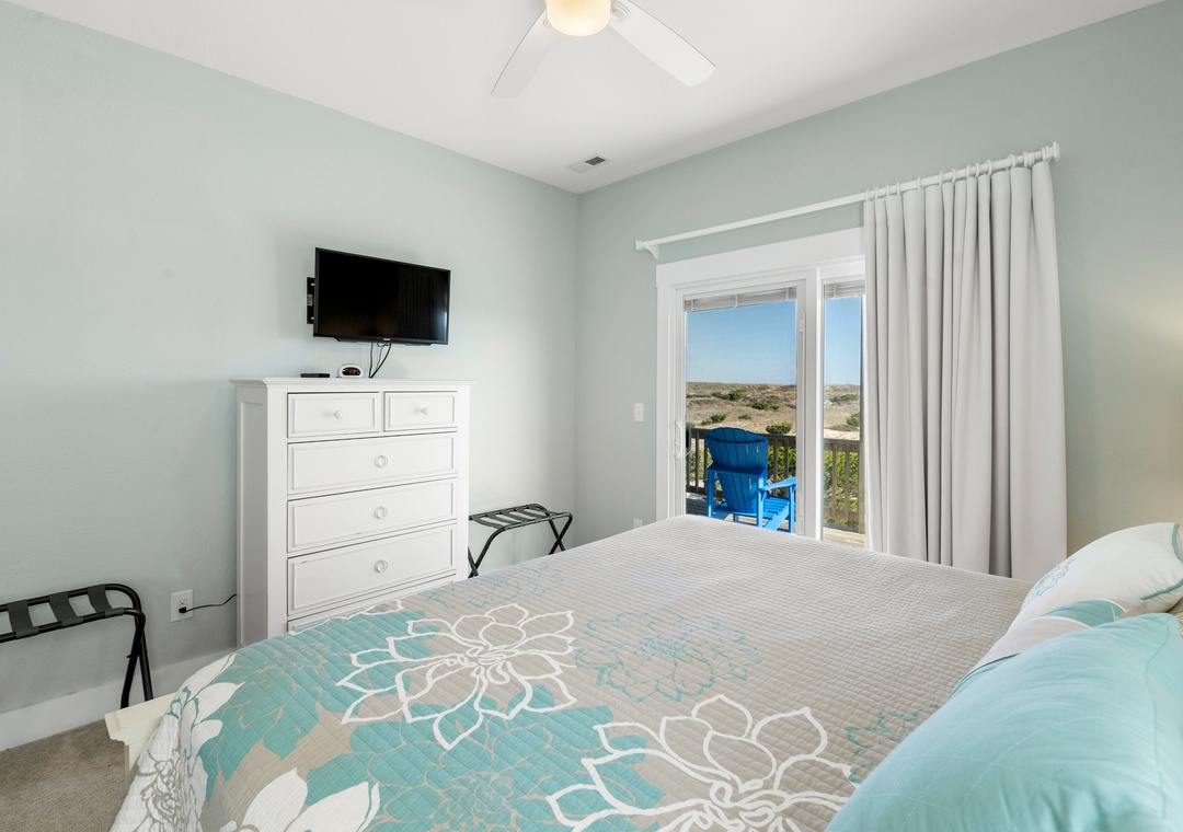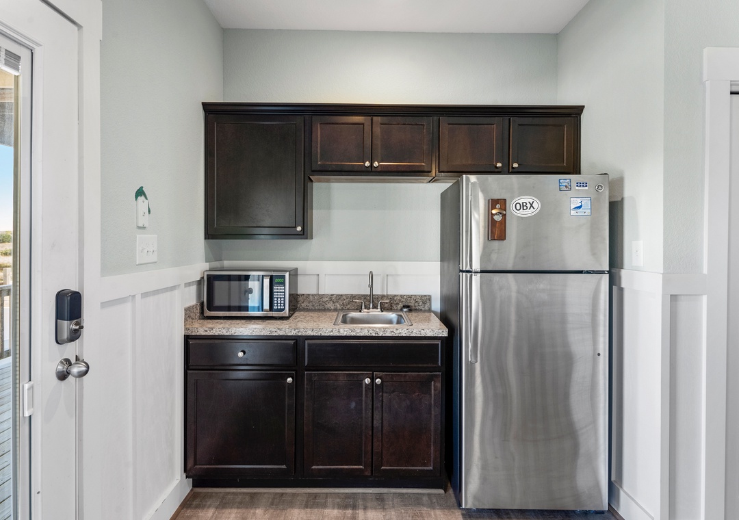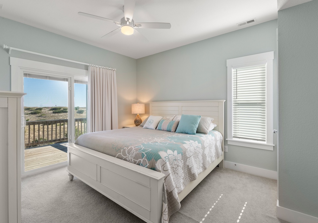 The great room on the top level is designed for entertaining and spending time with loved ones. Curl up in front of the cozy electric fireplace and admire the panoramic ocean views showcased by the wall of east-facing windows. Comfortable furnishings, a soothing color palette and LVP flooring throughout create a casual, family-friendly space. Embrace your inner chef in the gourmet kitchen that boasts two islands, granite countertops and stainless steel GE Profile appliances. An expansive oceanfront sun deck serves as an extension of the great room for effortless indoor/outdoor living. It's the perfect spot to watch the sunrise with your morning coffee or simply take in the salt air and ocean breezes. Salt & Light is equipped with an elevator, ideal for guests with mobility needs or for sending luggage and groceries to the upper levels.