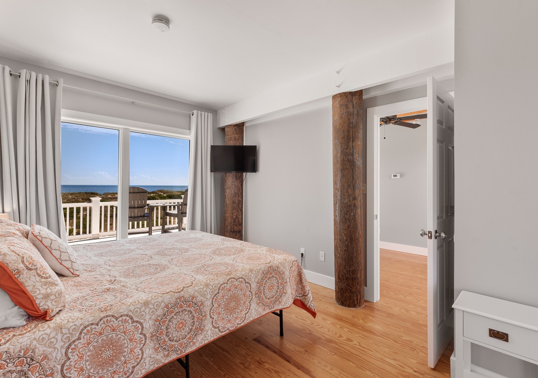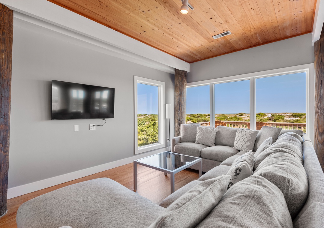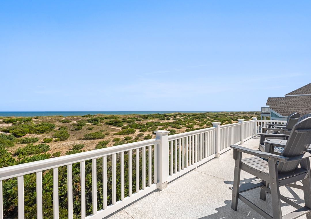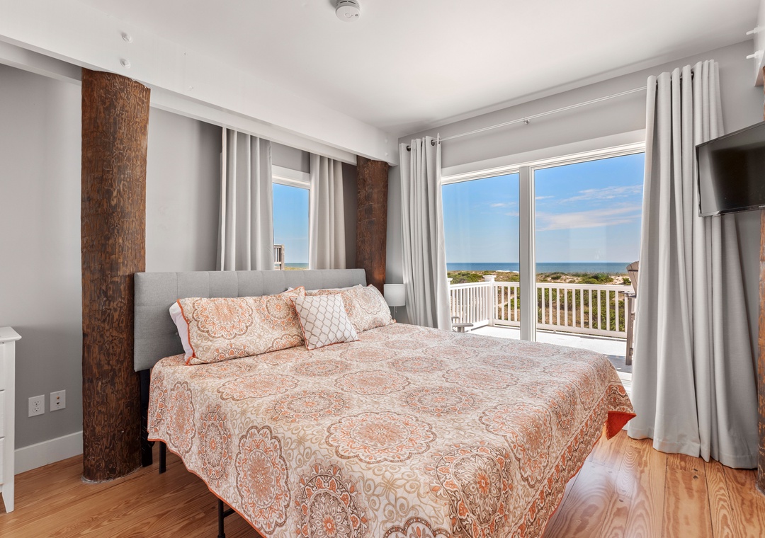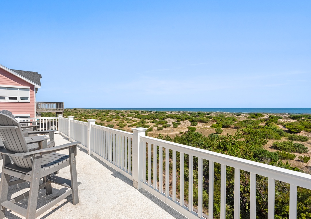 The top level offers a luxurious king bedroom with a private deck overlooking the ocean, a cozy nook with a full-size bed perfect for a peaceful night's sleep, and a bonus sleeping area with spectacular ocean views. A full bath completes this level.