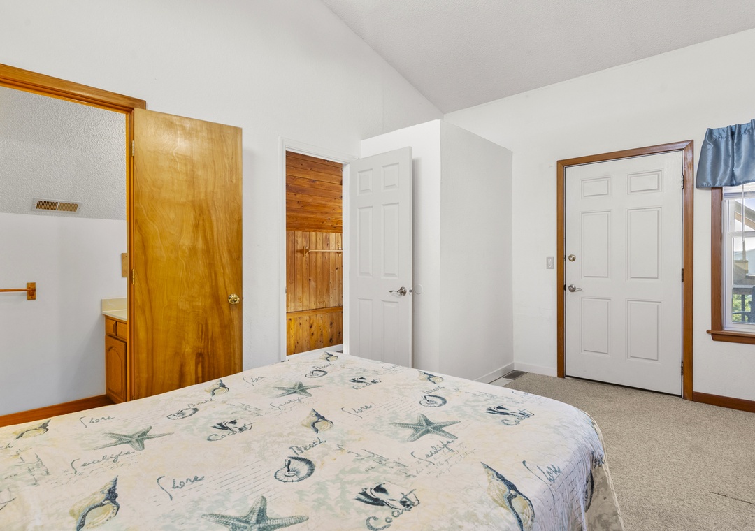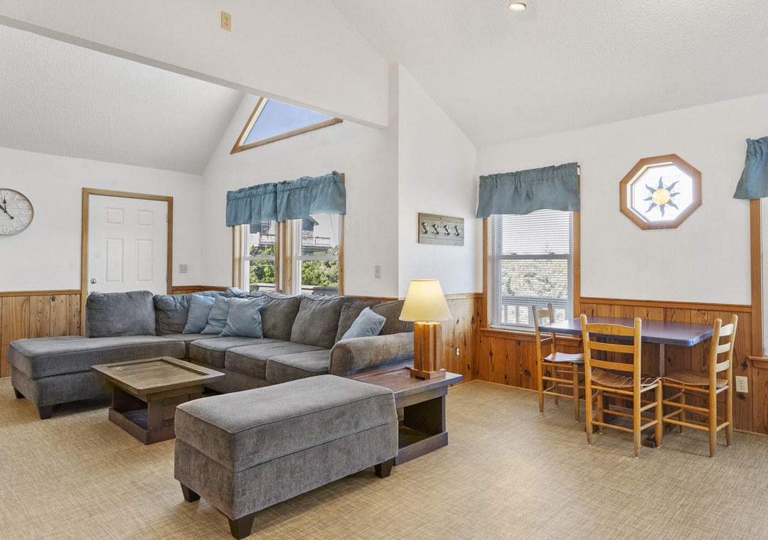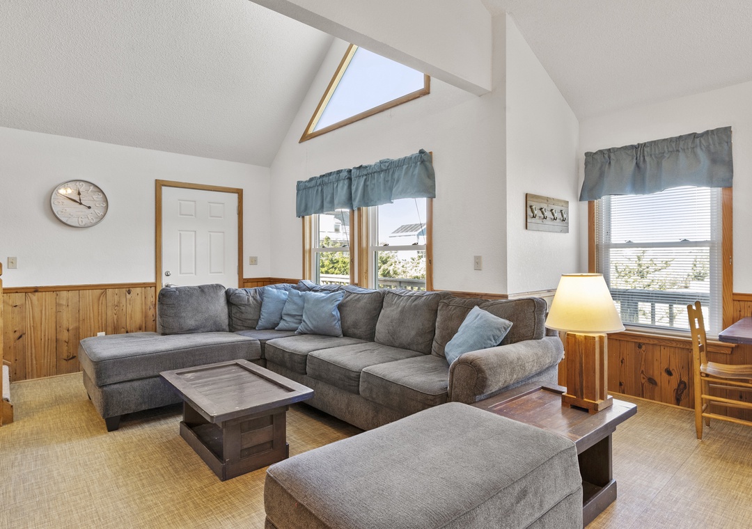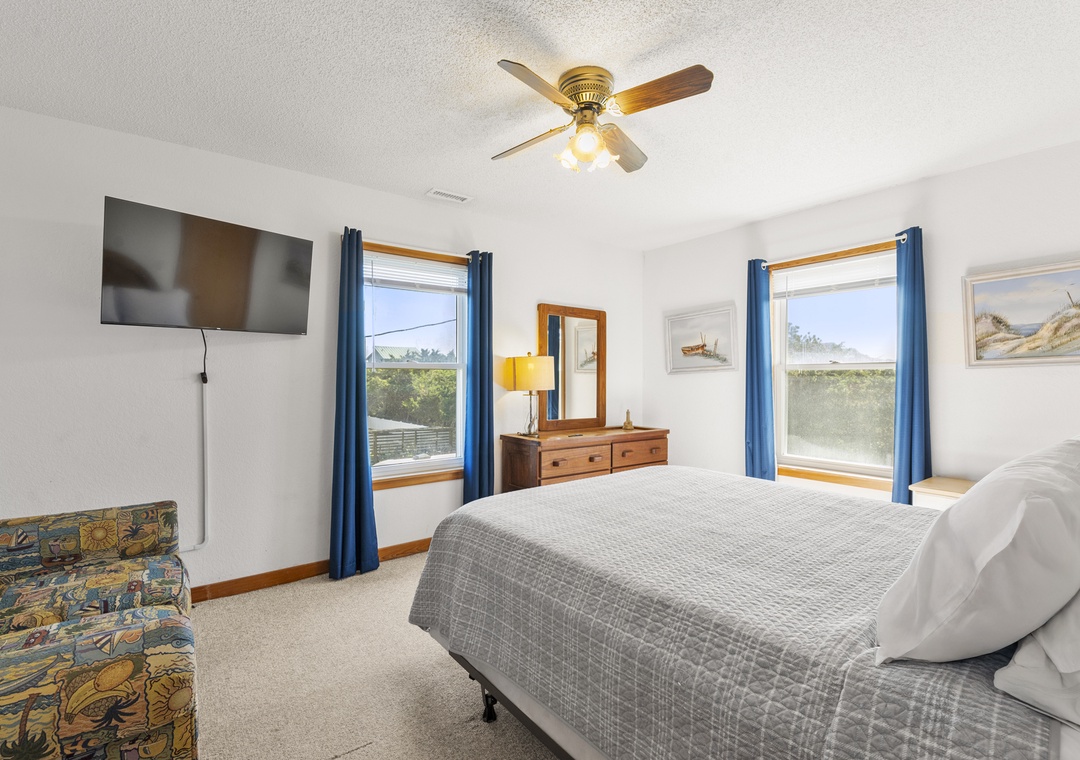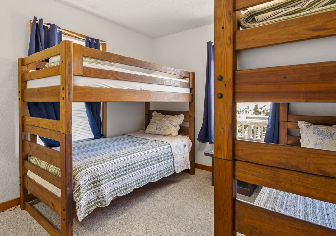 On the ground level, you’ll find a freshly poured concrete area perfect for beach gear, bikes, or a quick game of cornhole. Rinse off the salt and sand in the outdoor shower before heading inside to your beachy haven. The home features two queen bedrooms and a bunk room with two sets of bunks—perfect for kids or the young at heart!