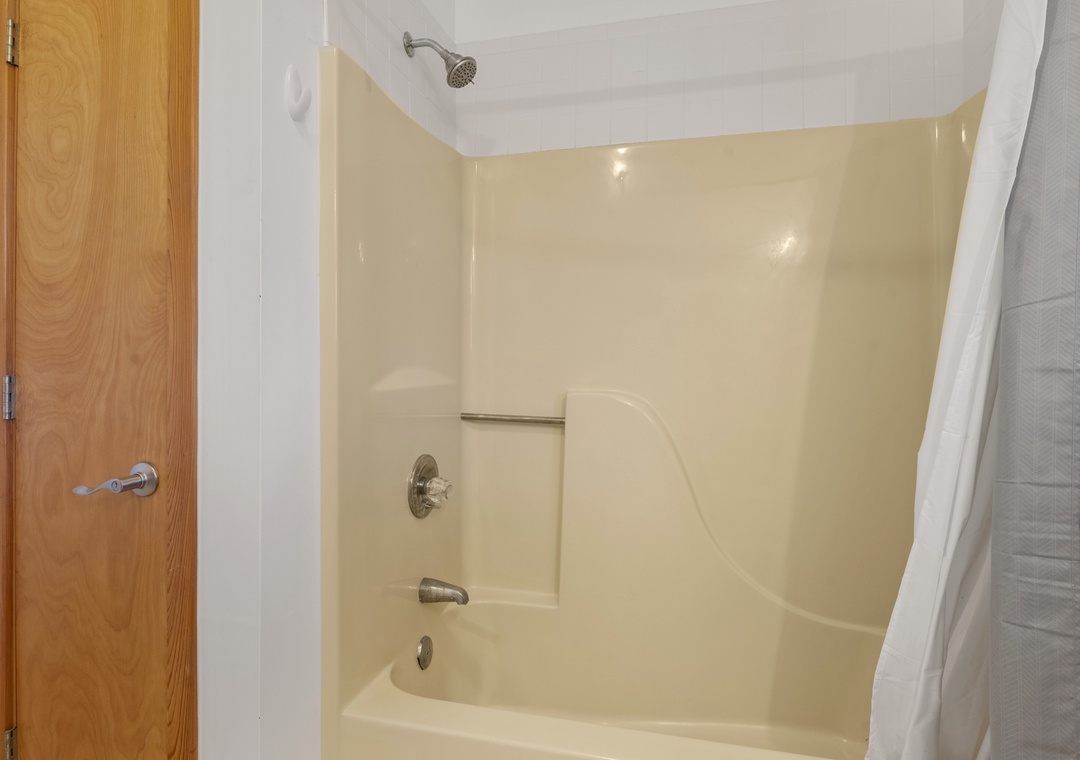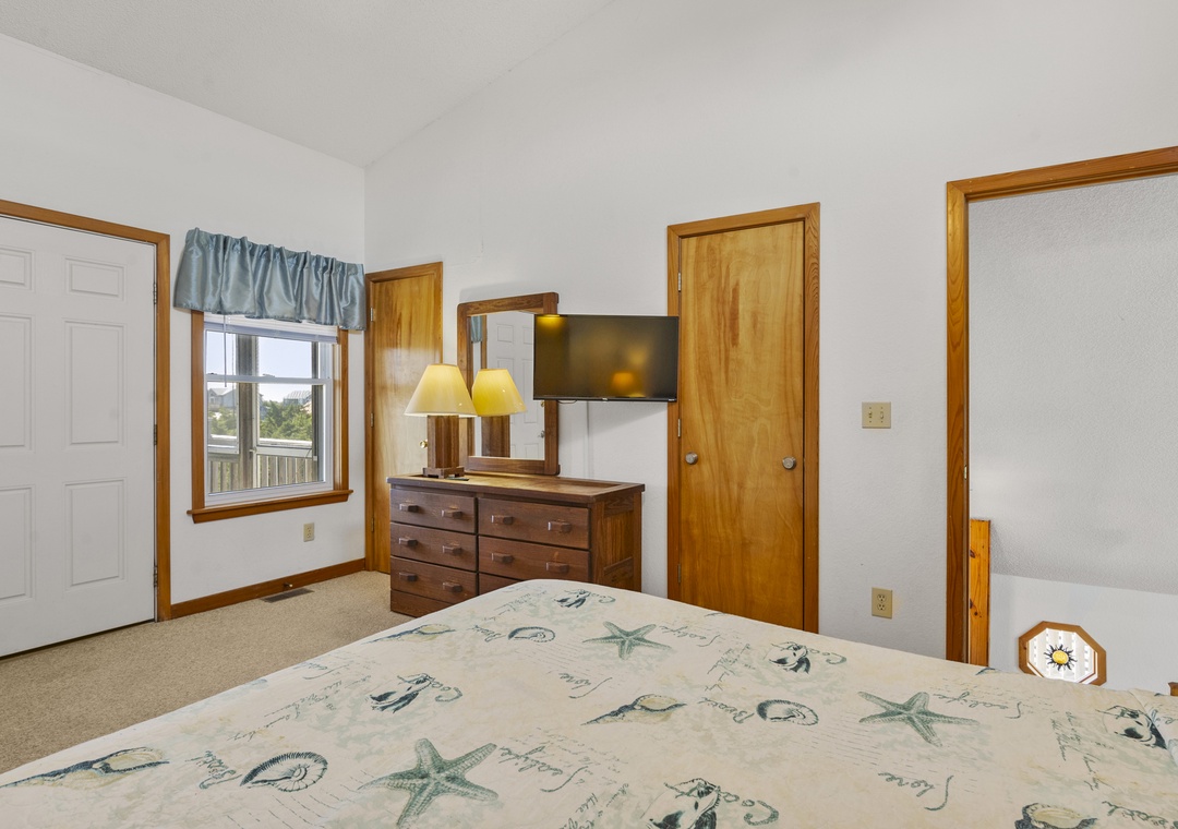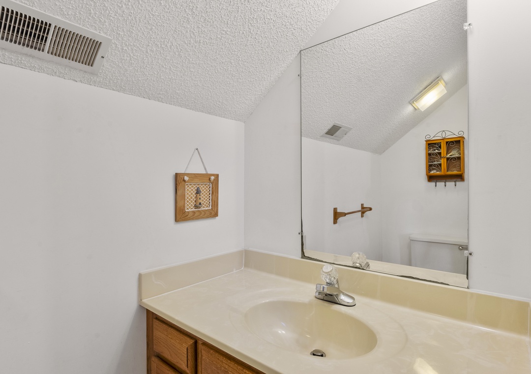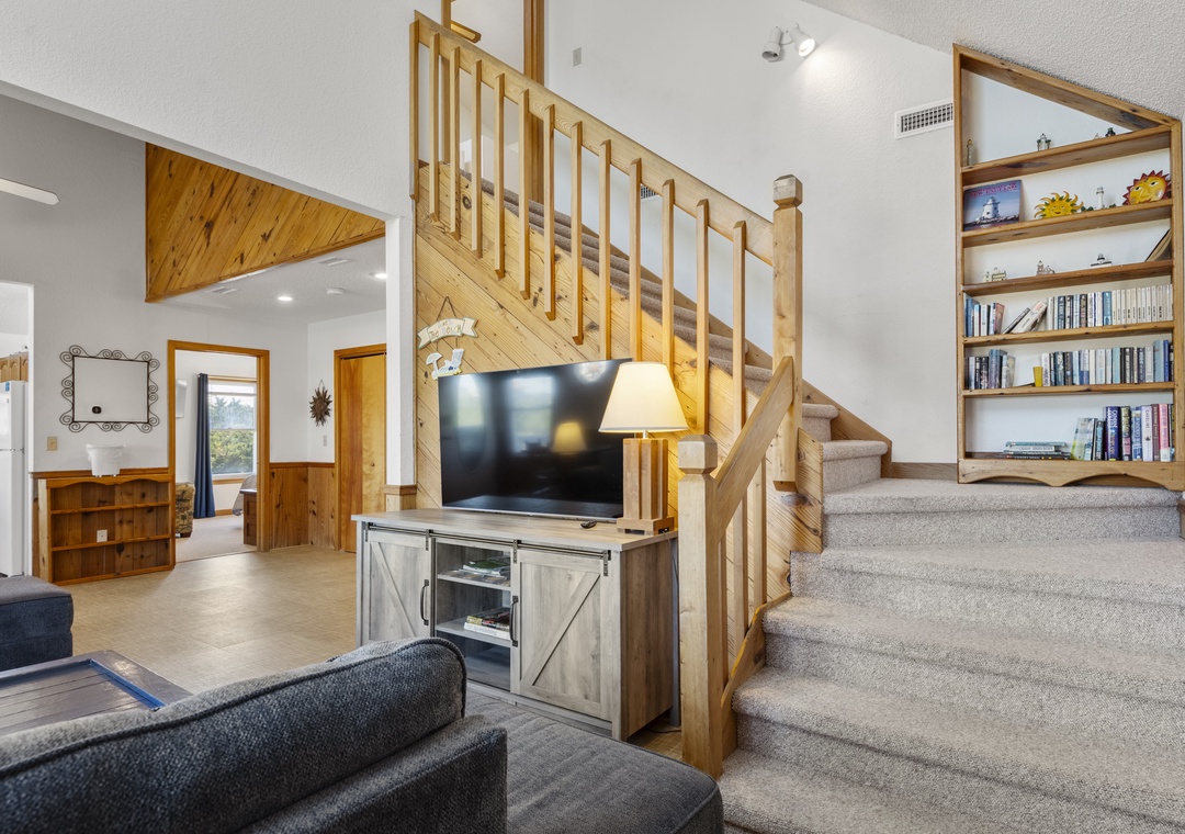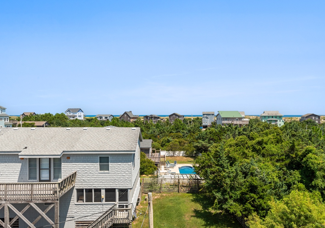 On the ground level, you’ll find a freshly poured concrete area perfect for beach gear, bikes, or a quick game of cornhole. Rinse off the salt and sand in the outdoor shower before heading inside to your beachy haven. The home features two queen bedrooms and a bunk room with two sets of bunks—perfect for kids or the young at heart!