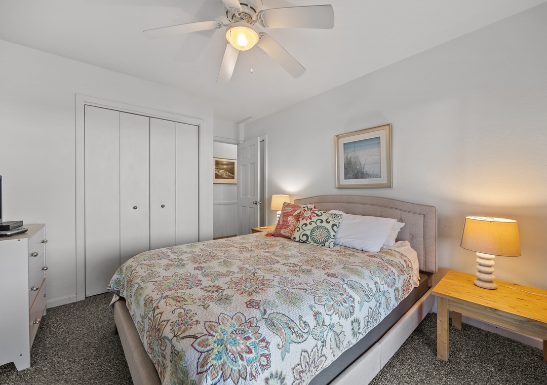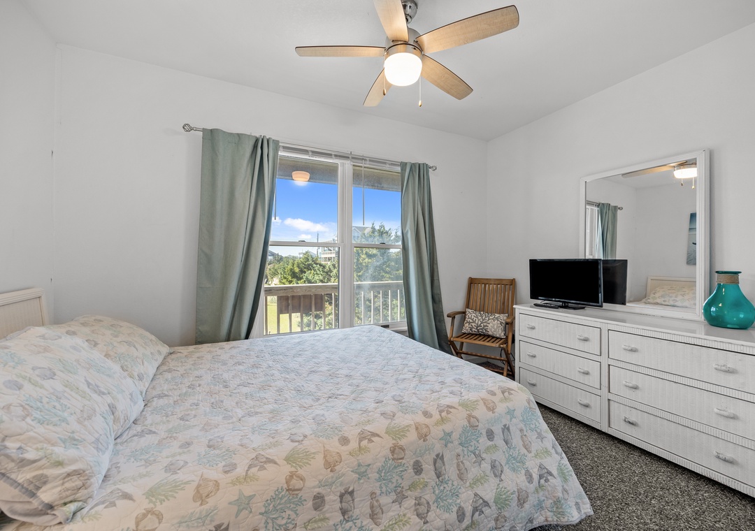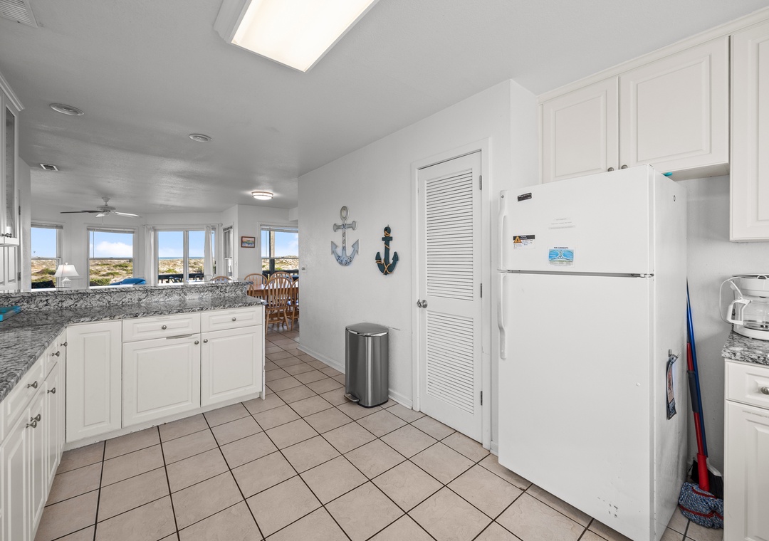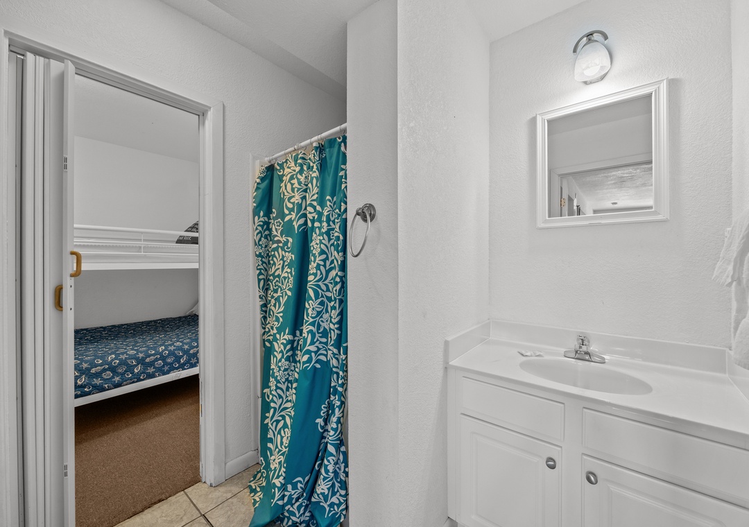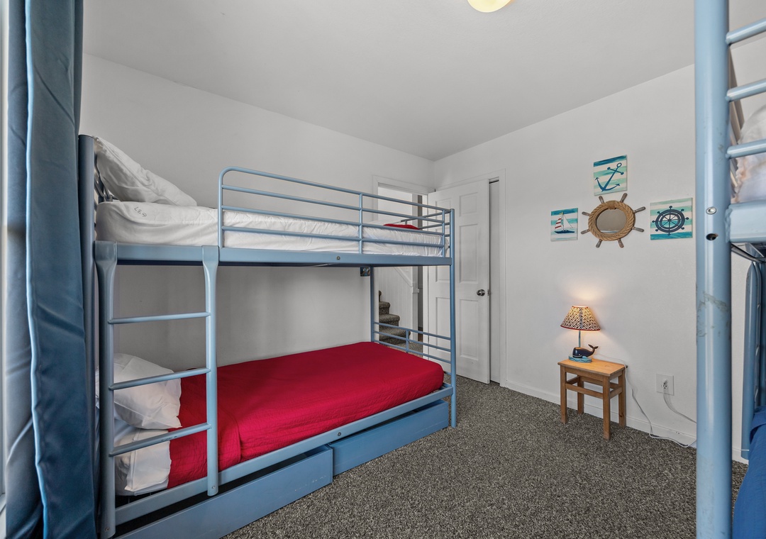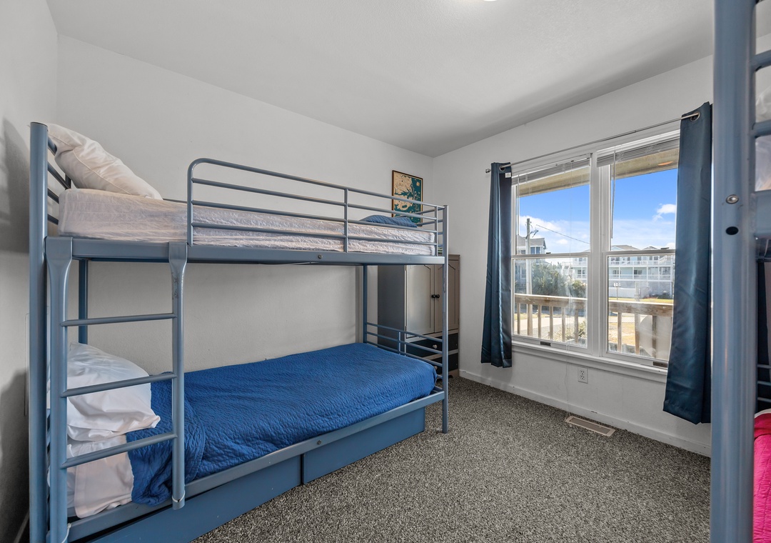 The second level offers guest queen bedrooms, additional bunk beds, a laundry room for convenience, and access to an outdoor deck complete with a hot tub, ideal for unwinding after a day of beachside adventures.