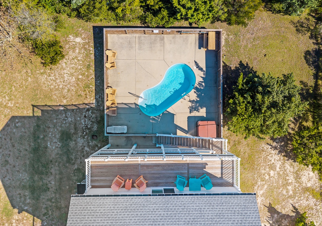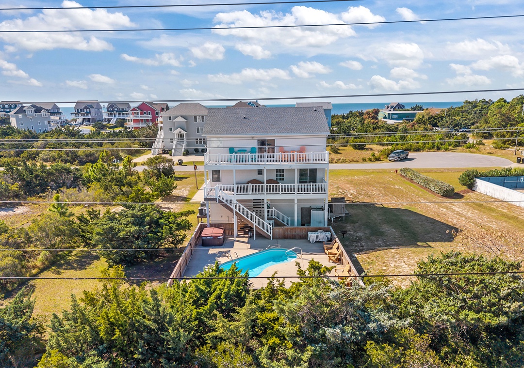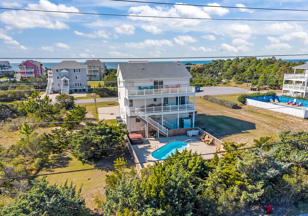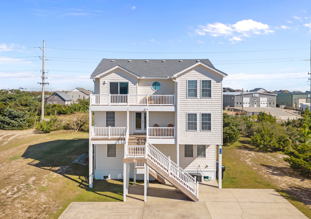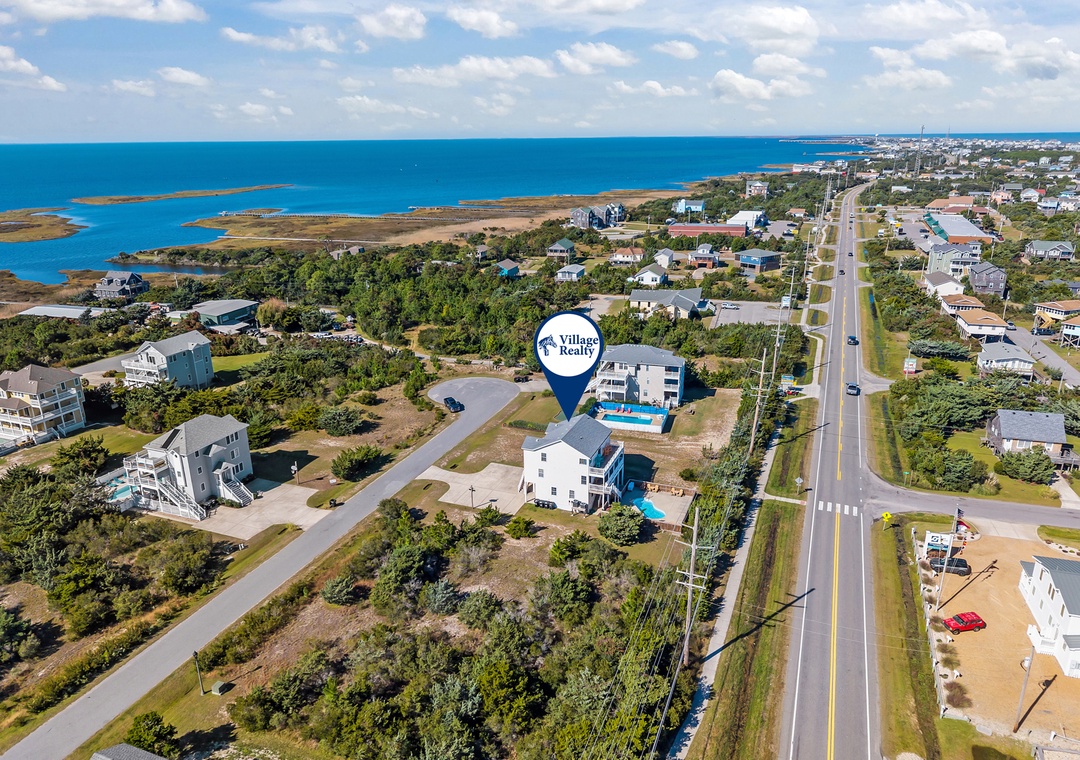 On the top level, you’ll find the luxurious ensuite bedroom with a full bath featuring both a shower and a jacuzzi tub. The open floor plan includes a living room, dining area, and kitchen, all opening to both sound side and ocean side decks. There's also a convenient half bathroom, an owner's closet, and two smart TVs to enjoy during your stay.
