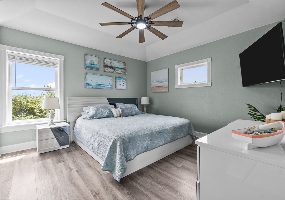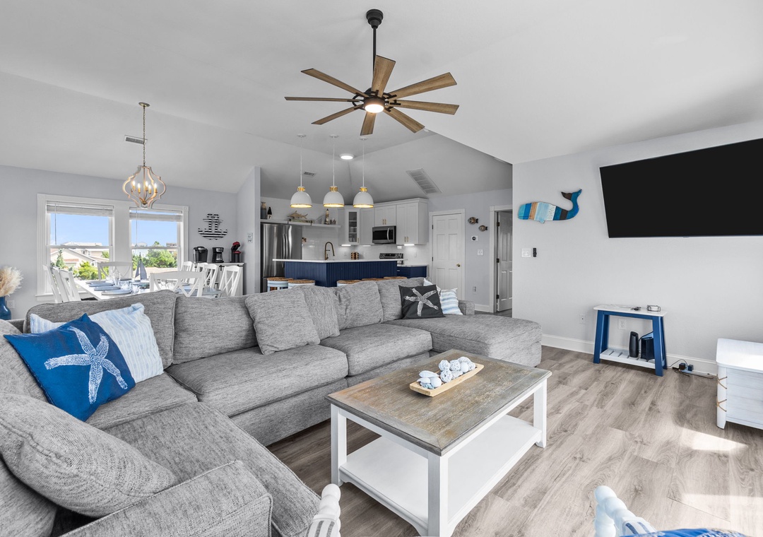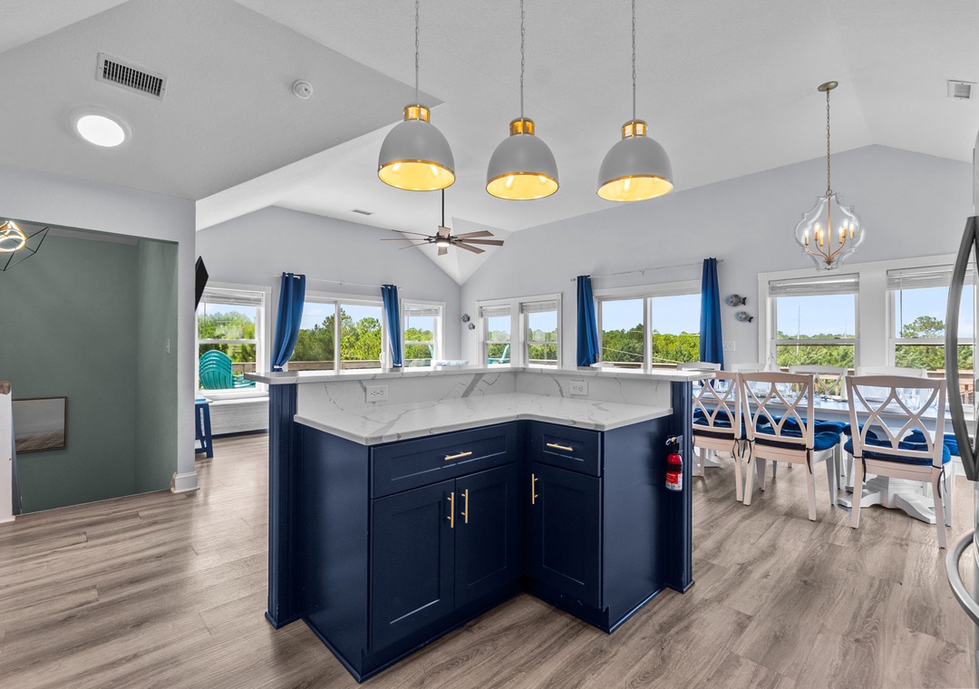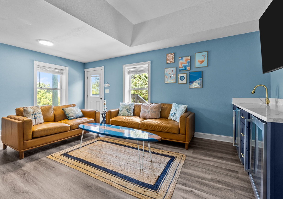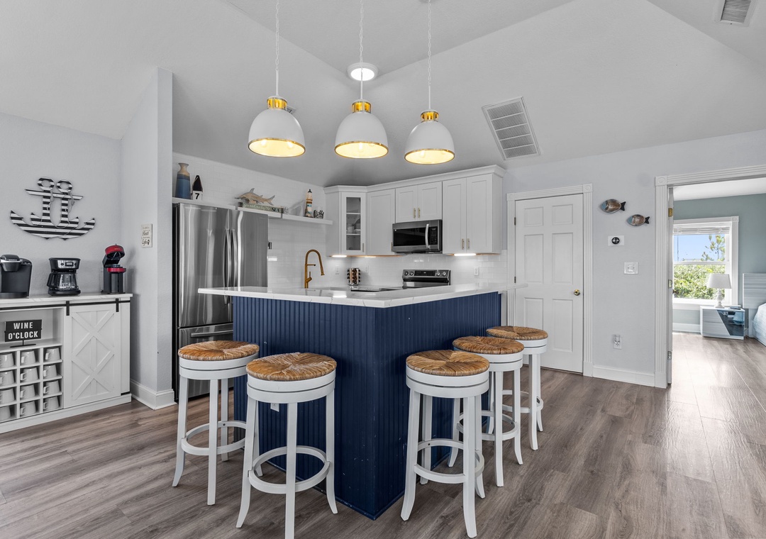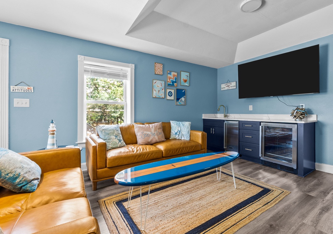 On the top floor, gather in the bright open-concept living, dining, and kitchen area with wraparound seating and a large flat-screen TV. The modern kitchen boasts quartz countertops, shaker cabinets, brass accents, stainless steel appliances, a farmhouse sink, breakfast bar, and a coffee/wine bar. This level also includes the final king ensuite bedroom and a half bath. Step onto the sun deck to enjoy coastal breezes, sunrise coffee, or sunset skies.
