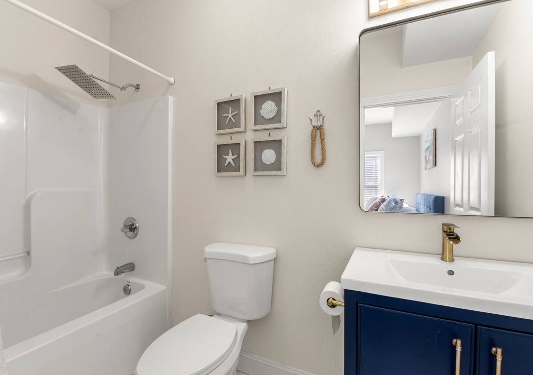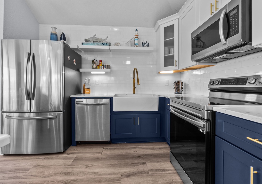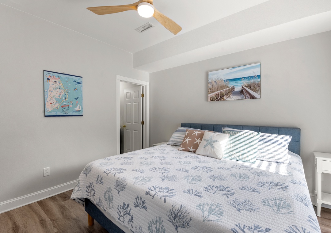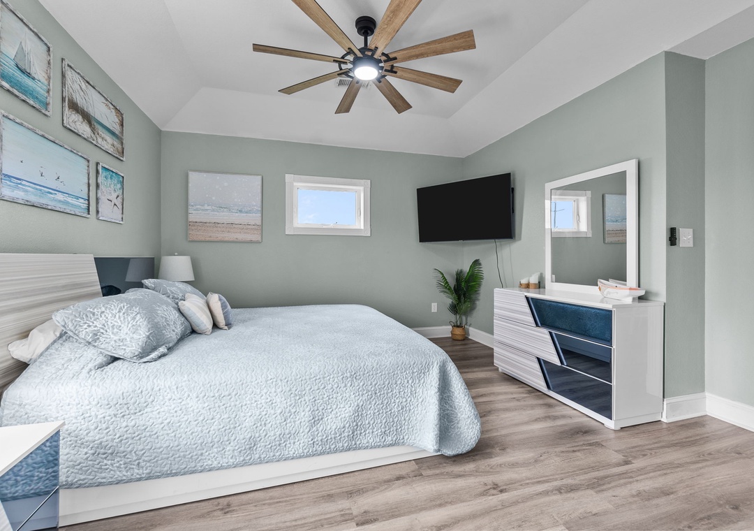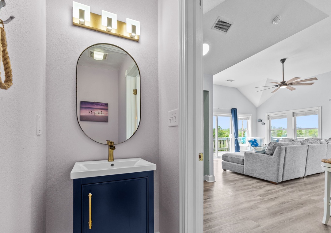 On the top floor, gather in the bright open-concept living, dining, and kitchen area with wraparound seating and a large flat-screen TV. The modern kitchen boasts quartz countertops, shaker cabinets, brass accents, stainless steel appliances, a farmhouse sink, breakfast bar, and a coffee/wine bar. This level also includes the final king ensuite bedroom and a half bath. Step onto the sun deck to enjoy coastal breezes, sunrise coffee, or sunset skies.