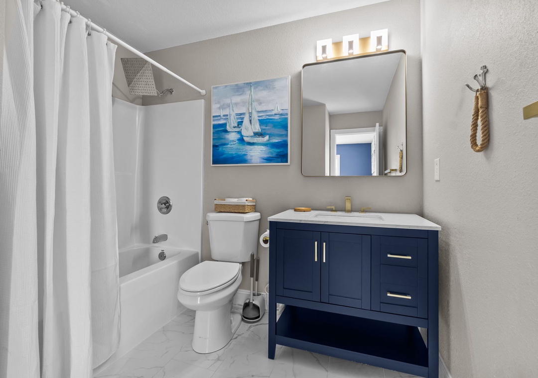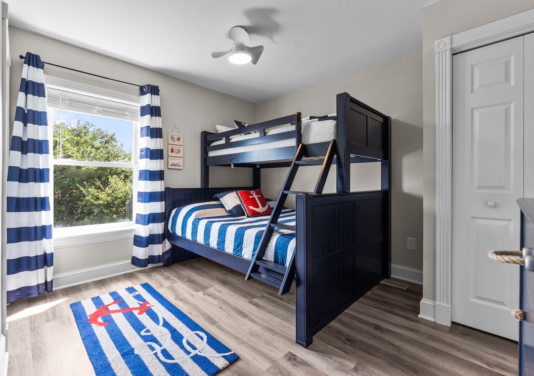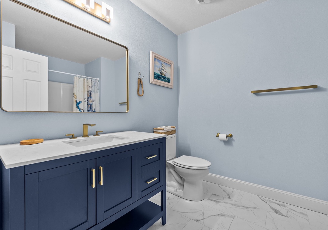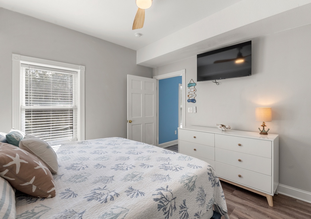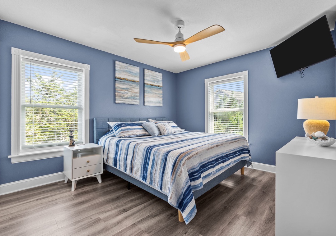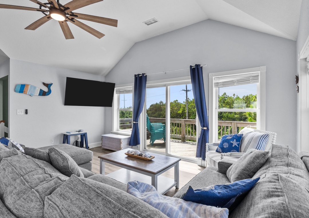 On the top floor, gather in the bright open-concept living, dining, and kitchen area with wraparound seating and a large flat-screen TV. The modern kitchen boasts quartz countertops, shaker cabinets, brass accents, stainless steel appliances, a farmhouse sink, breakfast bar, and a coffee/wine bar. This level also includes the final king ensuite bedroom and a half bath. Step onto the sun deck to enjoy coastal breezes, sunrise coffee, or sunset skies.