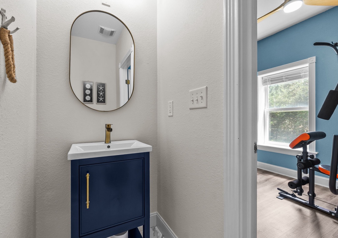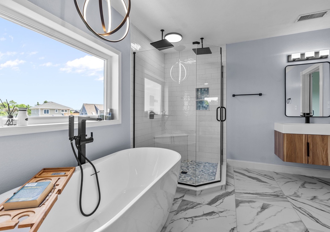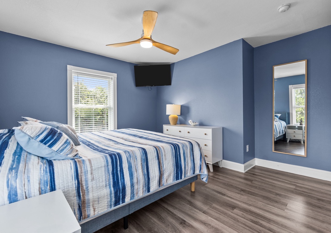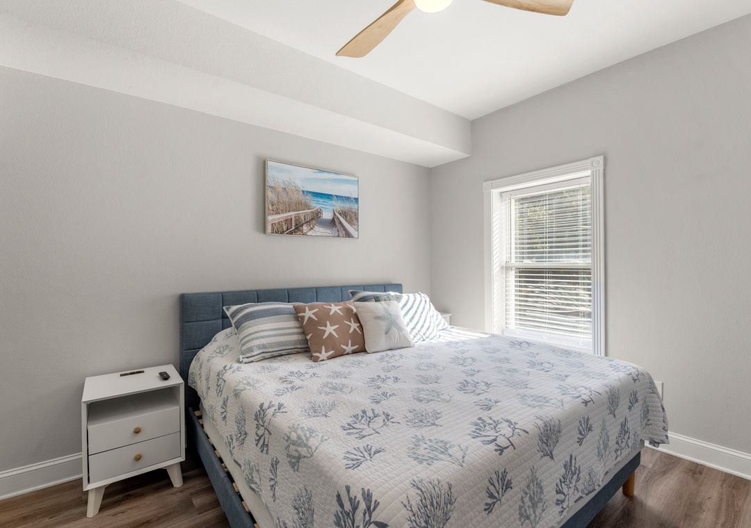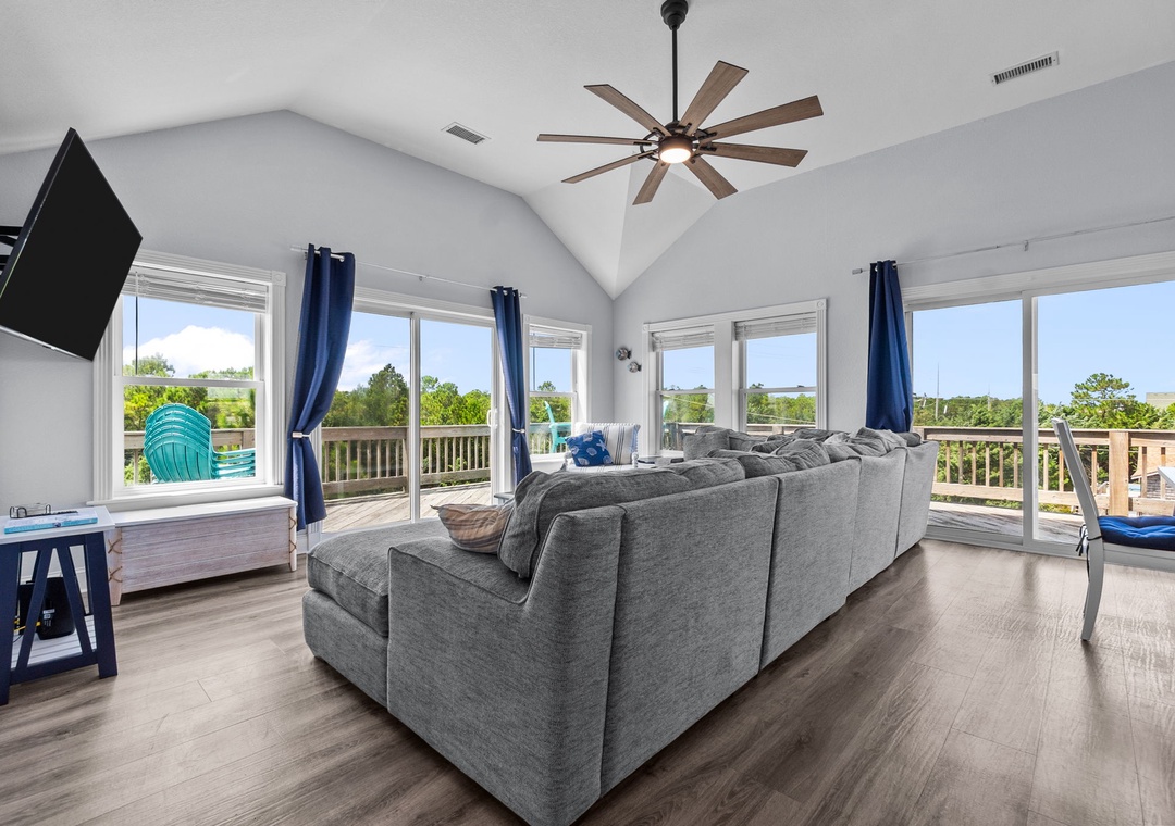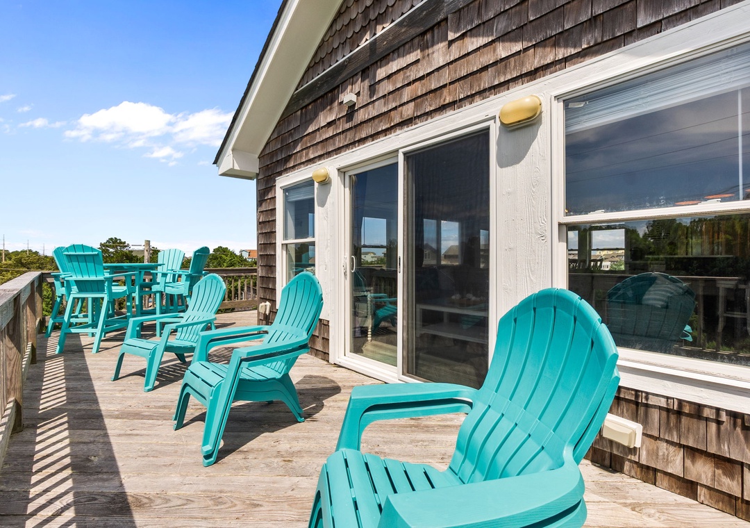 On the top floor, gather in the bright open-concept living, dining, and kitchen area with wraparound seating and a large flat-screen TV. The modern kitchen boasts quartz countertops, shaker cabinets, brass accents, stainless steel appliances, a farmhouse sink, breakfast bar, and a coffee/wine bar. This level also includes the final king ensuite bedroom and a half bath. Step onto the sun deck to enjoy coastal breezes, sunrise coffee, or sunset skies.