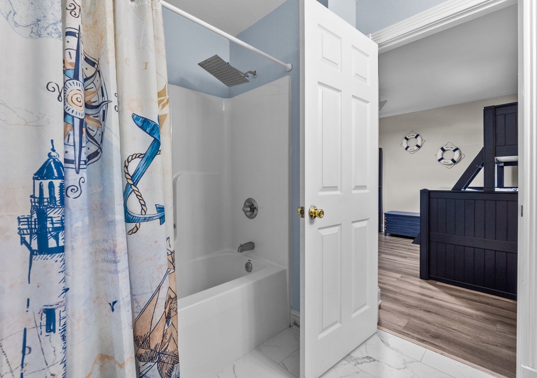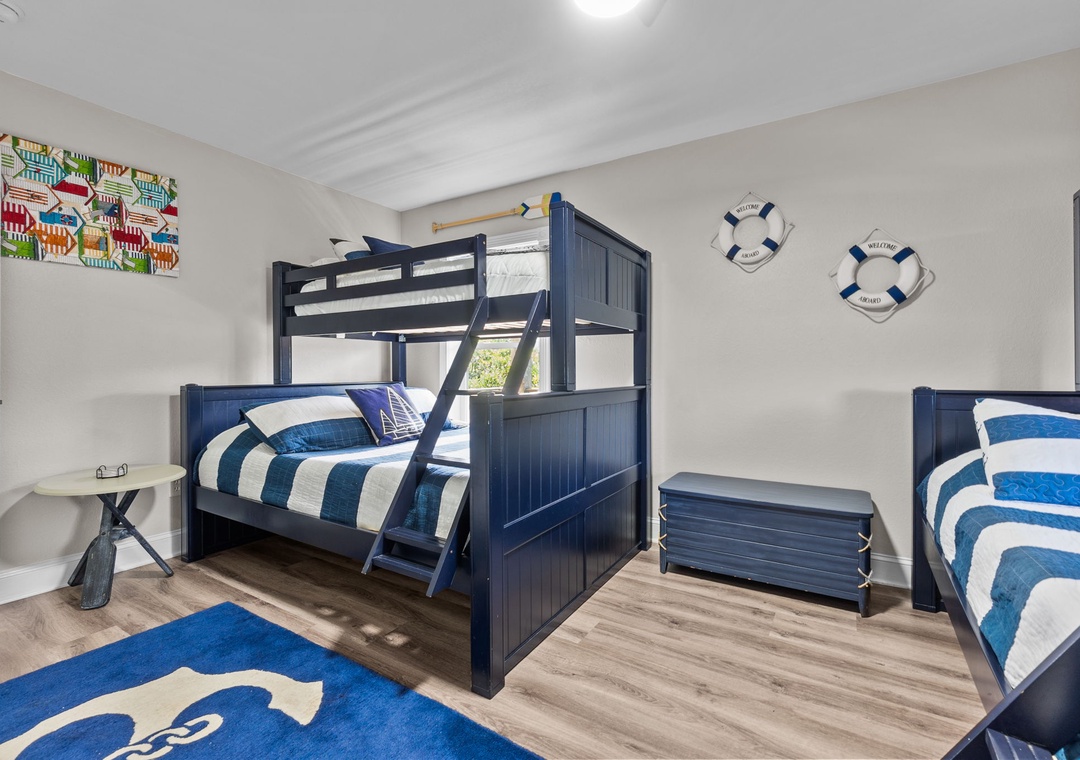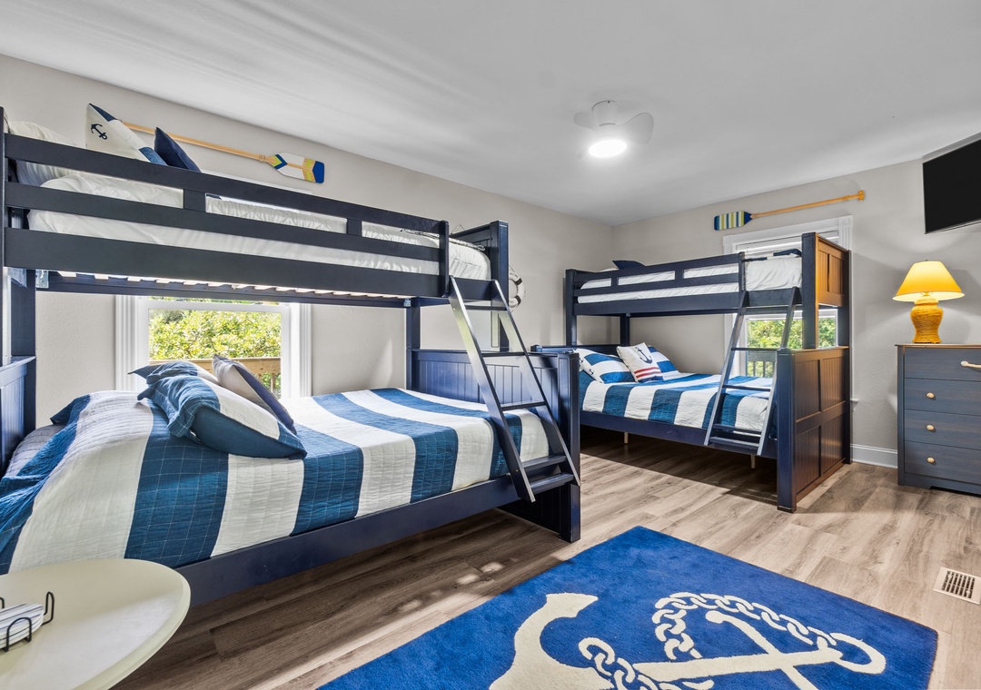 Head up to the middle level, where three additional ensuite bedrooms provide comfort and privacy. You’ll find a king bedroom, a bedroom with one twin-over-full bunk, and another with two twin-over-full bunks. Each room includes a tub/shower combo, TVs, and comfortable furnishings, making this level ideal for families or groups.