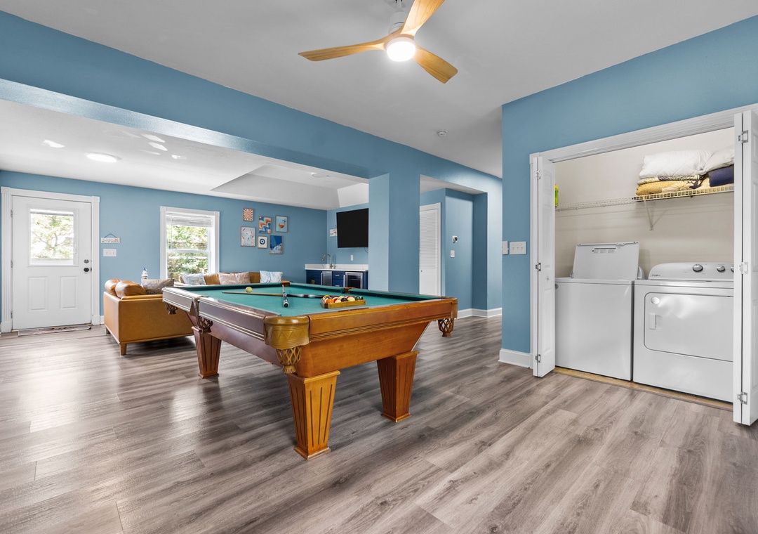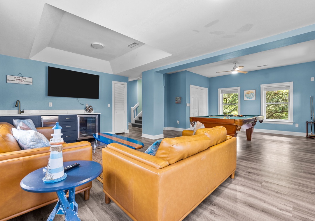 On the ground floor, kick off your stay in the game room featuring a pool table, flat-screen TV, and wet bar with a mini fridge and ice maker, perfect for gathering and easy access to the private pool and hot tub just outside. A cozy seating area with leather sofas makes it a great spot to watch a game, and this level also includes a king ensuite bedroom.