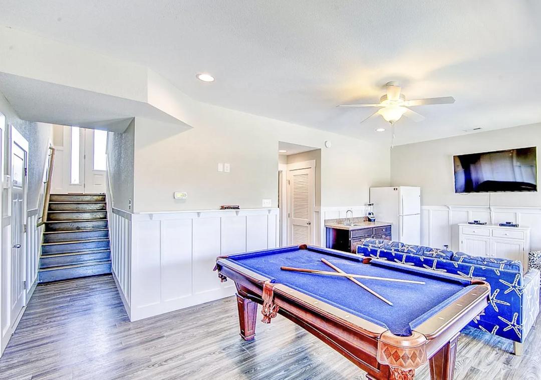 From the moment you arrive at ground level, the home invites relaxation and fun. This floor features a spacious game room complete with a TV and pool table, creating the perfect hangout for all ages. A bedroom with two bunk beds makes this level ideal for kids or extra guests, while a convenient kitchenette and laundry closet add practicality for extended stays. Don't forget to step outside and enjoy the private heated pool and hot tub!