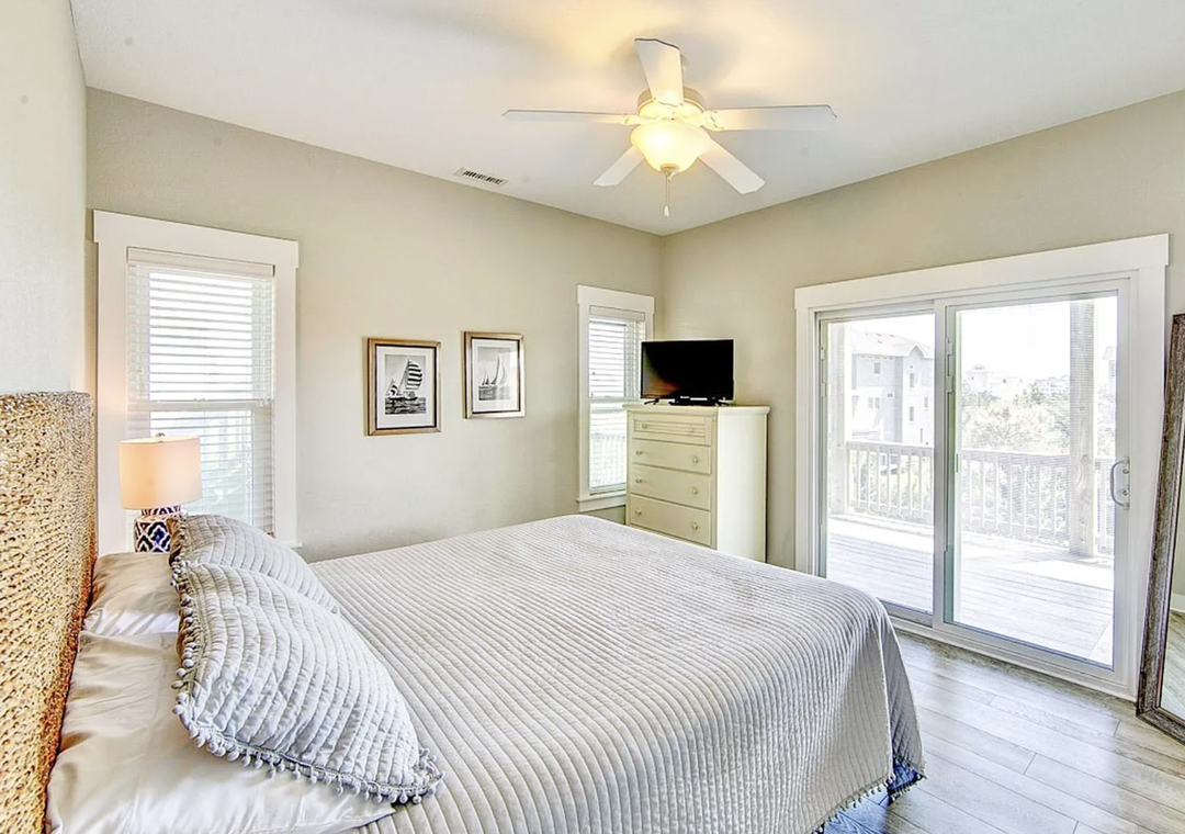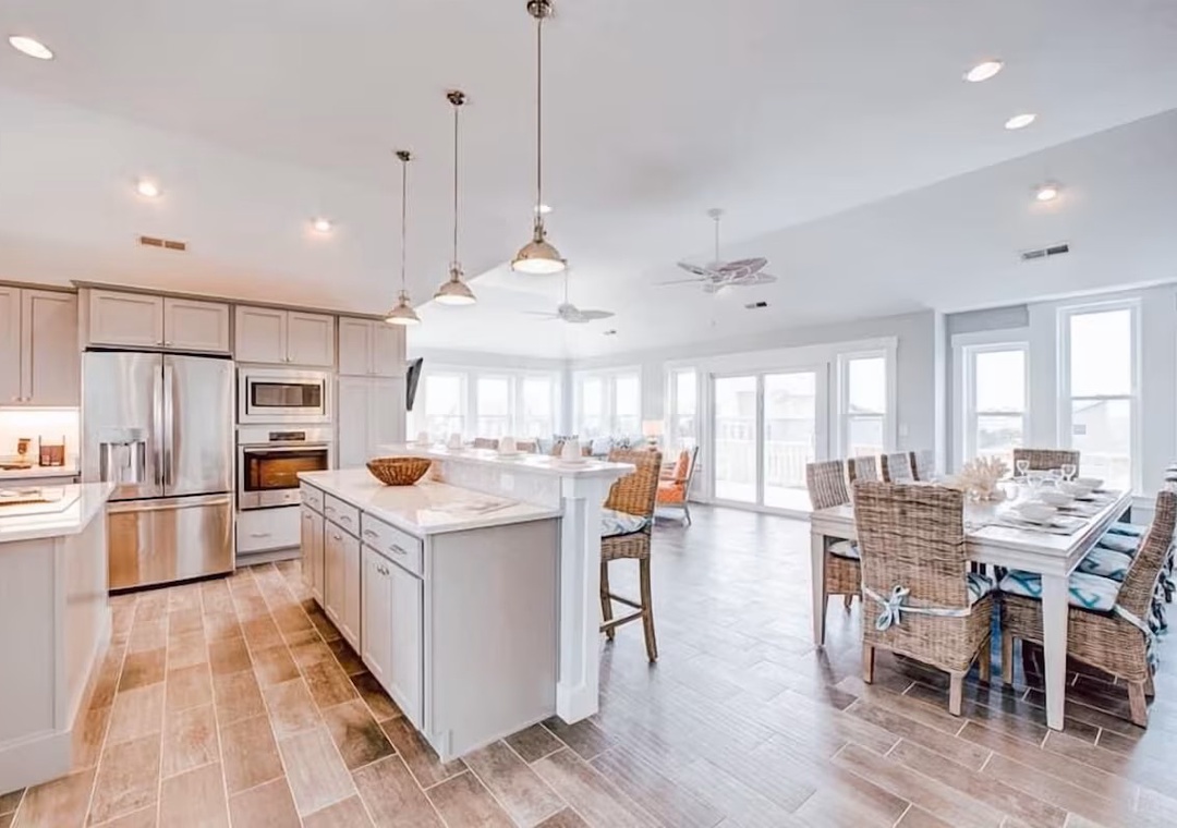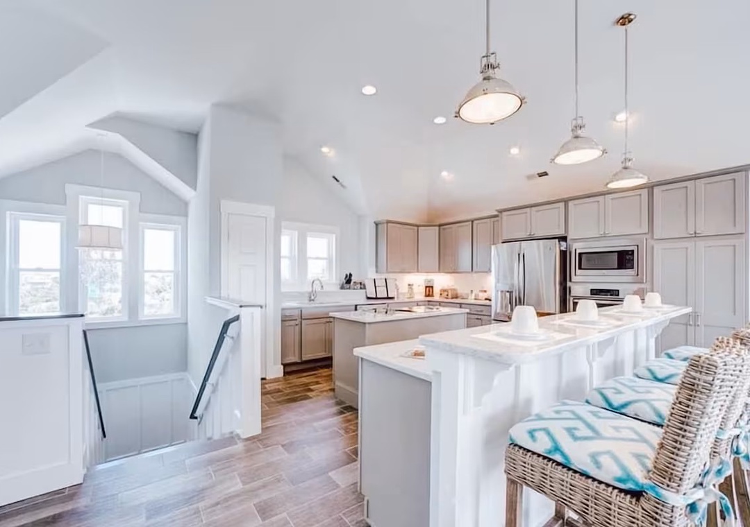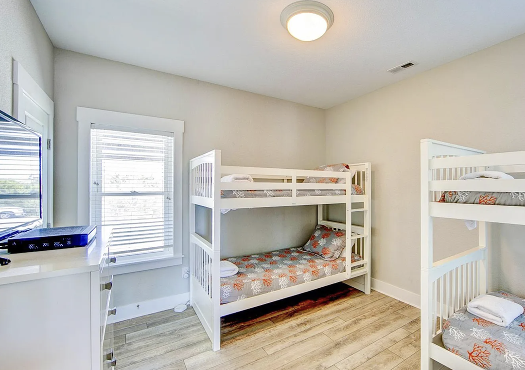 Back inside on the middle level is dedicated to restful accommodations and showcases four beautifully appointed bedrooms, all featuring king beds. Two of these bedrooms offer ensuite baths, while the remaining rooms share a well‑designed jack and jill bathroom. This level blends privacy and functionality, providing a peaceful retreat after a day at the beach while keeping everyone comfortably connected.