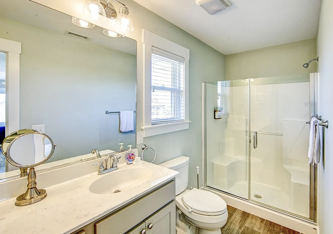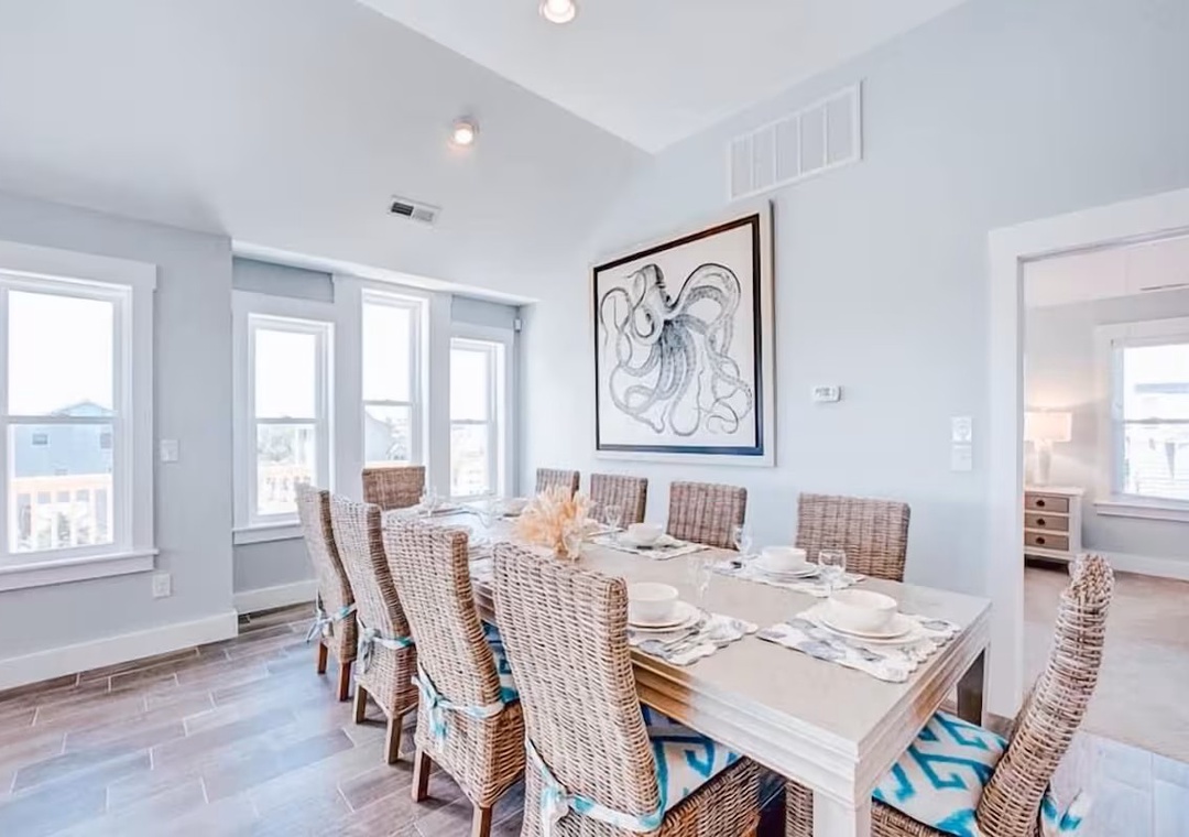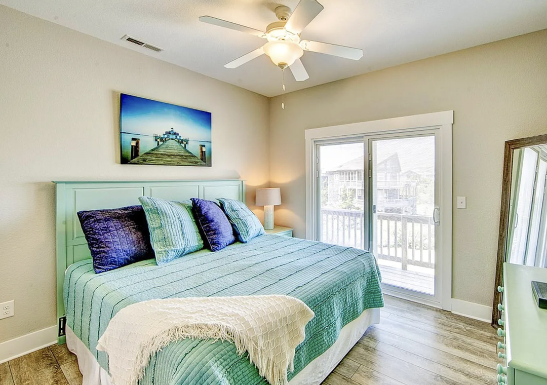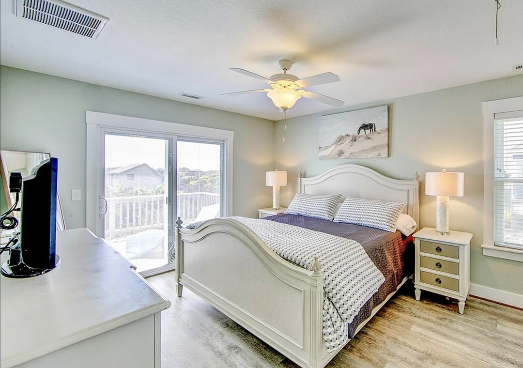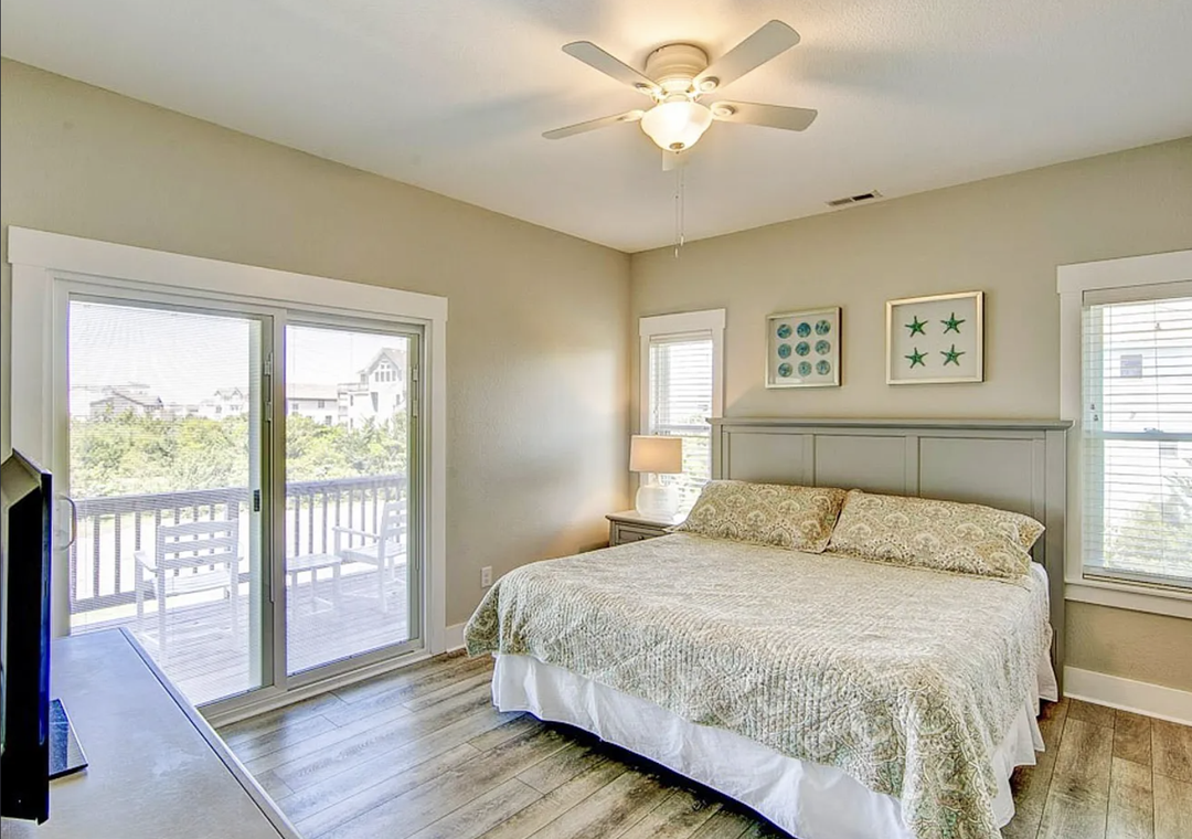 Back inside on the middle level is dedicated to restful accommodations and showcases four beautifully appointed bedrooms, all featuring king beds. Two of these bedrooms offer ensuite baths, while the remaining rooms share a well‑designed jack and jill bathroom. This level blends privacy and functionality, providing a peaceful retreat after a day at the beach while keeping everyone comfortably connected.
