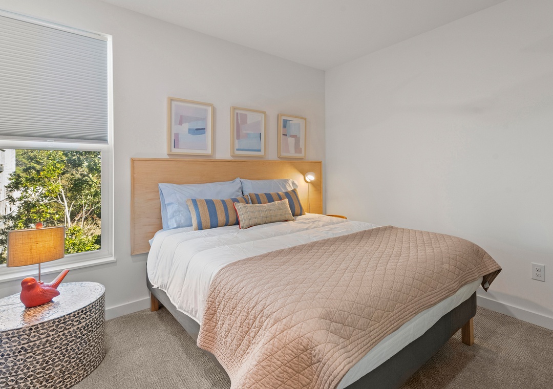 The middle level is dedicated to rest and relaxation, offering three peaceful bedrooms outfitted with brand‑new beds, blackout shades, and drapes to ensure restful sleep. Two modern bathrooms serve this level, with one featuring a bathtub and the other a spacious walk‑in shower, providing comfort and convenience for everyone in your group.