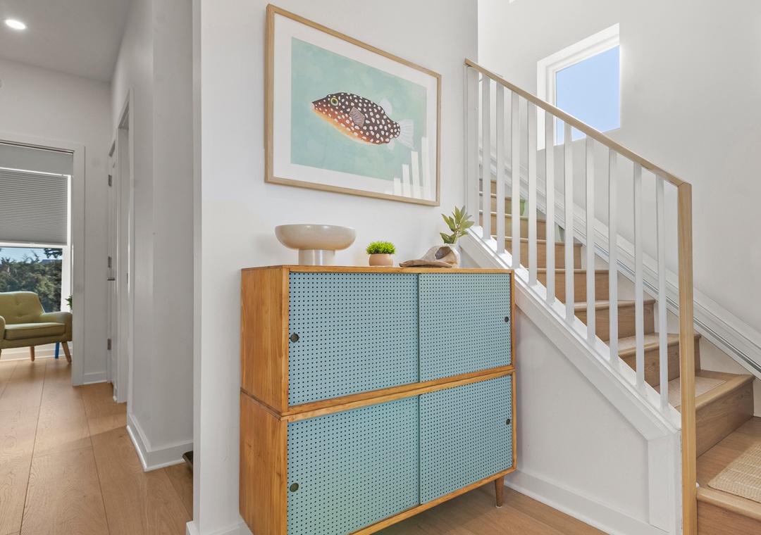Stepping up to this lovely home there is a clean concrete driveway and a spacious shaded area beneath the home that’s perfect for outdoor living. Enjoy evenings soaking in the hot tub, grilling meals on the grill, relaxing at the picnic table, or gathering around the nearby fire pit. Convenient surfboard storage is also available, making it easy to enjoy everything the coast has to offer.