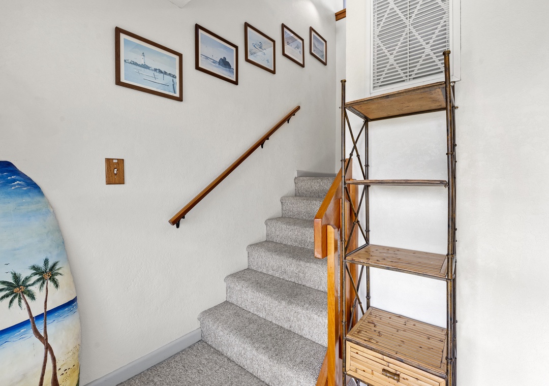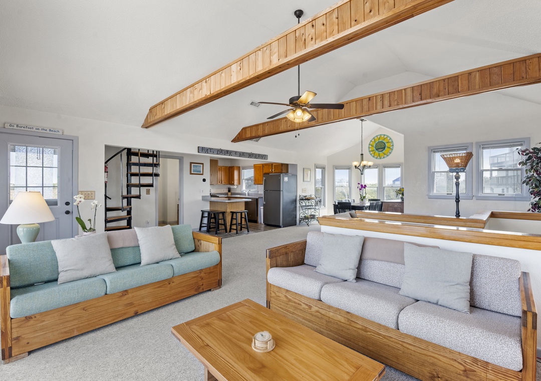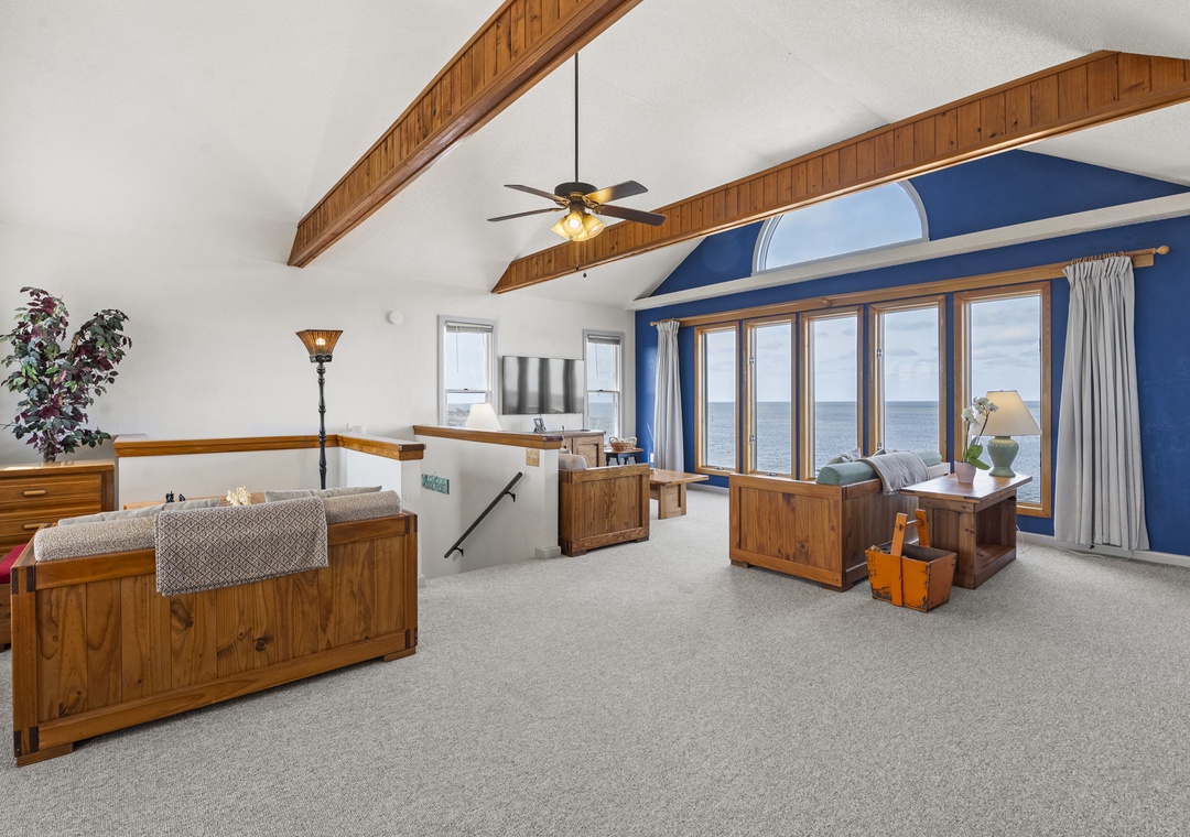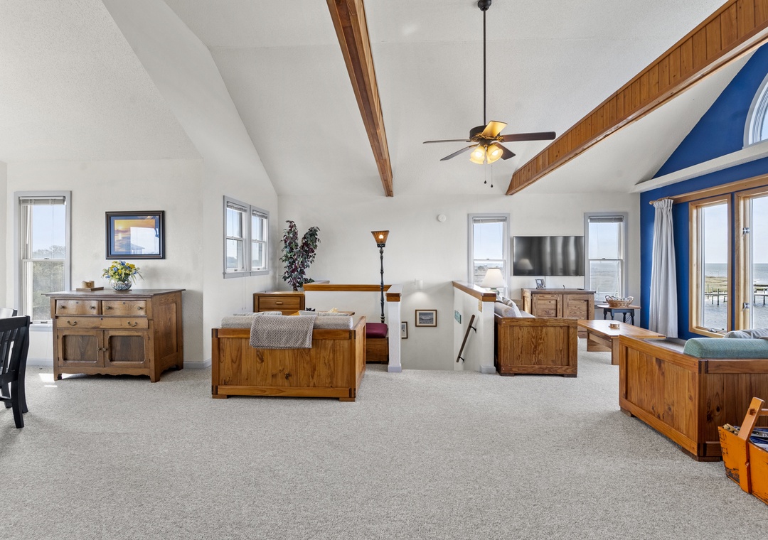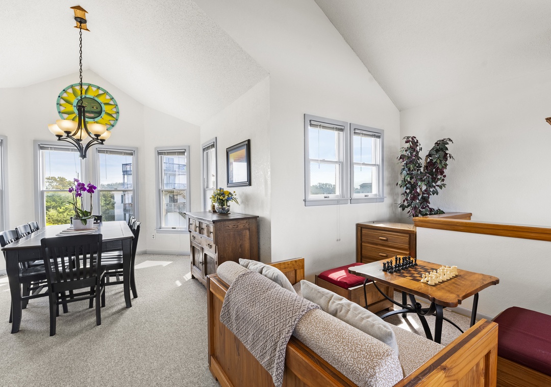 Inside, a reverse floorplan takes full advantage of the location, with the main living area on the top level where everyone can enjoy the panoramic views. There's ample space to entertain in the open-concept great room with comfortable seating, vaulted ceilings, and an abundance of natural light. For an even better view, head up the spiral staircase to the loft and admire the spectacular sunsets from the balcony. All three bedrooms are conveniently located together on the mid-level, including a primary suite that features deck access and a private bath.
