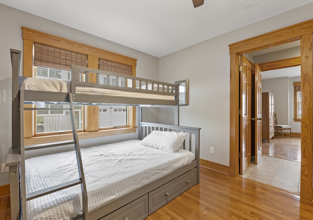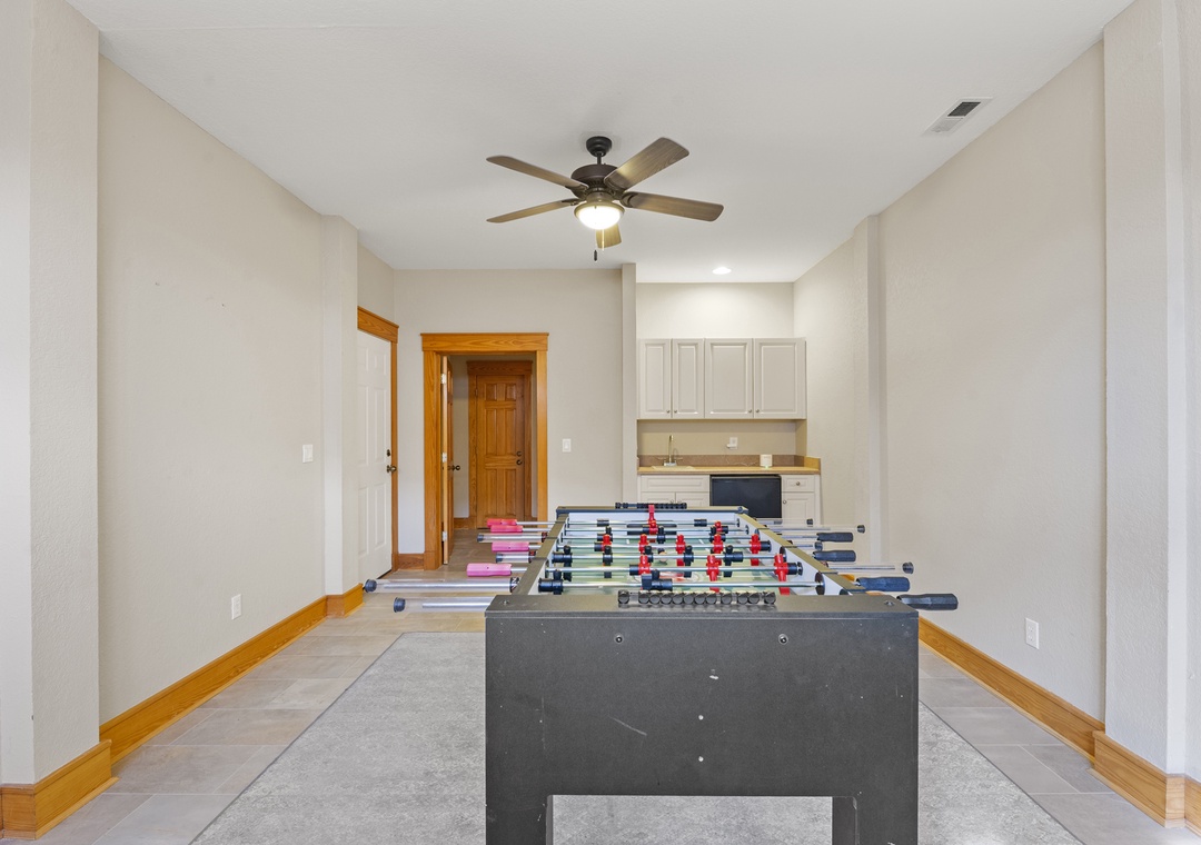 On the top level, enjoy a loft with a game table and TV that doubles as an office with a view, plus two king ensuites with private bathrooms. The mid-level boasts an open-concept living room, a fully equipped kitchen with a breakfast nook, a dining area, and a cozy fireplace. This floor also includes a king bedroom with ensuite bath, a queen bedroom, and a pyramid bunk room that share a full bathroom, along with a convenient half bath. The ground level is designed for fun, featuring a game room with a wet bar, another half bath, and direct access to the outdoor shower and fenced yard.