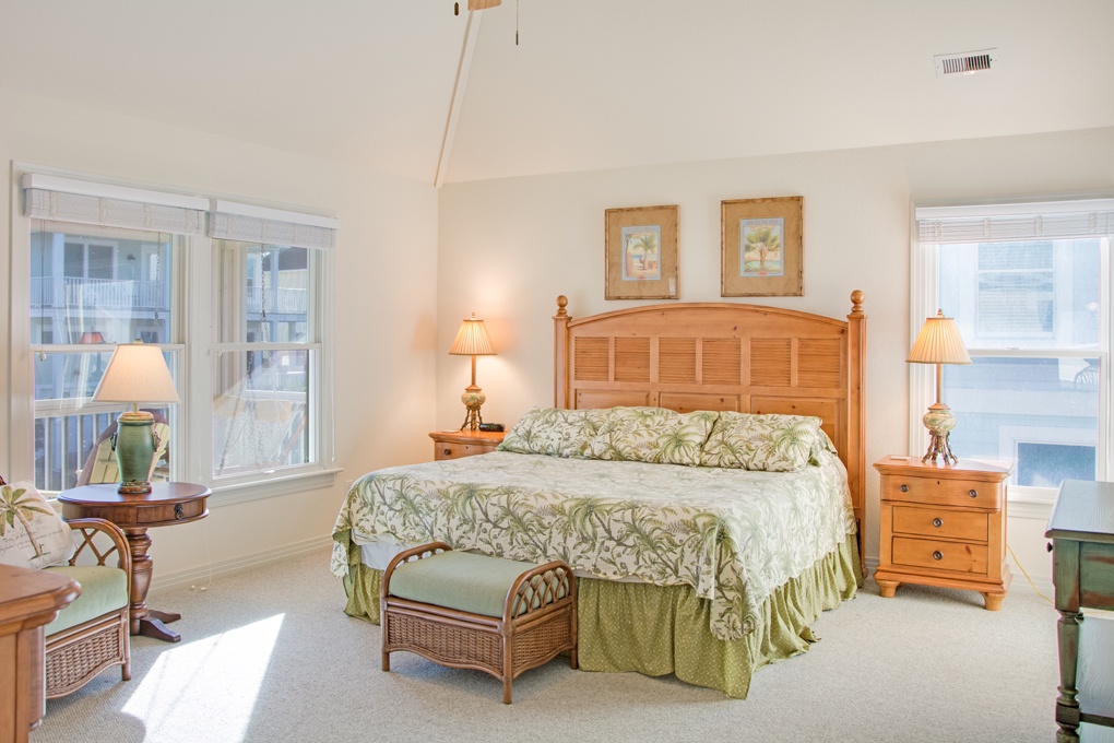 Relax by the 13' x 18' private pool or unwind in the hot tub. The screened porch is a serene spot to take in the surroundings, while two master suites offer tranquil escapes. A garden tub and gas fireplace (off-season use only) add to the home's relaxation atmosphere.