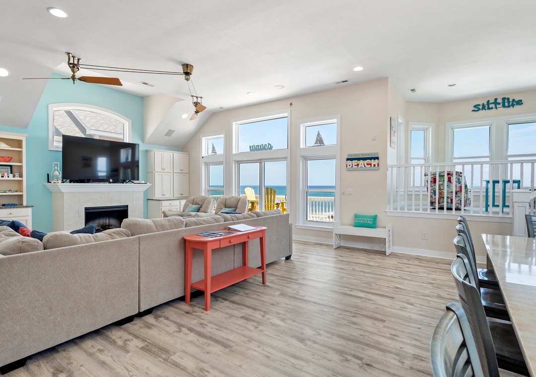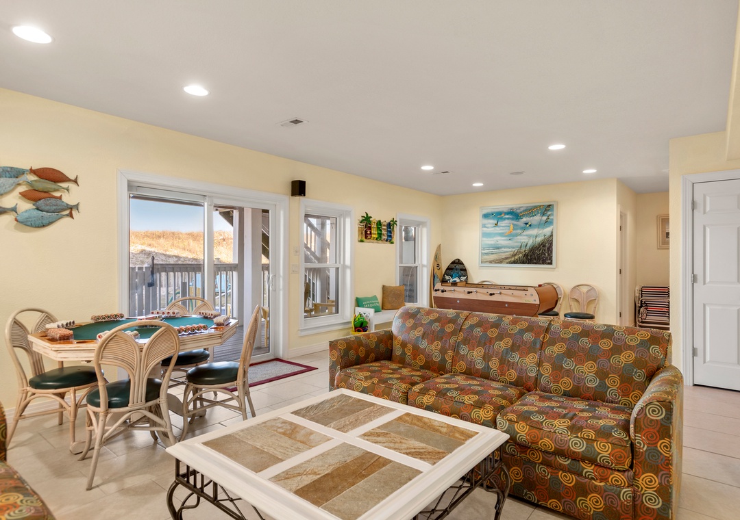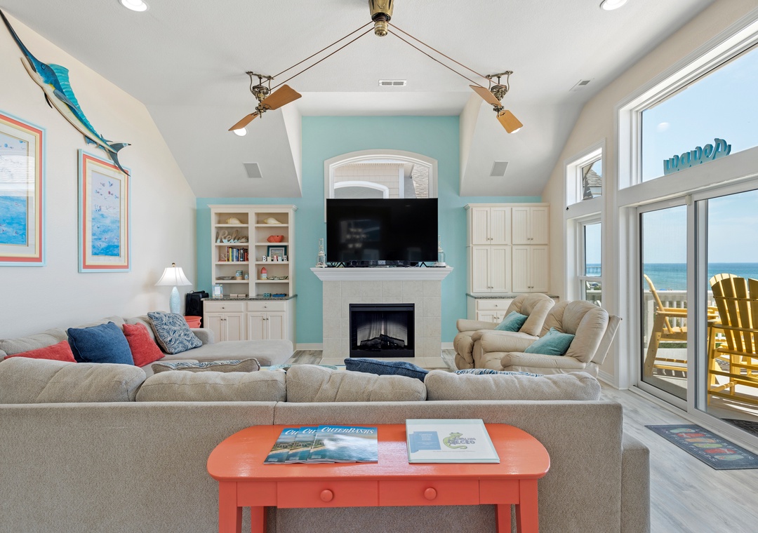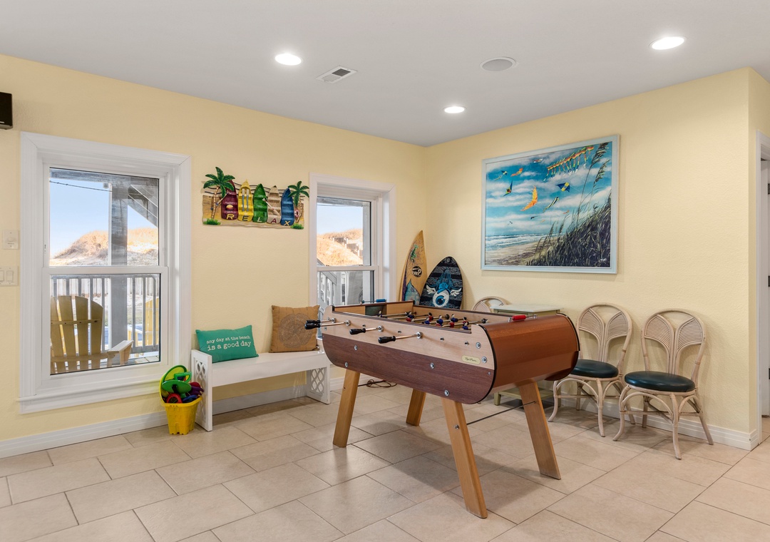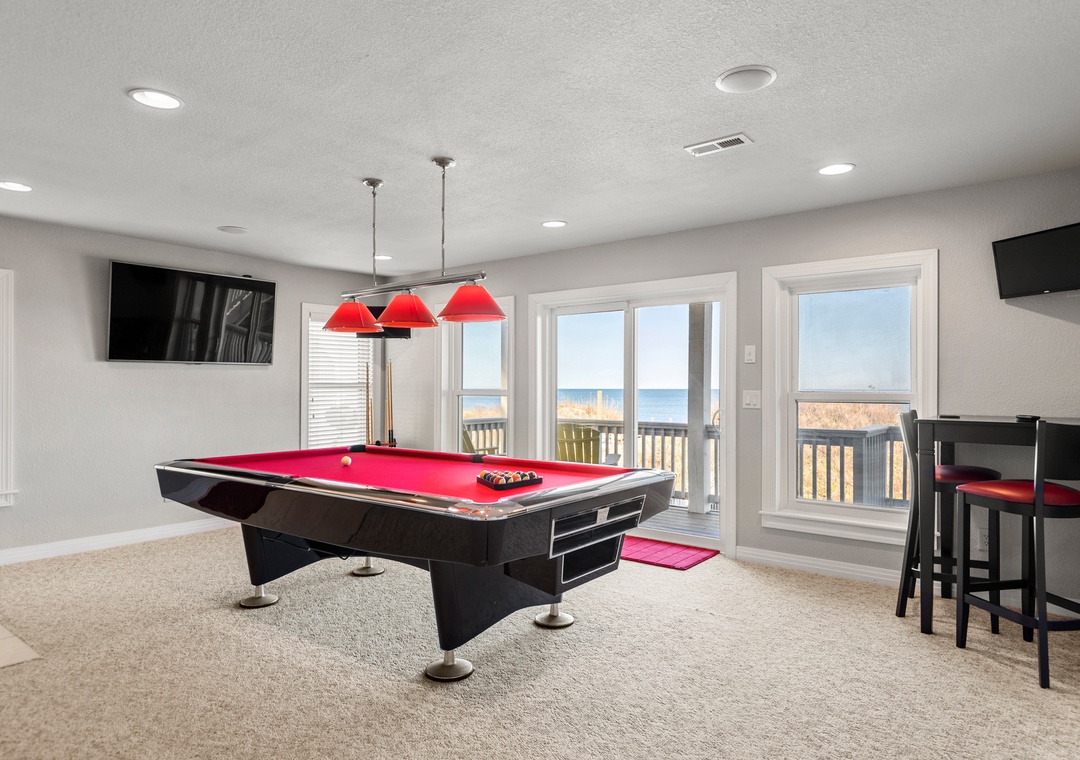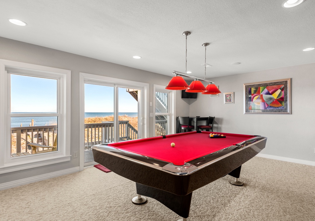 The spacious top-level great room not only offers ample space for family gatherings but also boasts spectacular ocean views that enhance the ambiance. Plus, with a rec room featuring a pool table and foosball, there’s plenty of entertainment for everyone.