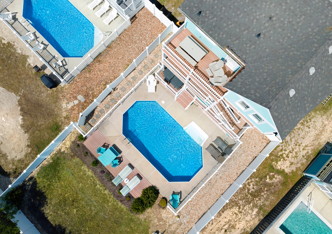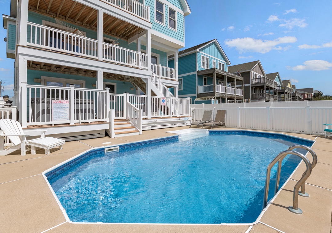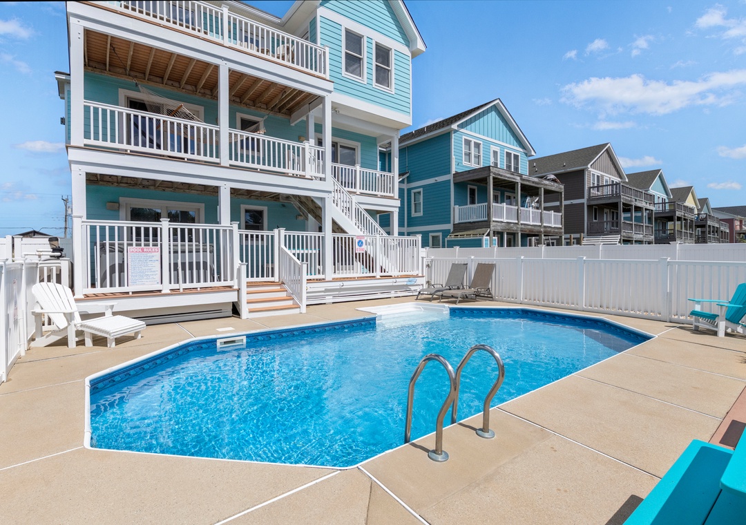 Enjoy stunning views of the Atlantic Ocean's wide rugged beaches and Jockey's Ridge from this 5-bedroom Outer Banks beach home in Nags Head! After a long day at the beach, relax by the private inground 14' x 28' swimming pool with outdoor speakers, hot tub, multi-level decks, outdoor shower, and charcoal grill. This spacious home also features a jetted tub, rec room with billiards table, TVs, DVD players and 2 refrigerators.