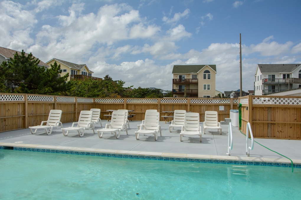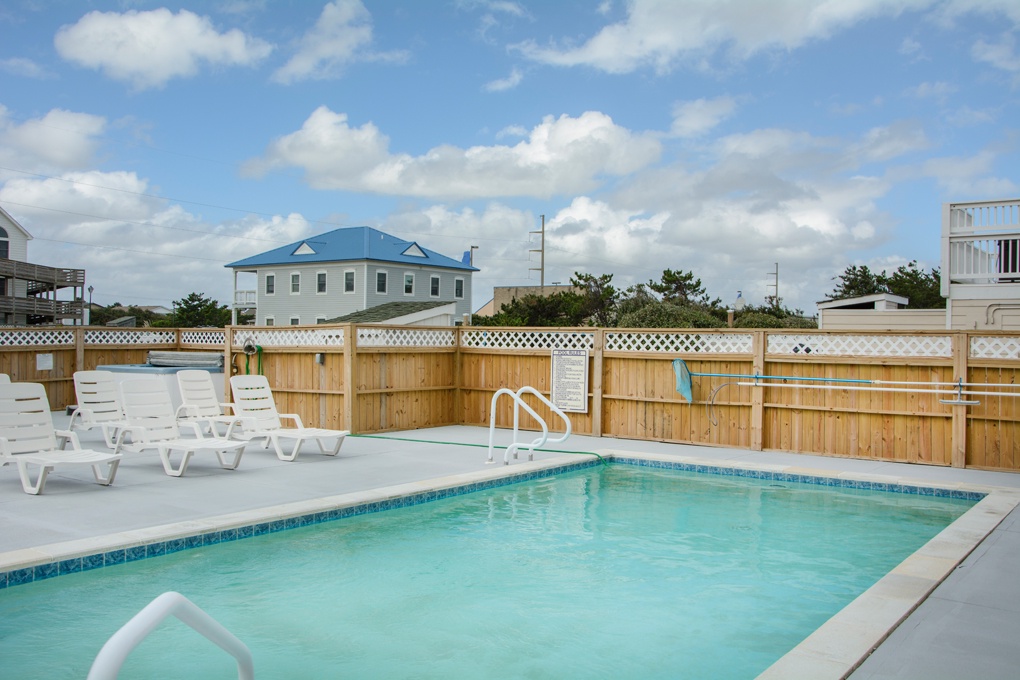 This pet friendly Nags Head home fronts the beach road and features a 14' x 28' private pool, hot tub and jetted tub. There are TVs, DVD players, Blu-Ray player, WiFi, 2 refrigerators, high chair, rec room with pool table, and wet bar. Outside amenities: charcoal grill, outside shower.