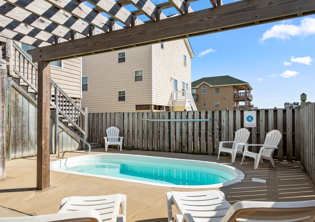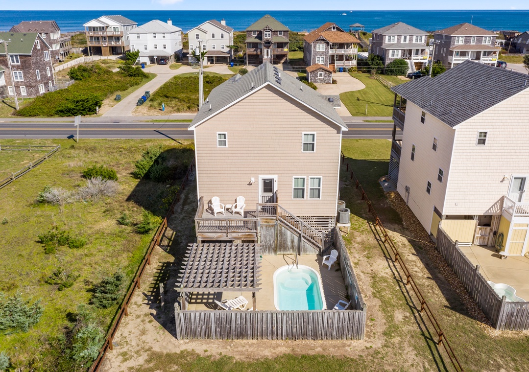 This vacation home in the Outer Banks features four bedrooms and is located on Beach Road in Nags Head. Enjoy a private pool measuring 16' x 8 1/2', a hot tub, and various entertainment options including TVs and DVD players. The recreation room is equipped with a mini-refrigerator, foosball, air hockey, and a futon, while outdoor amenities include an outside shower and a charcoal grill. You can also relish pleasant ocean views!