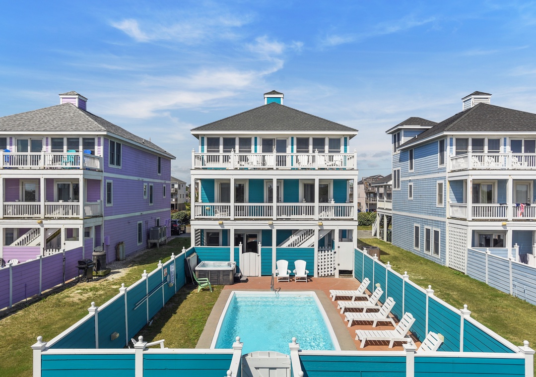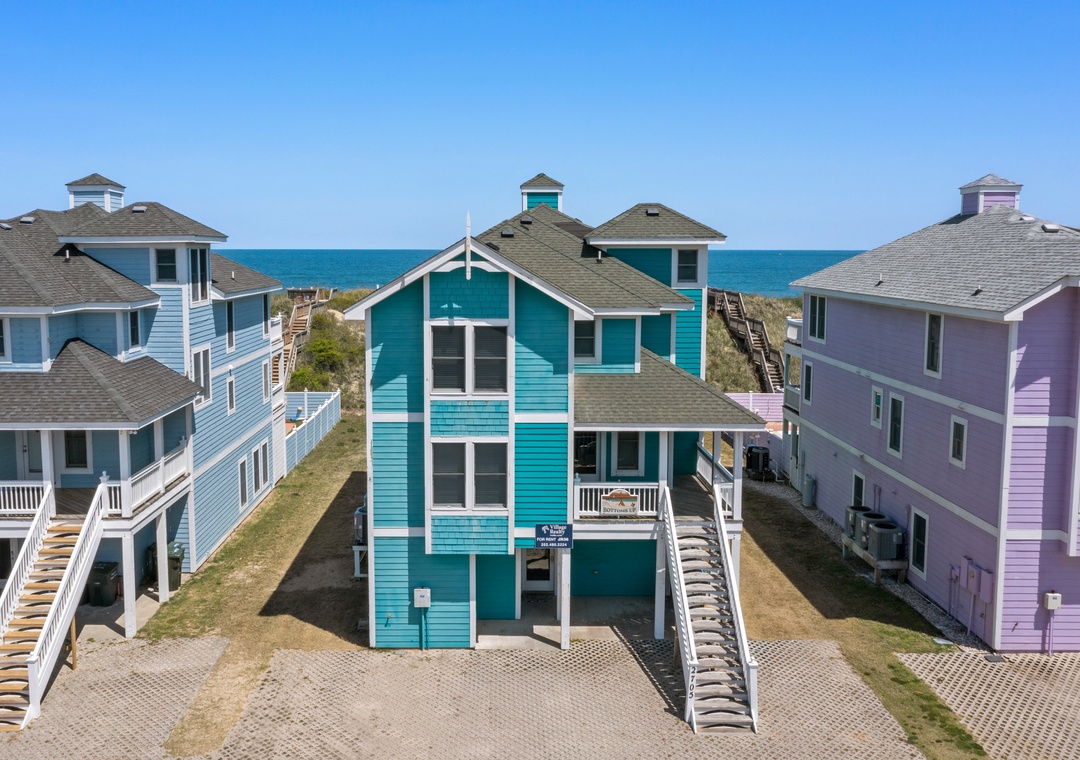 Bottoms Up boasts 8 bedrooms (6 generously sized masters!), each with a flat screen TV. 3 of the masters (including the disability accessible bedroom) face the ocean and have direct deck access. The ground level offers a rec room with pool table, wet bar, full size refrigerator/freezer, microwave, TV, DVD player, and access to the pool area and charcoal grill. The top level features a king master bedroom with a private bath and jetted tub. Also on the top level is a large, but cozy living area with a TV, Blu-Ray DVD player, a gas fireplace, dining area with seating for 16, a well-appointed kitchen with bar seating for 5, and a loft with a desk. No need to carry your groceries or luggage up the steps, use the elevator that goes to all floors! If you need to stay connected WiFi is provided.