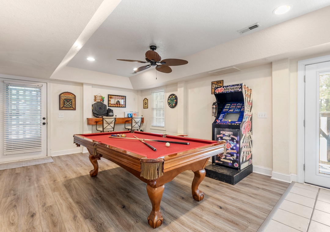 Stepping down to the ground level is where the entertainment truly begins! The rec room is perfect for challenging friends and family to a game of ping pong or gathering around the card table, arcade games or dart board for some friendly competition. The theatre room, ideal for all ages, offers a cozy space for movie nights with comfortable seating and a large screen.