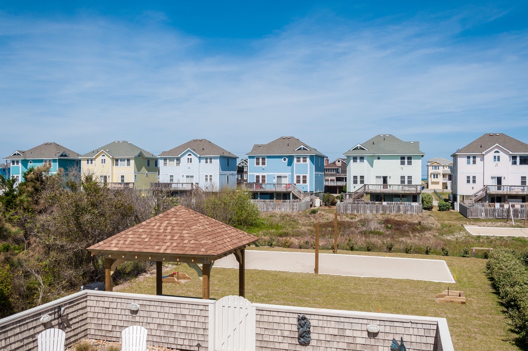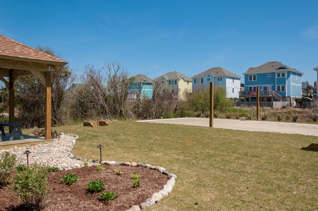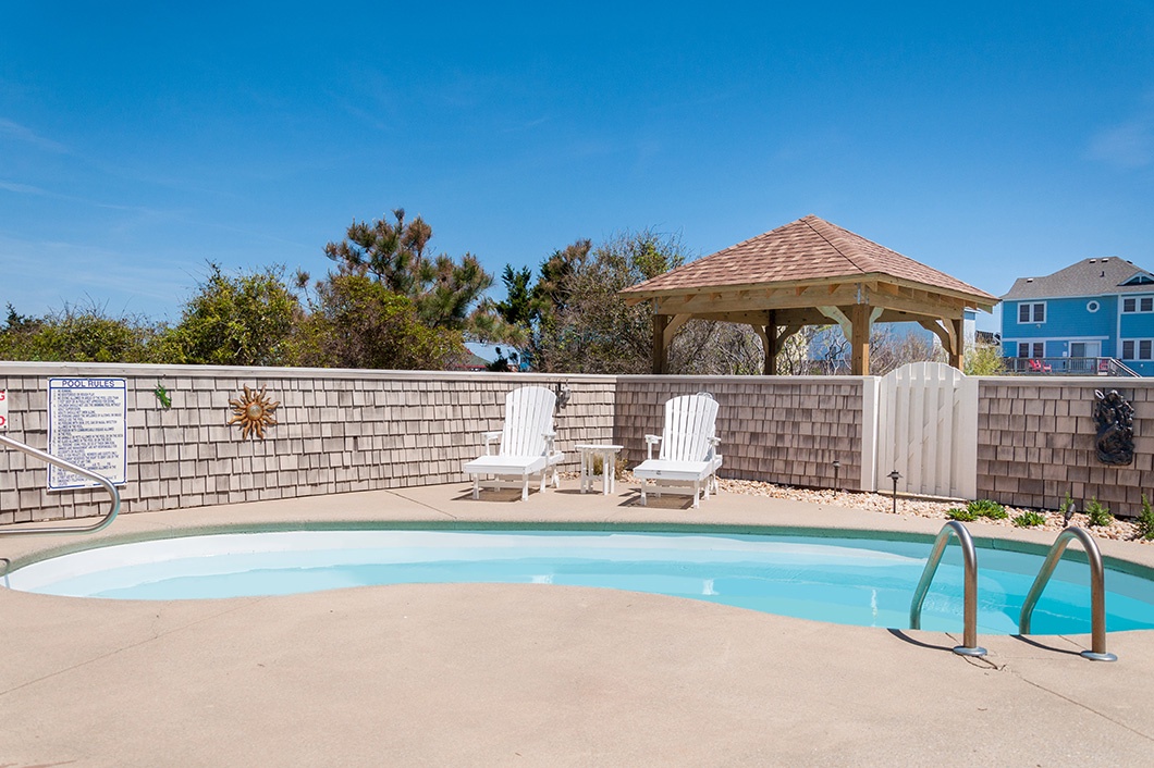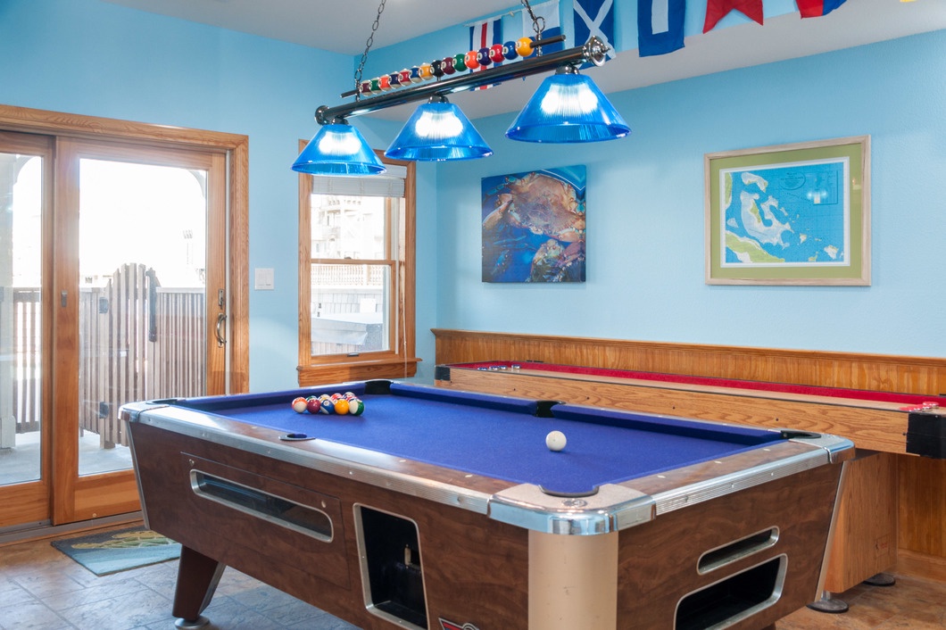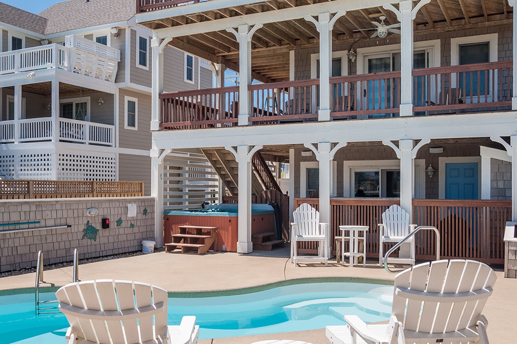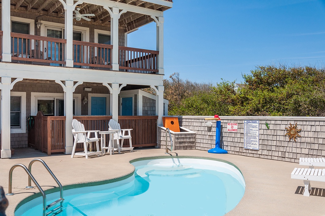 The beach access is only 300 yards away. Located in Nags Head, featuring a private 22' x 10' pool, hot tub, four master suites including one with a jetted tub, rec room, loft, TVs, DVD players, and WiFi. The rec room is ready for action with a pool table, professional tabletop shuffleboard. The game room and mid-level have mini-fridges ready to hold plenty of cold beverages. Get away in the loft to enjoy a morning paper and coffee or in the evenings for a lively card game. Outdoor recreation includes a sand volleyball court and horseshoe pit.