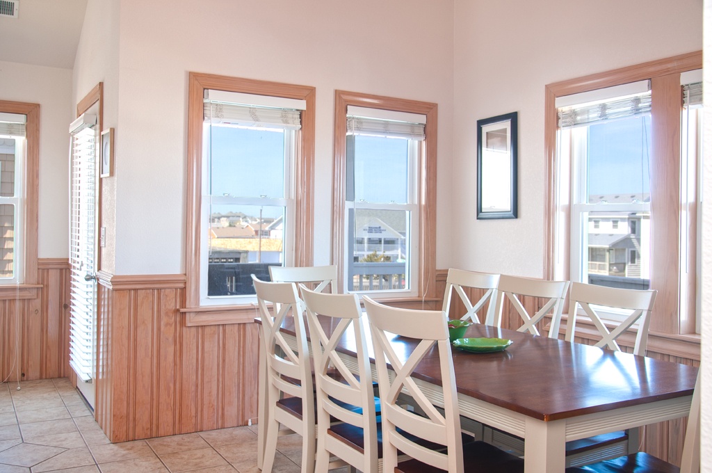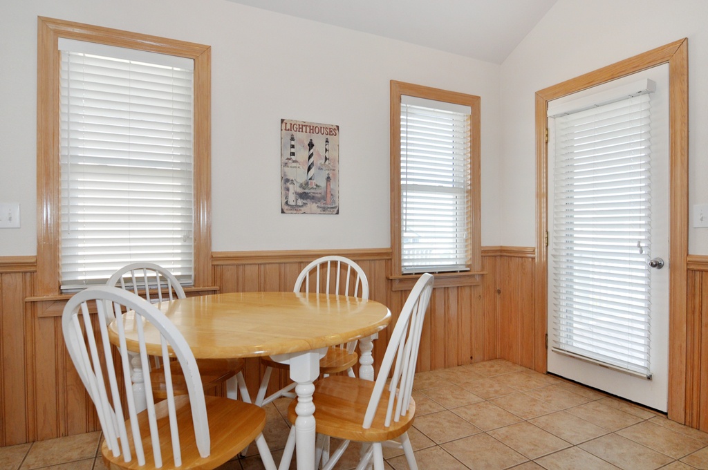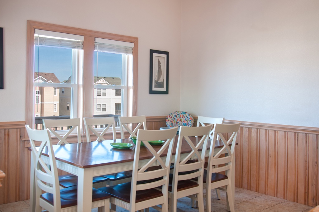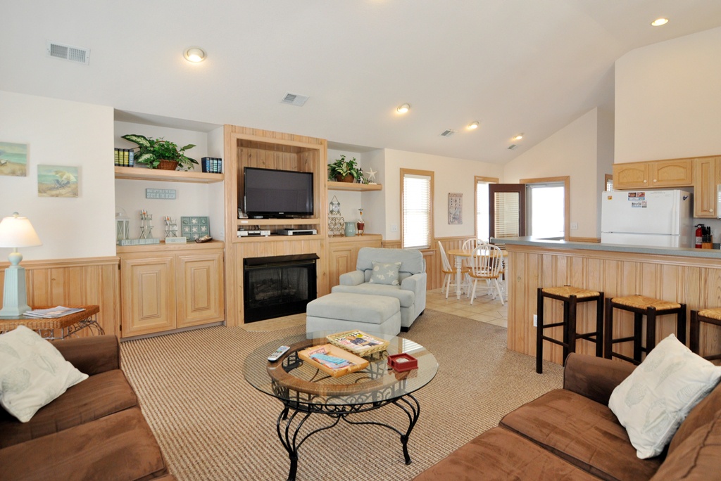 The great room level at Sweet Home Carolina offers a large dining area on one side of the eat-in kitchen and a relaxing TV/living area on the opposite side.
