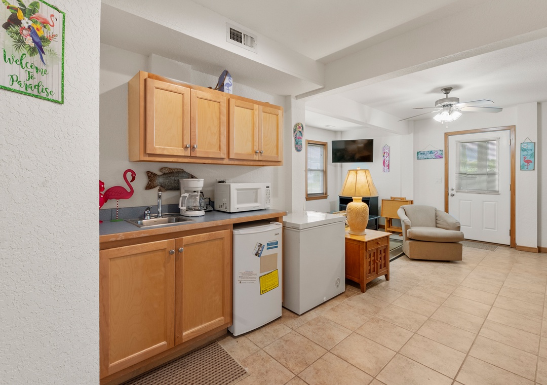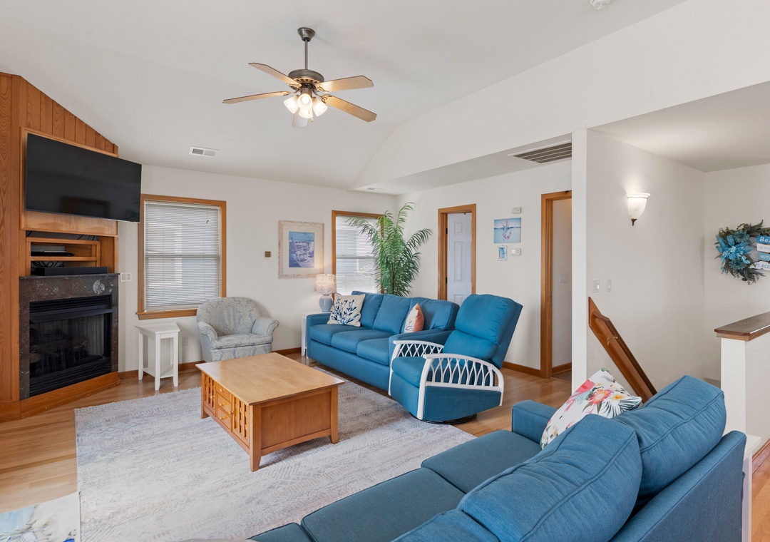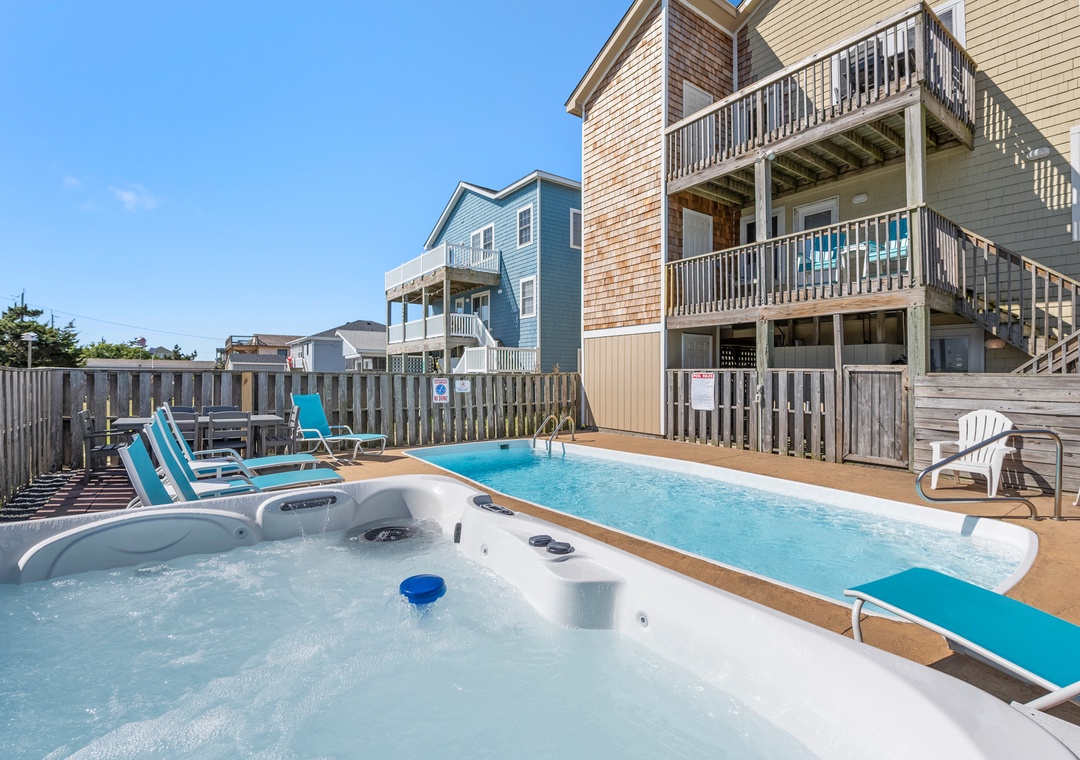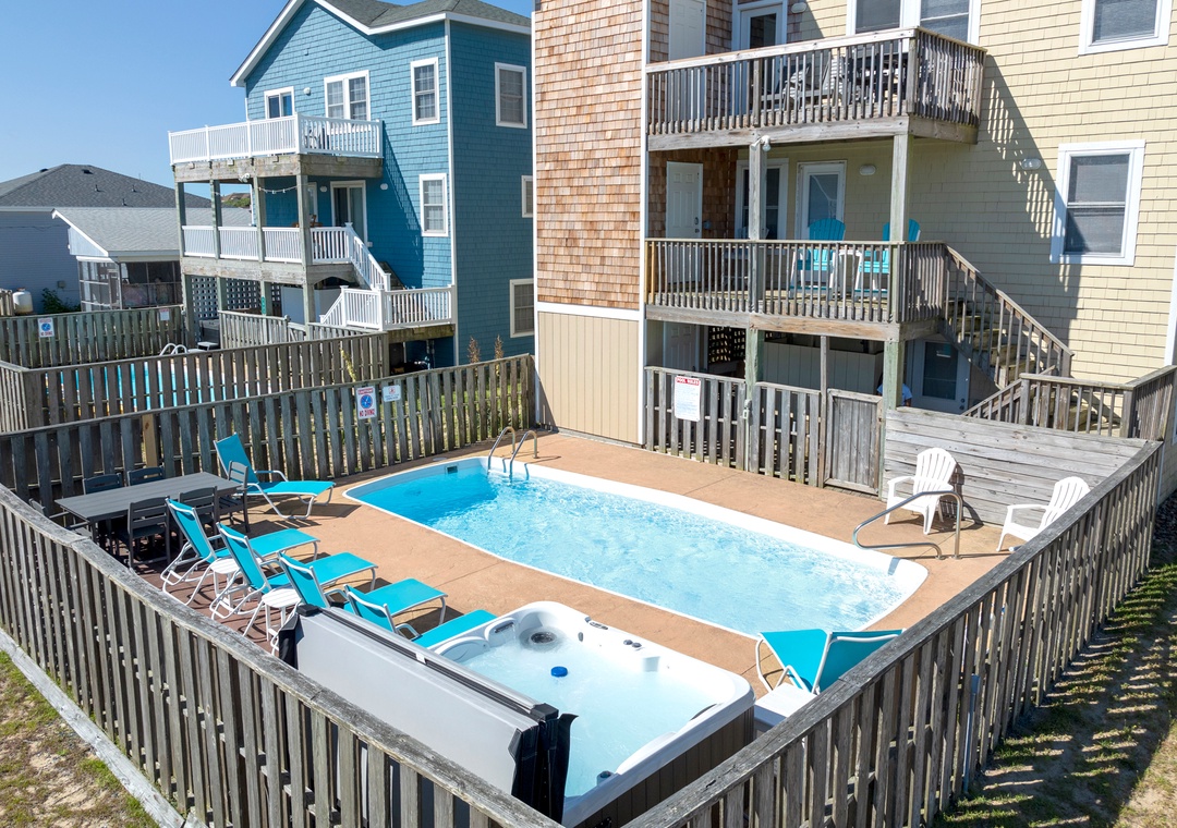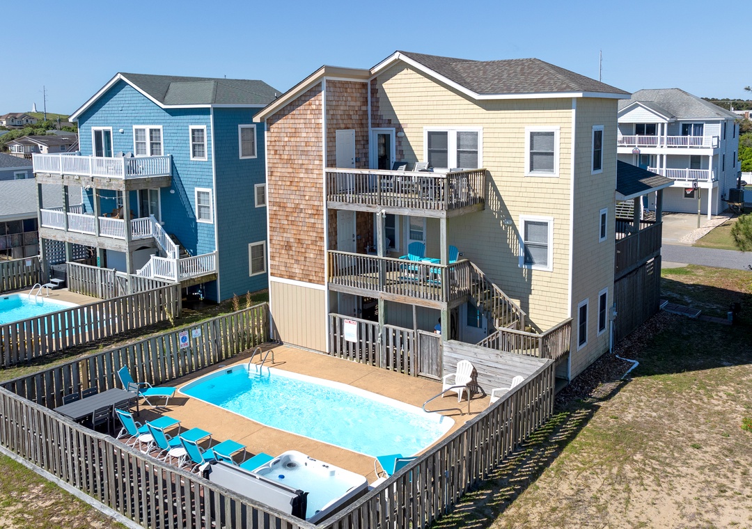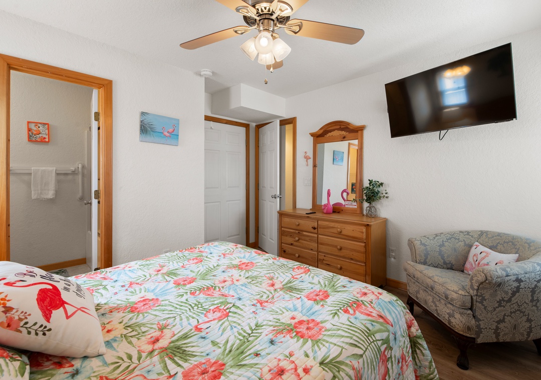 After a day at the beach, the outdoor fun can continue back at the house with a 26' x 12' private pool and bubbly hot tub. Inside, gather in the comfortably furnished great room where you can kick back, relax and watch TV. A gas fireplace is available during the off-season for staying cozy on cooler Spring and Fall evenings. You'll love the open-concept layout - ideal for spending quality time with family and friends, even while preparing meals in the fully stocked kitchen. The living area leads out to a sun deck that overlooks the pool area below. All four bedrooms include ensuite baths for plenty of privacy. Downstairs, a den on the ground level can serve as an additional living area or kid's hangout space. It includes a wet bar with mini fridge, perfect for grabbing a convenient drink or snack to enjoy poolside. Flamingo Nest is equipped with an elevator that goes from the ground level to the mid and top floors. It's ideal for guests with mobility issues or for sending luggage and groceries up and down during check-in and check-out.