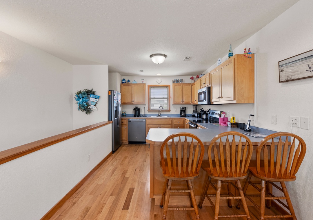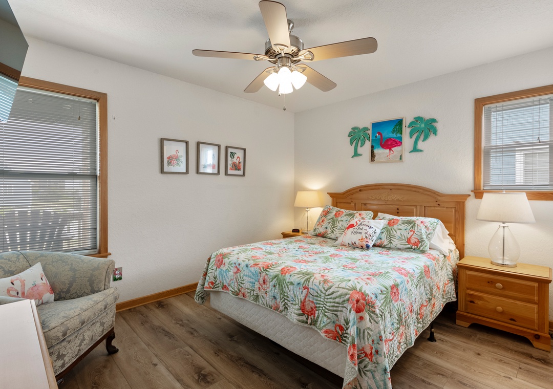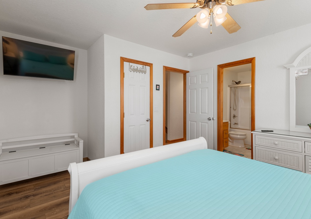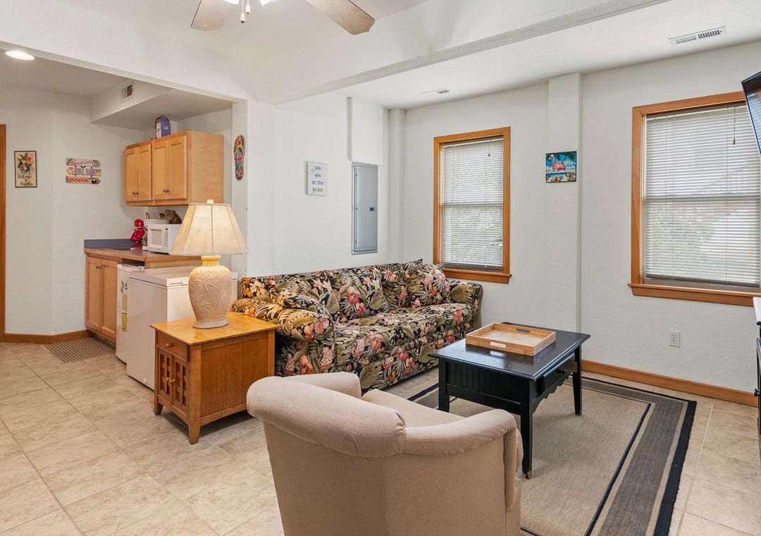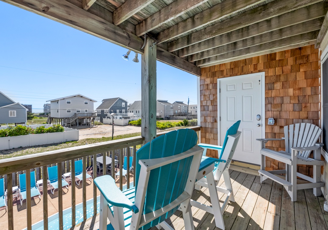 After a day at the beach, the outdoor fun can continue back at the house with a 26' x 12' private pool and bubbly hot tub. Inside, gather in the comfortably furnished great room where you can kick back, relax and watch TV. A gas fireplace is available during the off-season for staying cozy on cooler Spring and Fall evenings. You'll love the open-concept layout - ideal for spending quality time with family and friends, even while preparing meals in the fully stocked kitchen. The living area leads out to a sun deck that overlooks the pool area below. All four bedrooms include ensuite baths for plenty of privacy. Downstairs, a den on the ground level can serve as an additional living area or kid's hangout space. It includes a wet bar with mini fridge, perfect for grabbing a convenient drink or snack to enjoy poolside. Flamingo Nest is equipped with an elevator that goes from the ground level to the mid and top floors. It's ideal for guests with mobility issues or for sending luggage and groceries up and down during check-in and check-out.