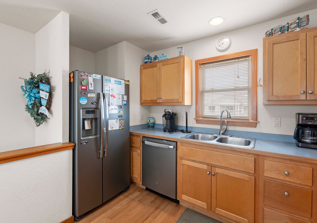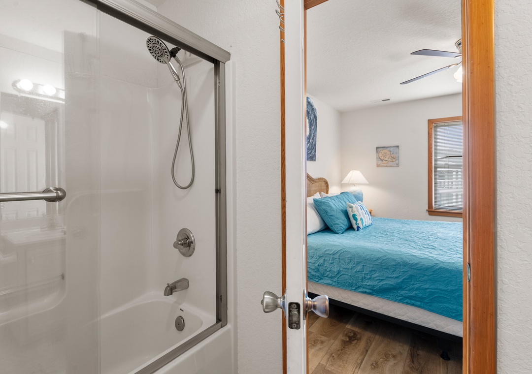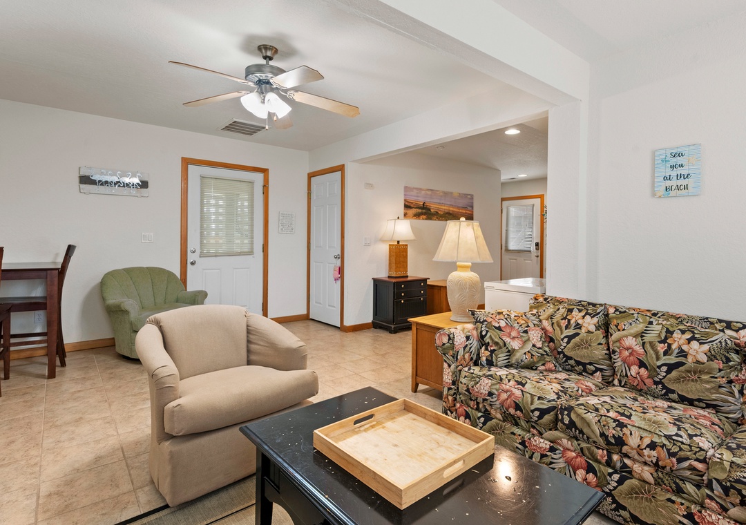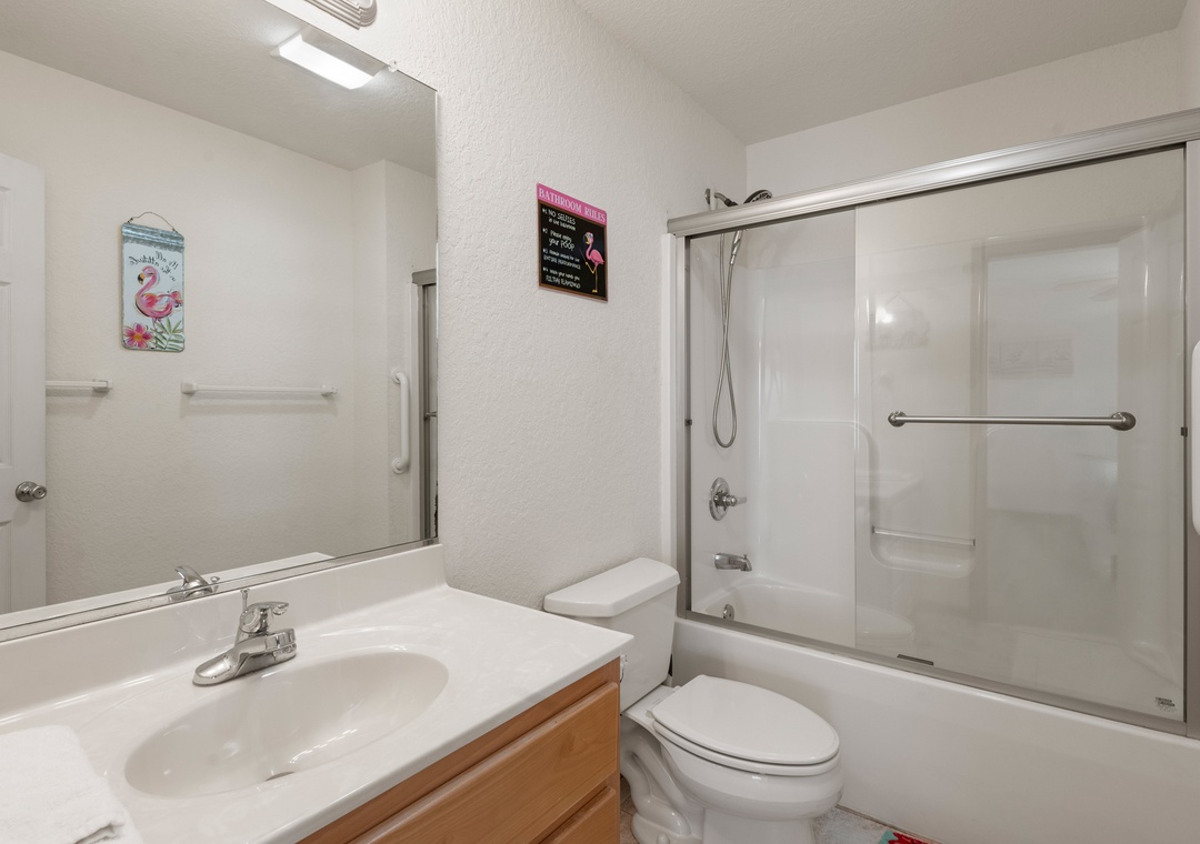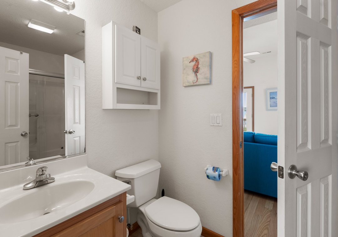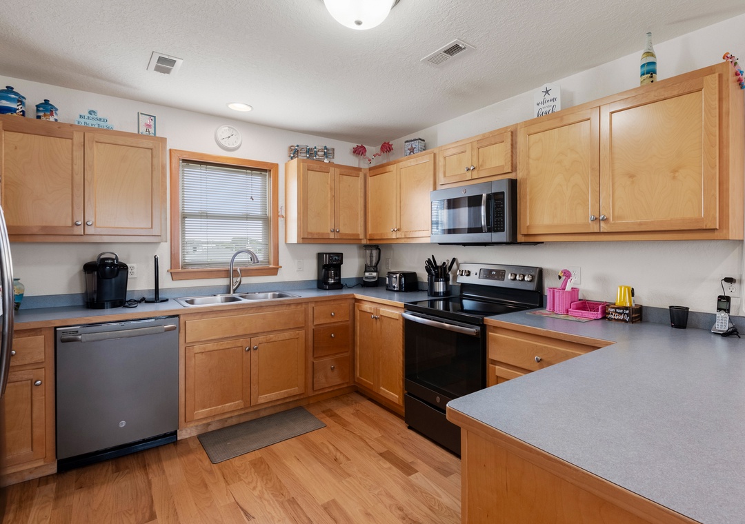 After a day at the beach, the outdoor fun can continue back at the house with a 26' x 12' private pool and bubbly hot tub. Inside, gather in the comfortably furnished great room where you can kick back, relax and watch TV. A gas fireplace is available during the off-season for staying cozy on cooler Spring and Fall evenings. You'll love the open-concept layout - ideal for spending quality time with family and friends, even while preparing meals in the fully stocked kitchen. The living area leads out to a sun deck that overlooks the pool area below. All four bedrooms include ensuite baths for plenty of privacy. Downstairs, a den on the ground level can serve as an additional living area or kid's hangout space. It includes a wet bar with mini fridge, perfect for grabbing a convenient drink or snack to enjoy poolside. Flamingo Nest is equipped with an elevator that goes from the ground level to the mid and top floors. It's ideal for guests with mobility issues or for sending luggage and groceries up and down during check-in and check-out.