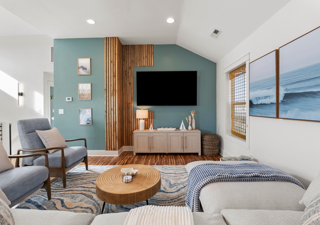 Downstairs, you'll find two more bedrooms and a second full bath. There's also a spacious den with pull-out sofa that can be used as an additional hangout space or for alternative sleeping arrangements. Grab a chilled bottle from the wine fridge and relax on the covered patio. This cozy outdoor oasis overlooks a lush and barefoot-friendly lawn perfect for kids, pets and yard games.