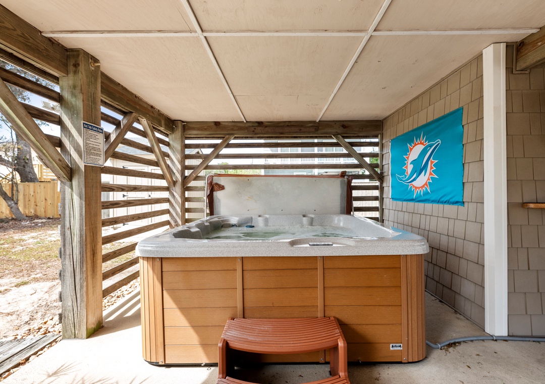 Kick off your flip-flops and head downstairs to the chill zone, where you’ll find a hot tub, an outdoor TV perfect for movie nights under the stars, and a refreshing outdoor shower to rinse off the salt and sand after a day at the beach.