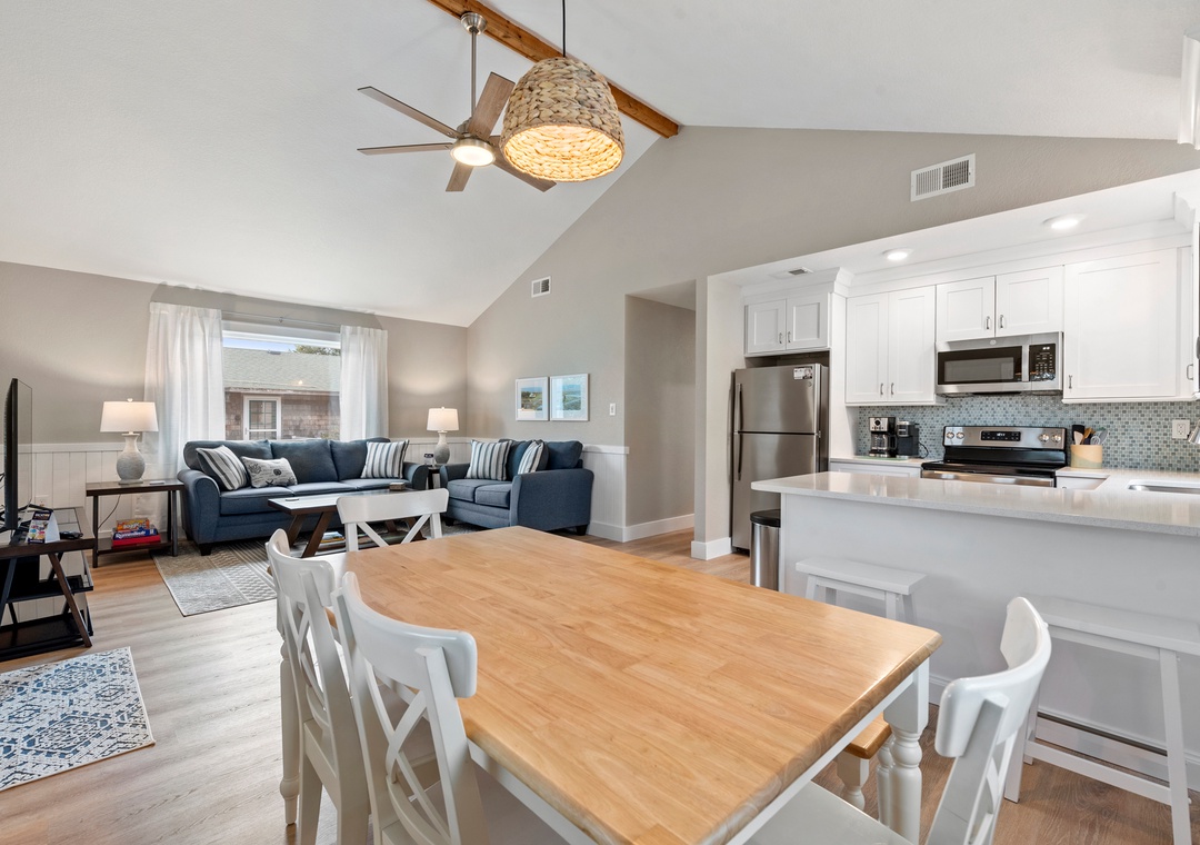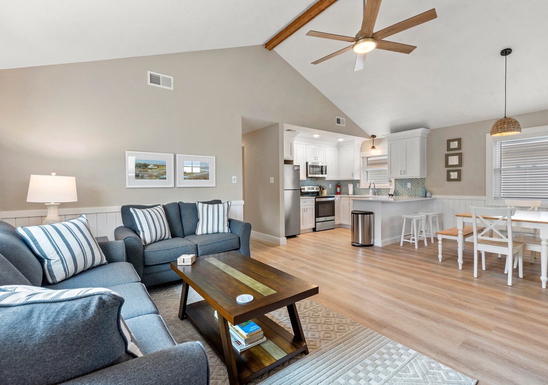If your next trip to the Outer Banks is long overdue, start making plans now and be Wright On Time. This classic beach box has been completely renovated throughout. Modern fixtures and LVP flooring make Wright On Time look and feel like a newly constructed home. The coastal-inspired finishes and decor will give you all the beach house vibes you've been looking for. At the end of the day, come home and hang out in the open-concept great room with vaulted ceilings and neutral tones for a bright and airy atmosphere. Get dinner started in the brand new kitchen with stainless steel appliances and a gorgeous blue mosaic backsplash. Pets are welcome at Wright On Time, so you furry friends can accompany you on your next OBX getaway.