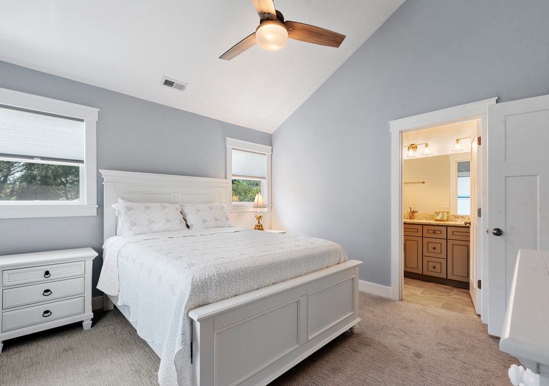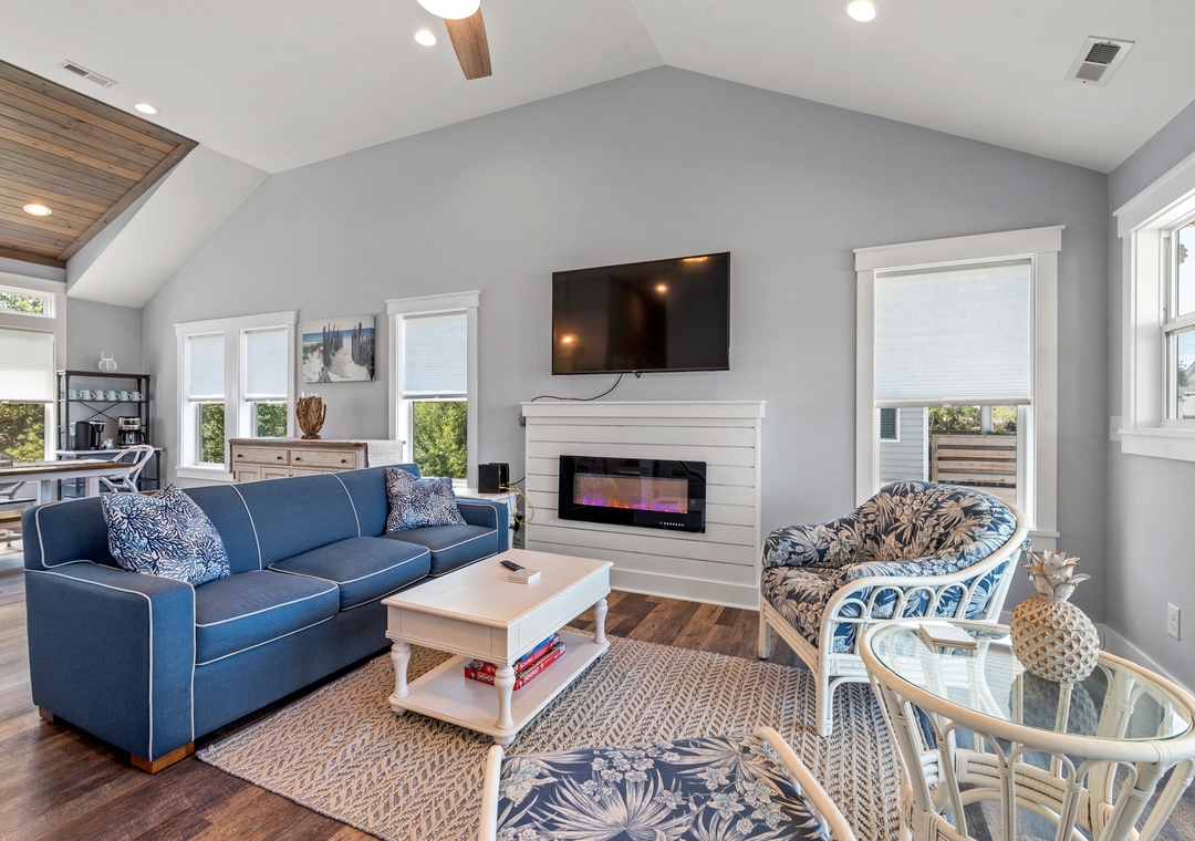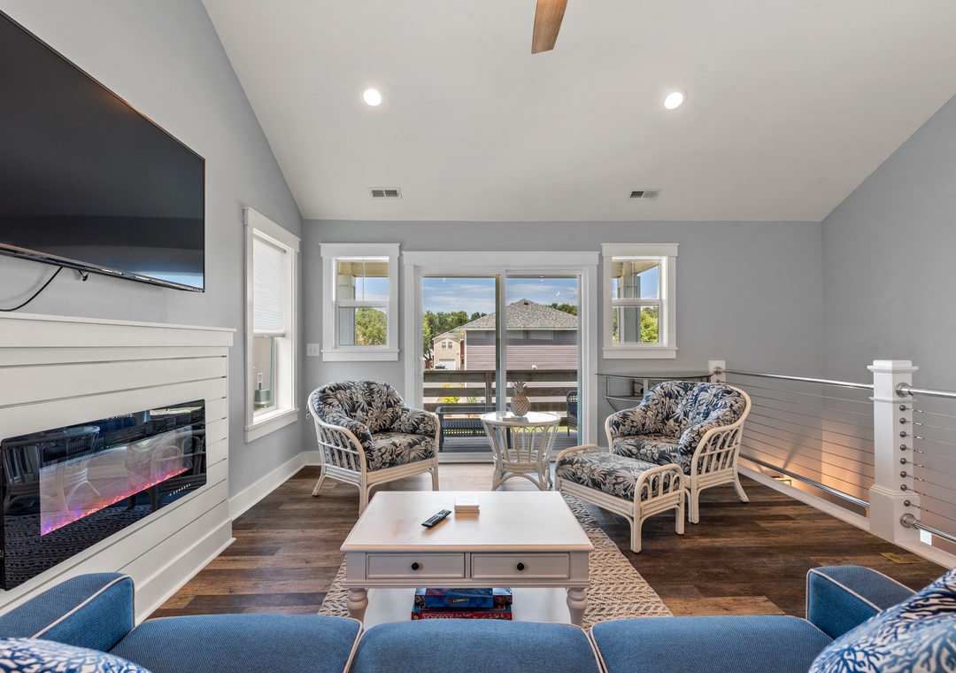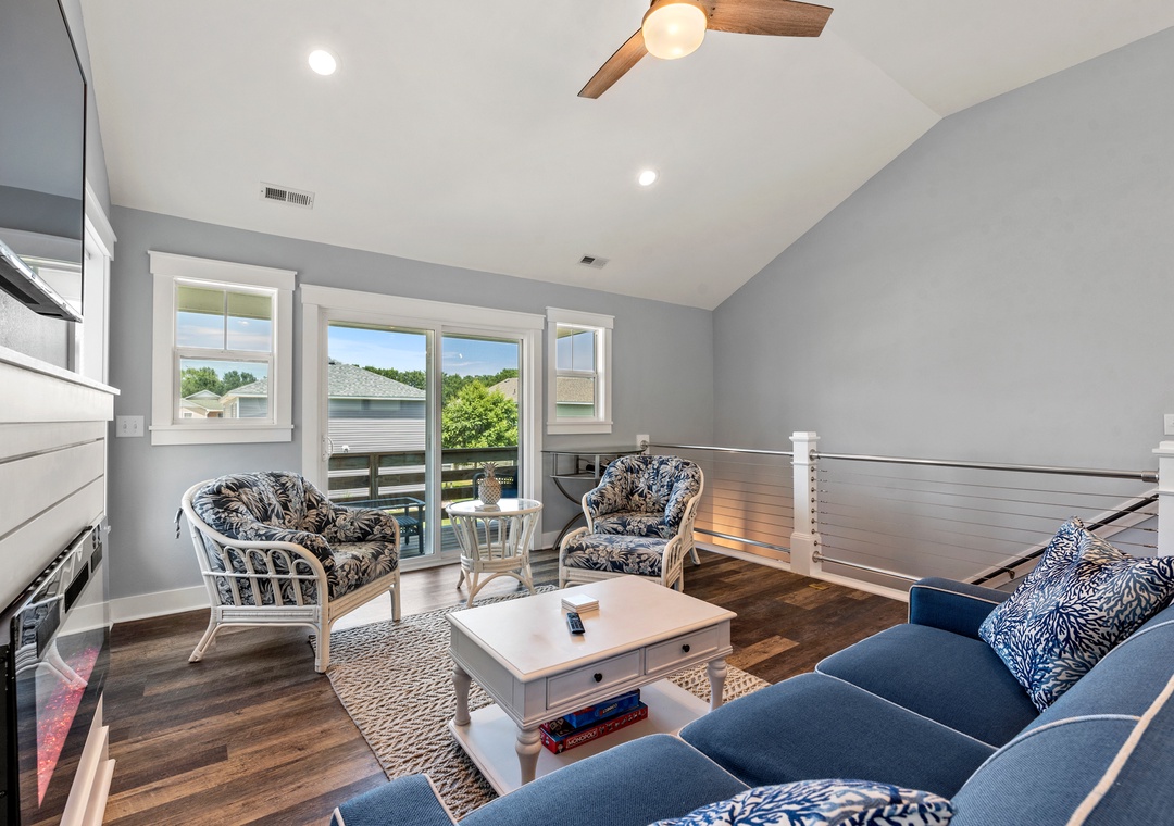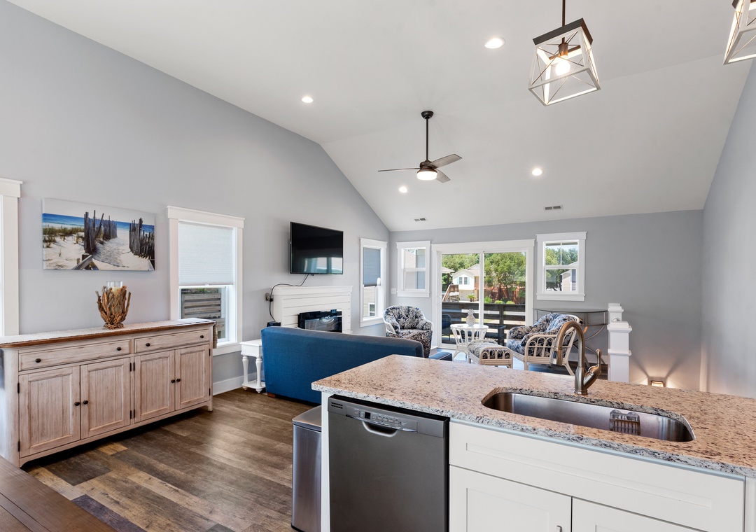 For a laid-back beach getaway, kick off those shoes and spend your next vacation Barefoot by the Bay. This immaculate, newly constructed soudside home features updated finishes throughout and a beautifully landscaped yard. The open-concept living area boasts a modern beach house vibe, complete with a shiplap fireplace, luxury vinyl plank flooring, and a steel cable railing on the staircase. A covered deck serves as an extension of the living room and is the perfect place to enjoy your coffee in the morning and cocktails in the evening. The family-friendly eat-in kitchen includes stainless steel appliances, granite countertops and additional seating at the bar. A wall of transom windows and a vaulted ceiling with wood paneling make the space feel open and bright. After a long day of fun in the sun, retreat to the spacious primary suite that includes a private bath with dual vanity and custom tile shower. The den downstairs provides an additional hang-out space with seating and a TV. Outside, Barefoot by the Bay lives up to its name with a lush, grassy lawn perfect for kids and yard games.