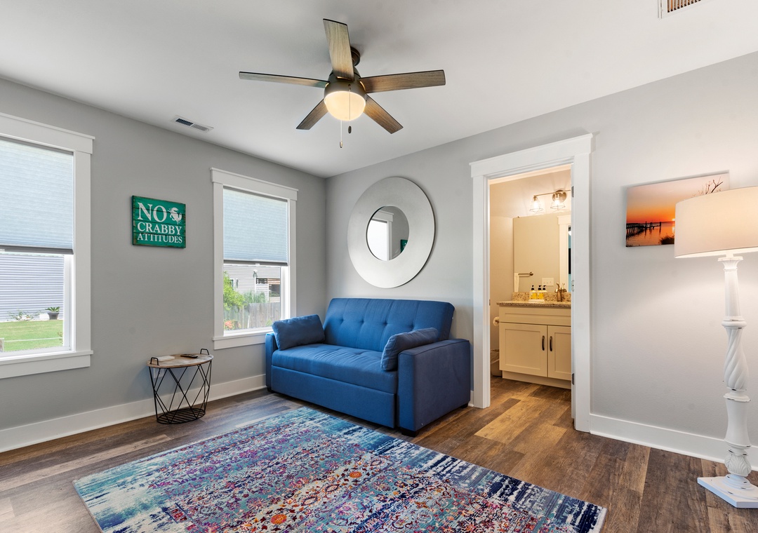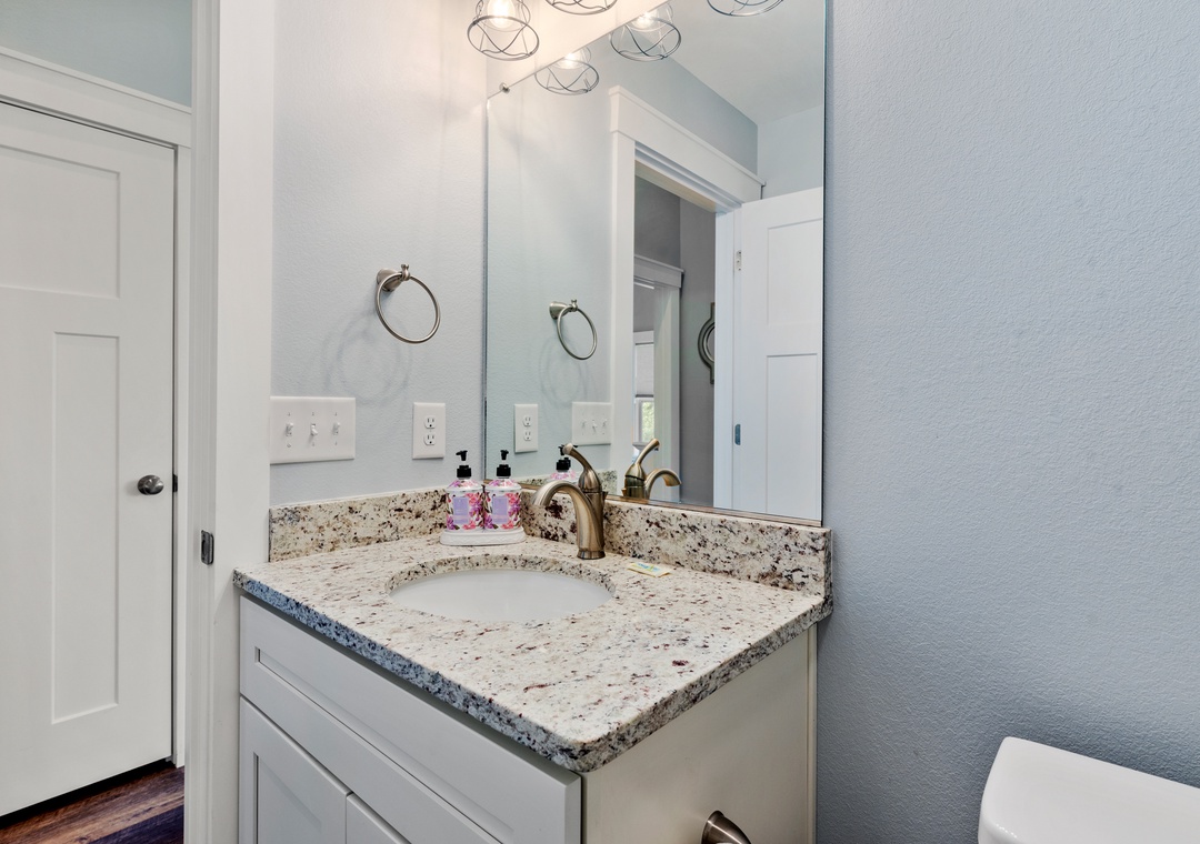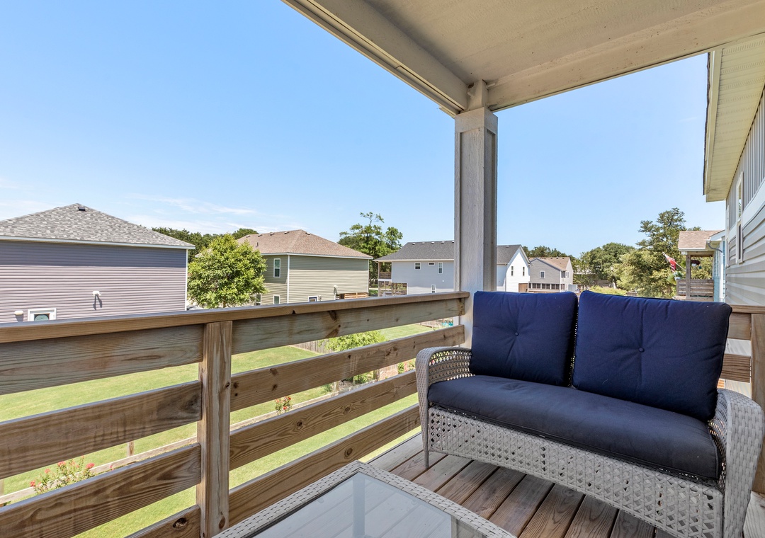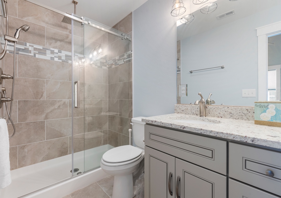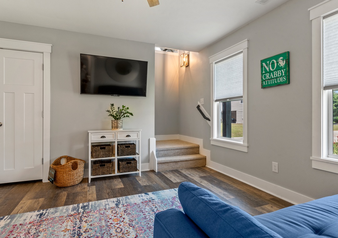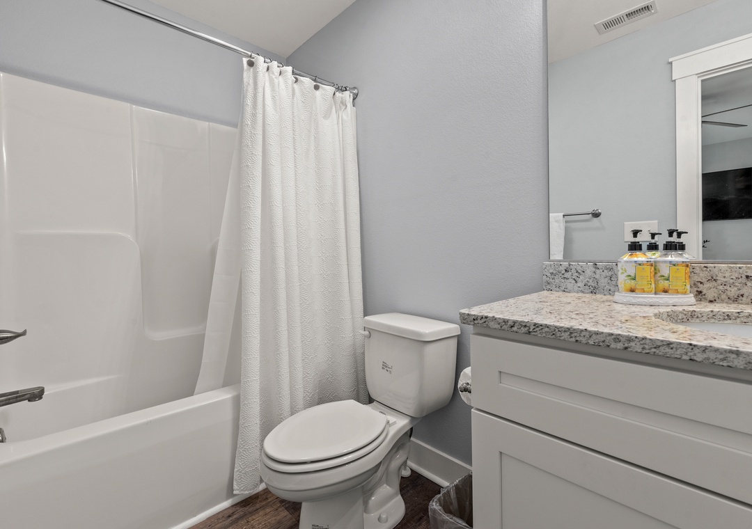 For a laid-back beach getaway, kick off those shoes and spend your next vacation Barefoot by the Bay. This immaculate, newly constructed soudside home features updated finishes throughout and a beautifully landscaped yard. The open-concept living area boasts a modern beach house vibe, complete with a shiplap fireplace, luxury vinyl plank flooring, and a steel cable railing on the staircase. A covered deck serves as an extension of the living room and is the perfect place to enjoy your coffee in the morning and cocktails in the evening. The family-friendly eat-in kitchen includes stainless steel appliances, granite countertops and additional seating at the bar. A wall of transom windows and a vaulted ceiling with wood paneling make the space feel open and bright. After a long day of fun in the sun, retreat to the spacious primary suite that includes a private bath with dual vanity and custom tile shower. The den downstairs provides an additional hang-out space with seating and a TV. Outside, Barefoot by the Bay lives up to its name with a lush, grassy lawn perfect for kids and yard games.