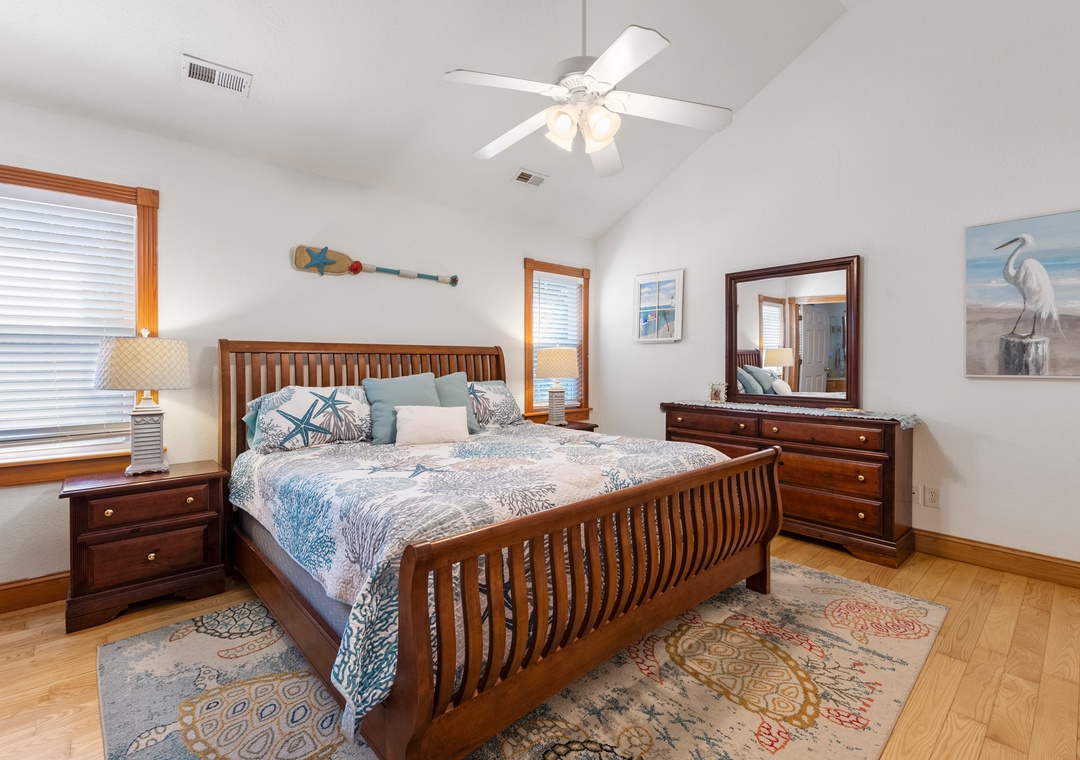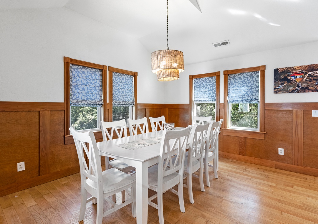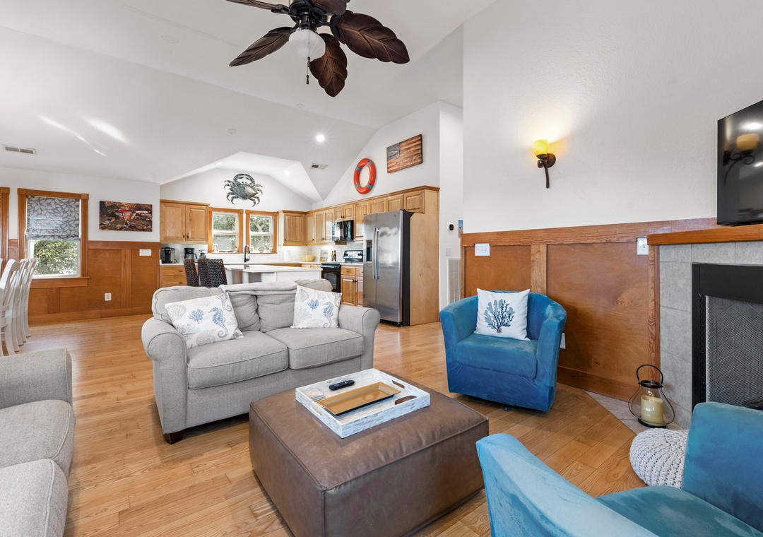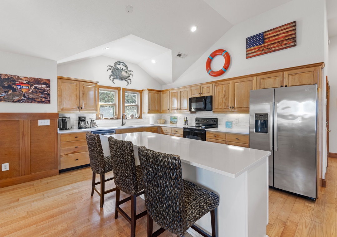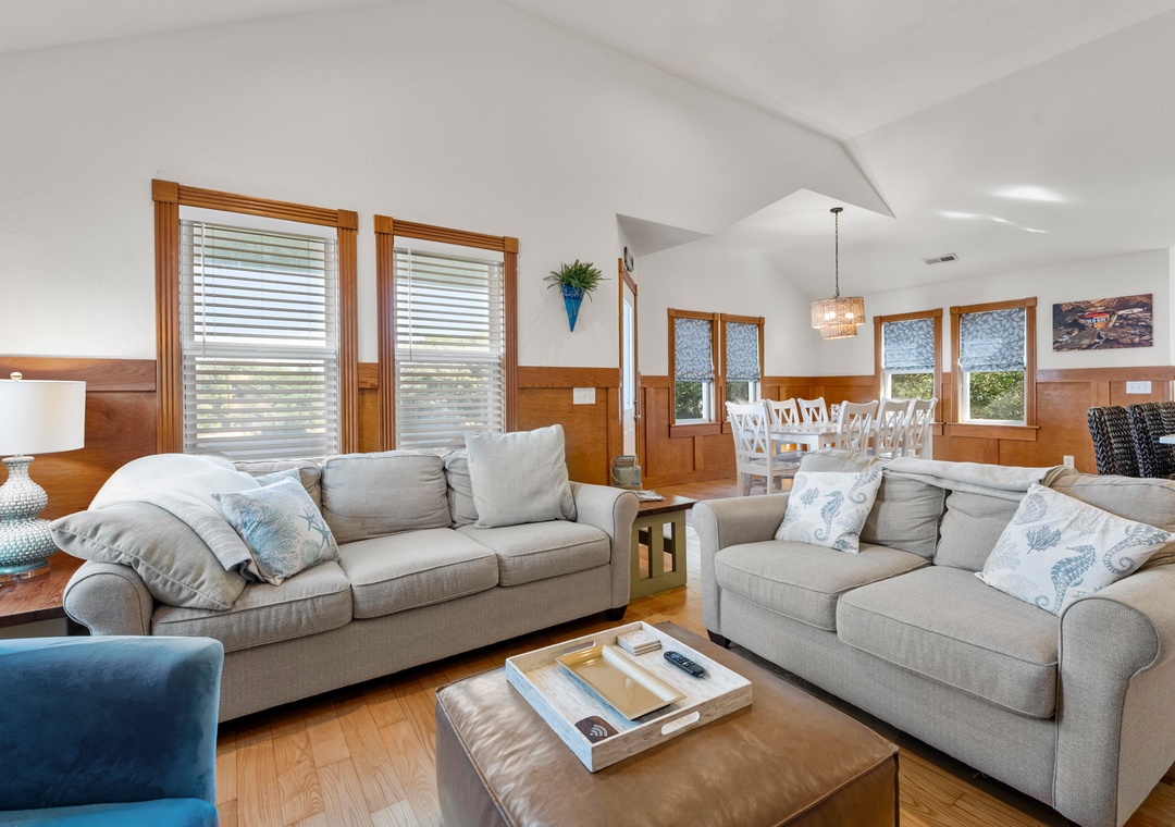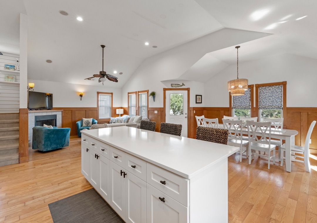 The perfect Outer Banks vacation begins with CNU At The Beach. This lovely soundside home is situated on a quiet cul-de-sac in Kill Devil Hills, just a ten-minute walk to the beach or the sound. Meticulously maintained, this beautifully constructed home features upgrades, thoughtful details, and modern finishes throughout. Start your day with a cup of coffee on the inviting front porch that overlooks the landscaped yard. Inside, the open-concept great room features vaulted ceilings, gorgeous hardwood flooring and plenty of comfortable seating. The chef in your group will especially appreciate the spacious kitchen anchored by a large island with bar seating. A cozy loft space is equipped with a built-in workstation for guests who need to stay caught up with work or school remotely.