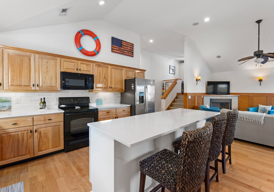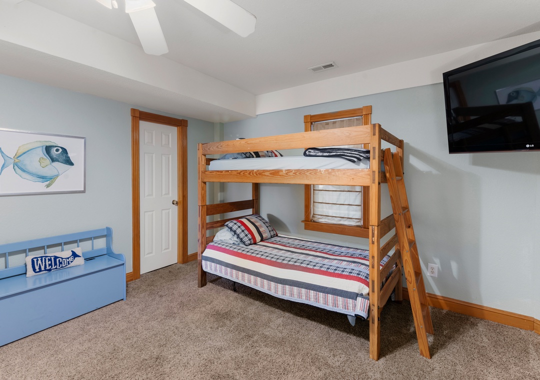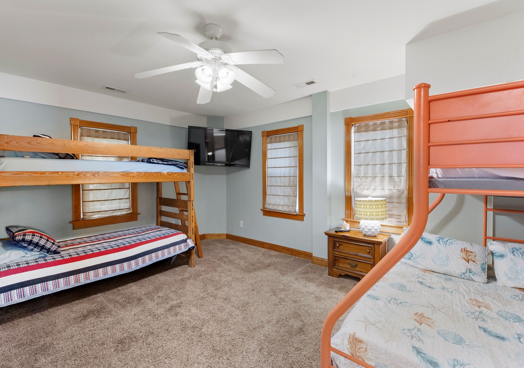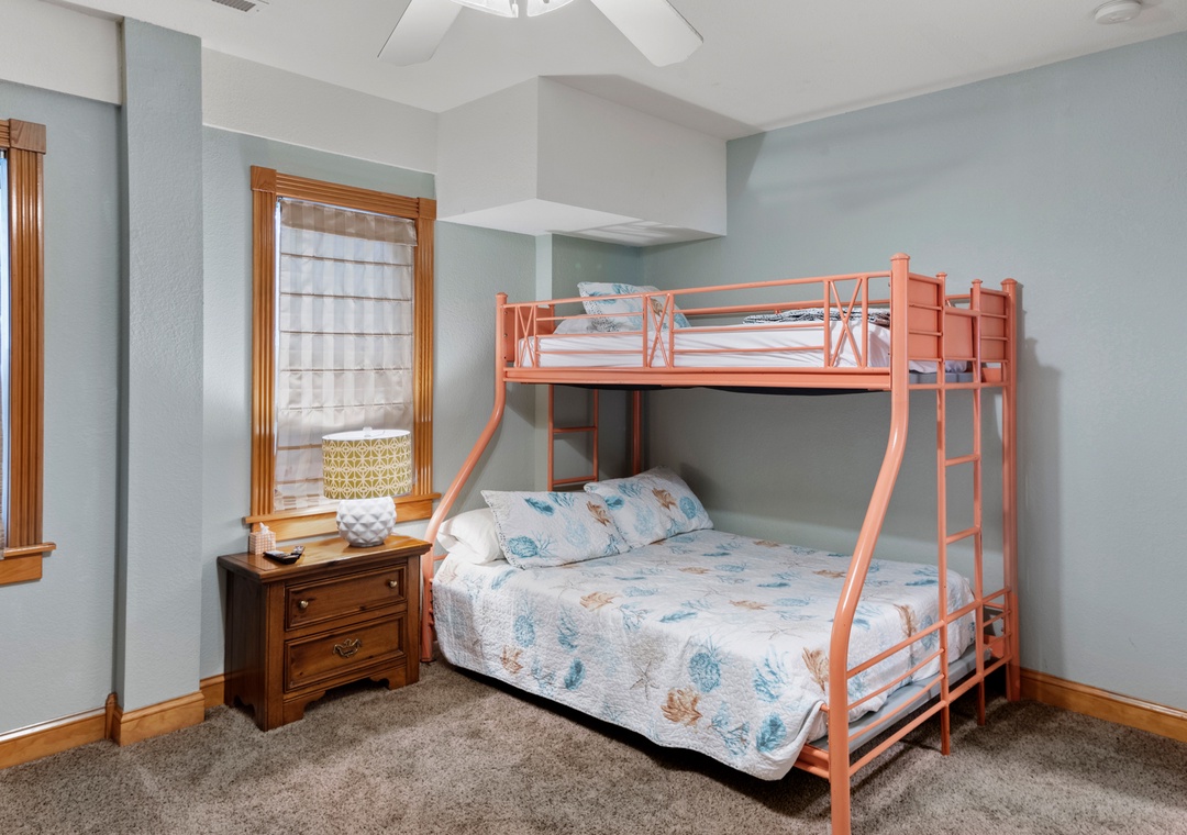 The primary suite is conveniently located on the main level and features a king bed and private bath. Also on the main level you'll find a queen bedroom and full hall bath. Downstairs, the ground level consists of a third bedroom with queen, third full bath and a bonus room with bunkbeds that can be used for alternative sleeping arrangements. A wet bar with mini fridge is also located on this floor, perfect for convenient drinks and snacks without having to go upstairs.