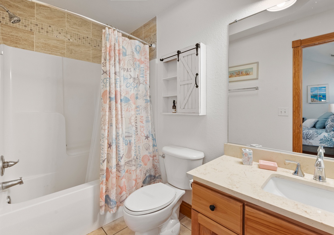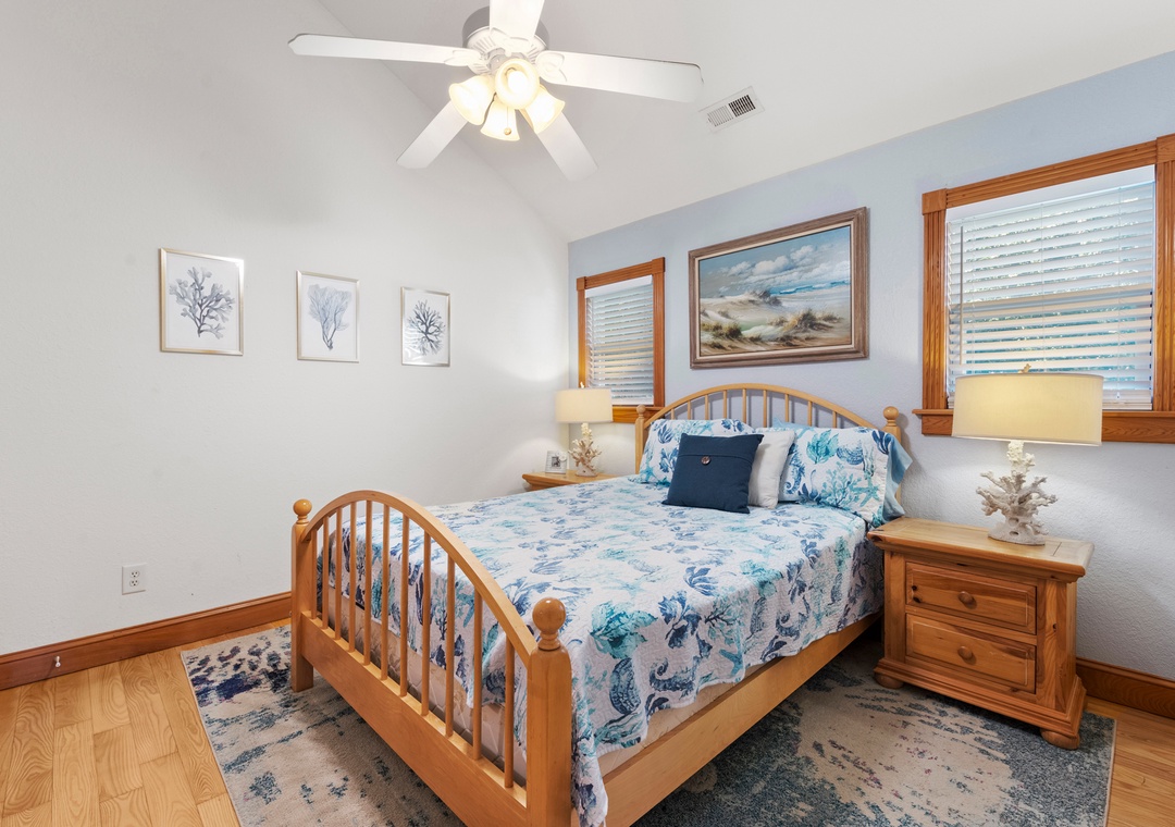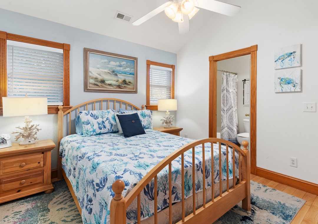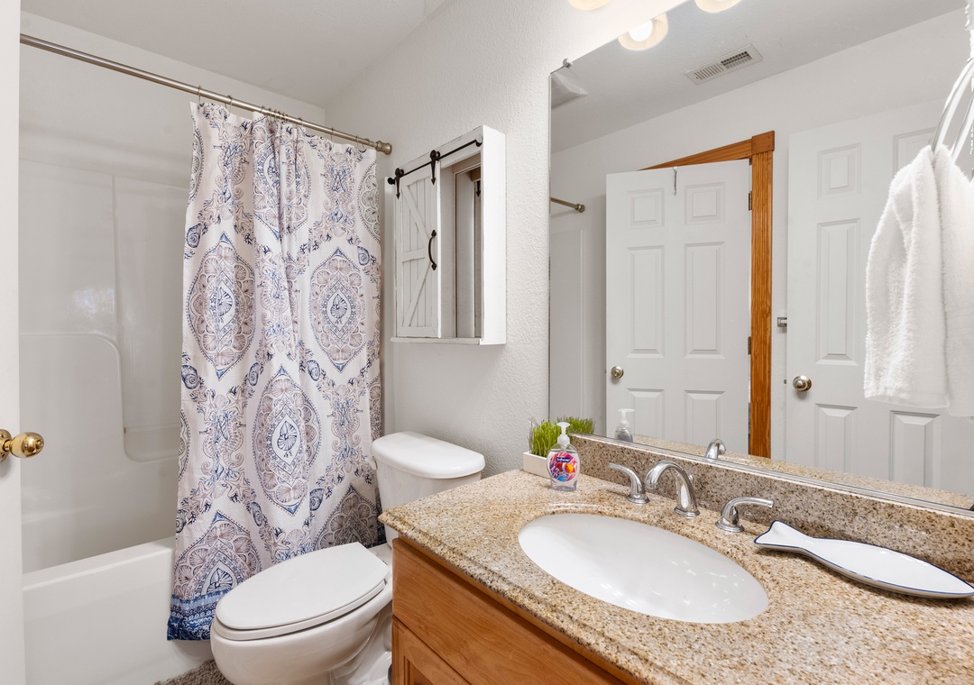 The primary suite is conveniently located on the main level and features a king bed and private bath. Also on the main level you'll find a queen bedroom and full hall bath. Downstairs, the ground level consists of a third bedroom with queen, third full bath and a bonus room with bunkbeds that can be used for alternative sleeping arrangements. A wet bar with mini fridge is also located on this floor, perfect for convenient drinks and snacks without having to go upstairs.