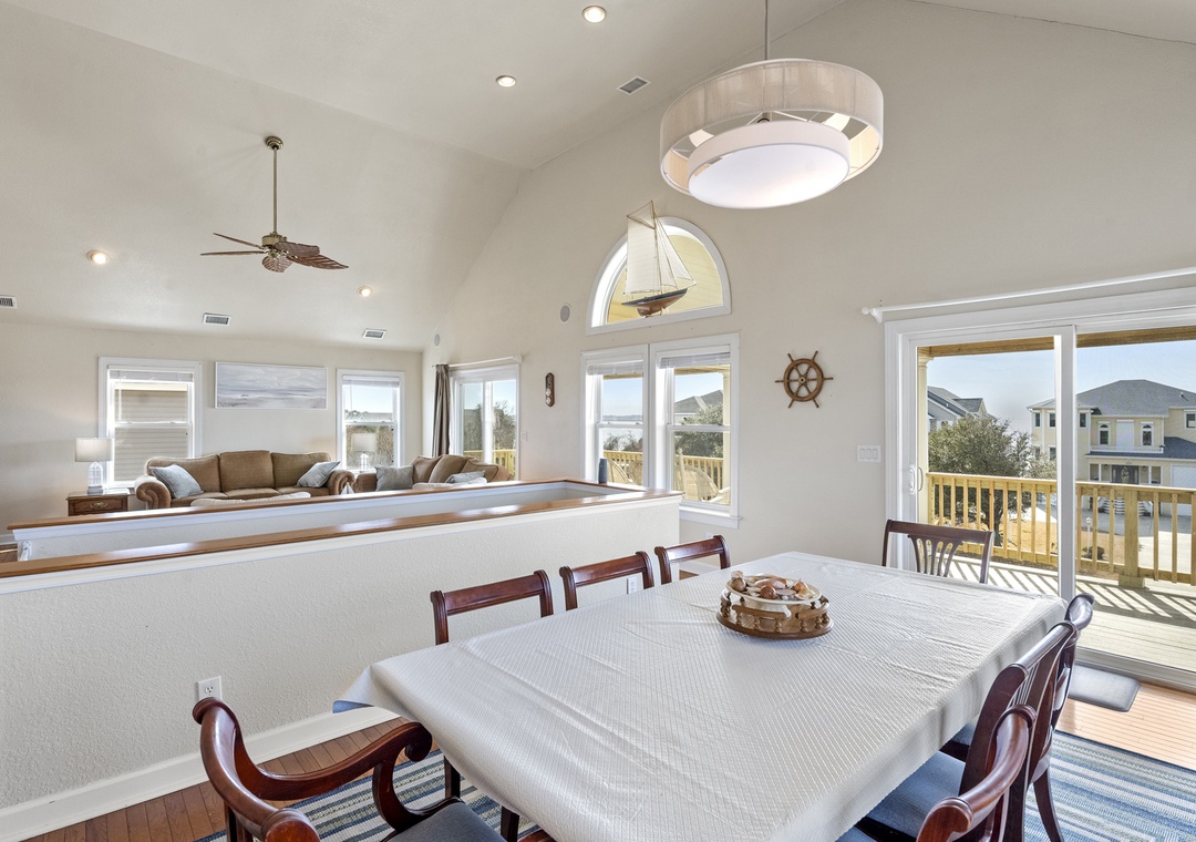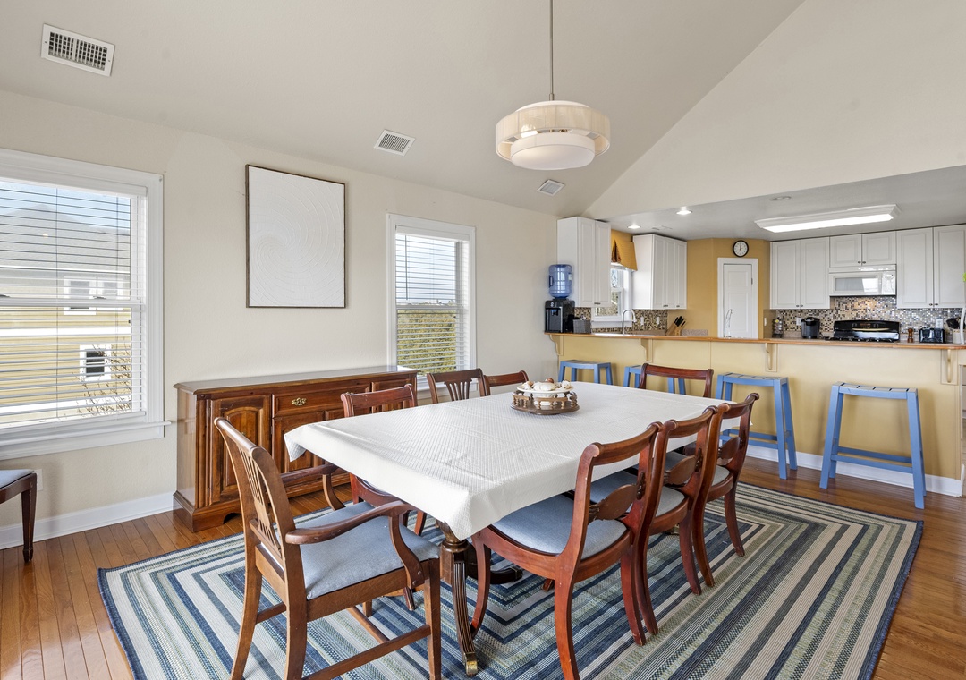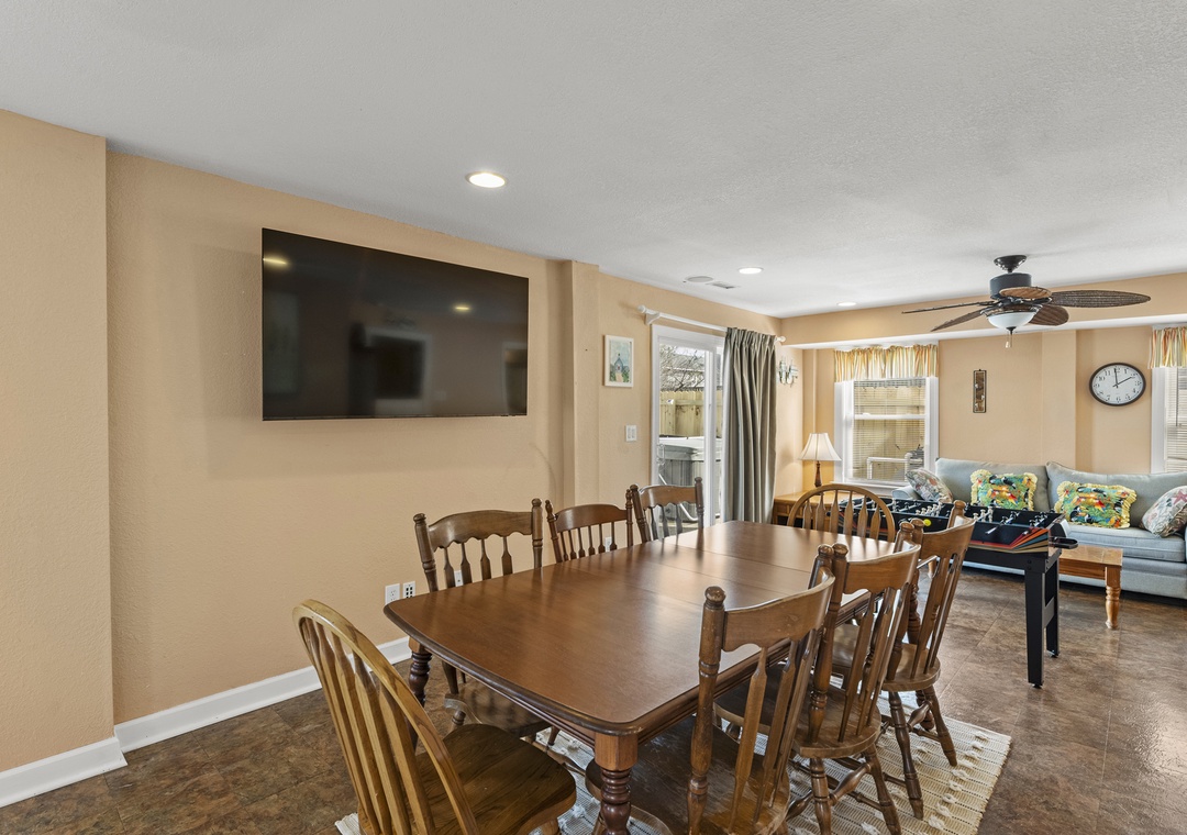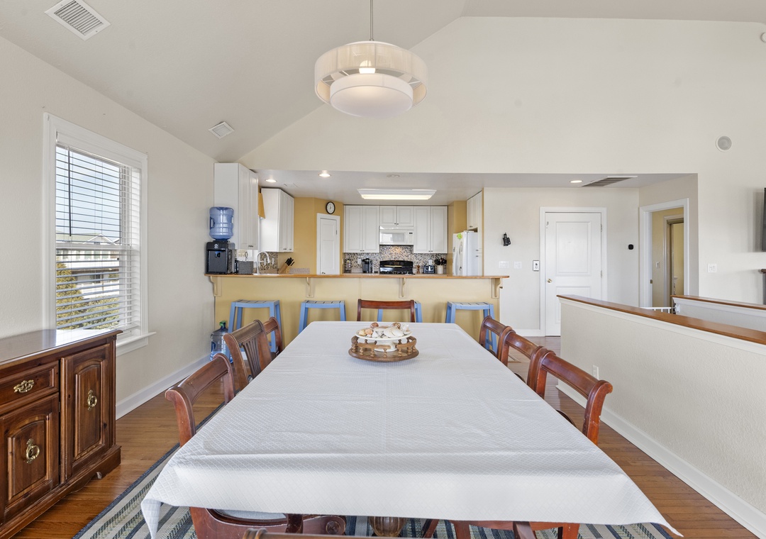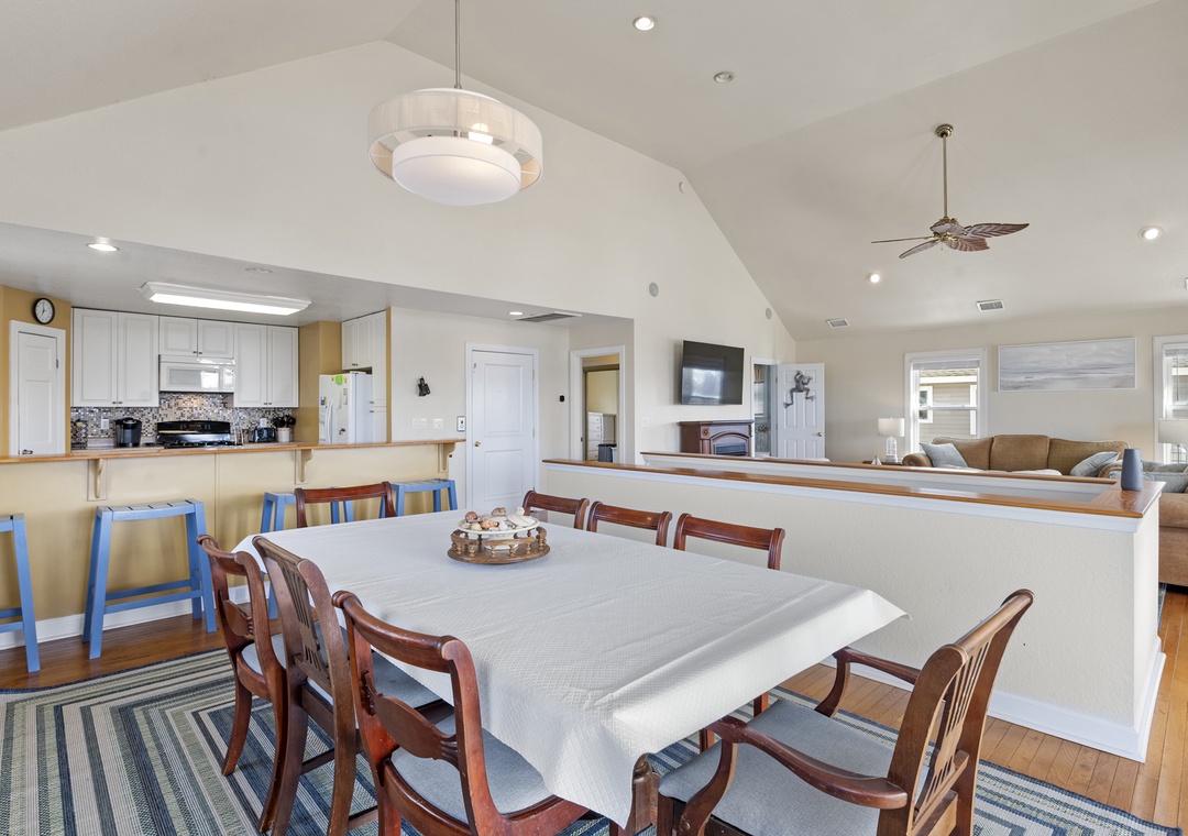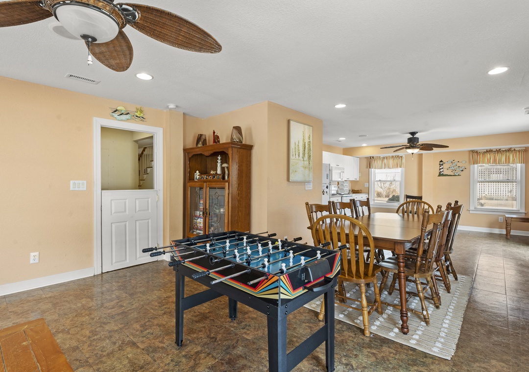 Start the fun on the ground level, where a king bedroom offers easy access to a shared jack‑and‑jill bath and a freshly renovated rec room that’s ready for friendly competition. A 60" TV, mini‑games, billiards, air hockey, and more set the stage for laughter-filled nights, while seating for eight makes it a great hangout space. Step outside to enjoy the pool and hot tub, rinse off in the outdoor shower, and soak up that laid‑back Outer Banks vibe.