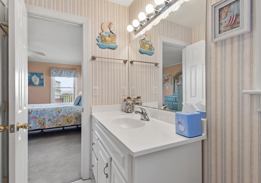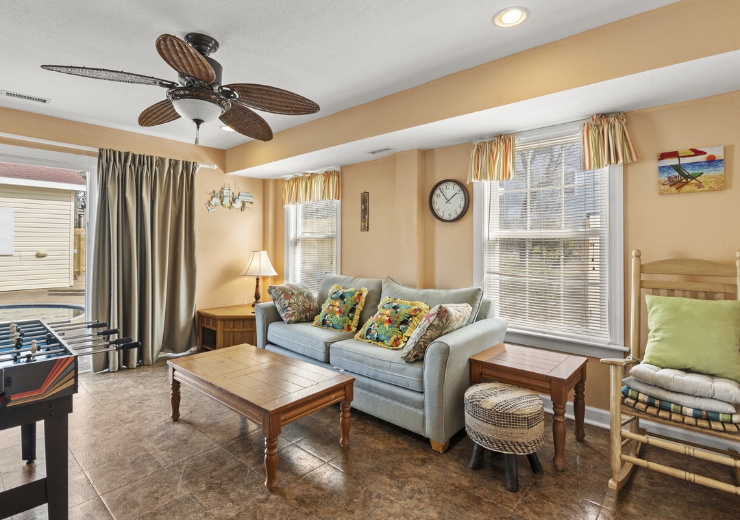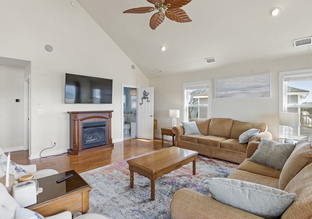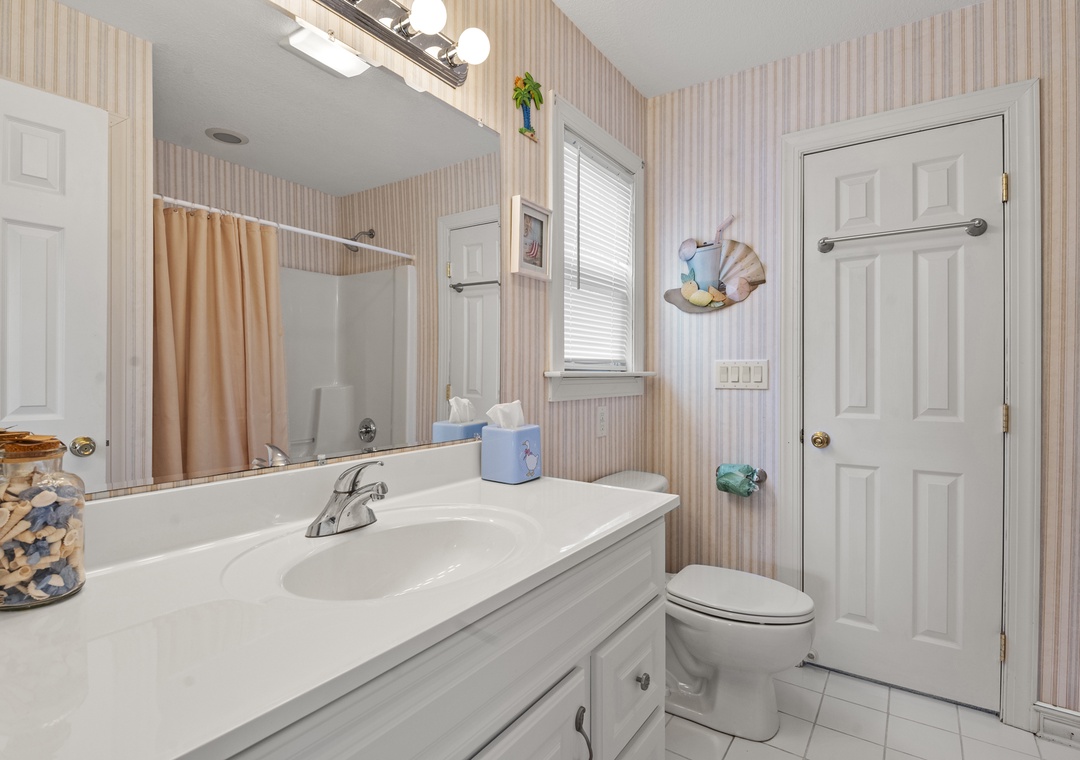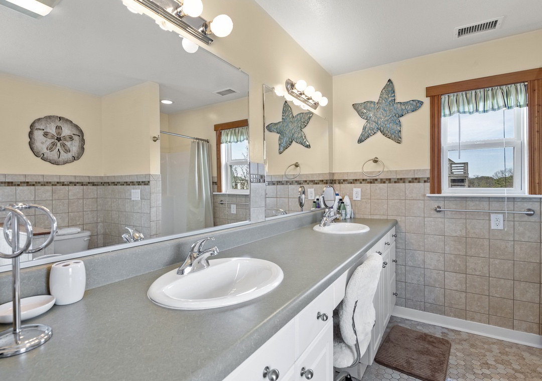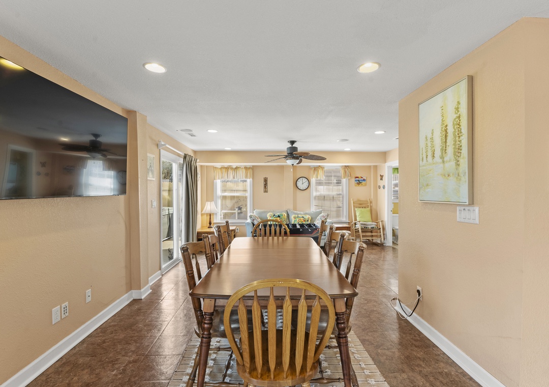 Start the fun on the ground level, where a king bedroom offers easy access to a shared jack‑and‑jill bath and a freshly renovated rec room that’s ready for friendly competition. A 60" TV, mini‑games, billiards, air hockey, and more set the stage for laughter-filled nights, while seating for eight makes it a great hangout space. Step outside to enjoy the pool and hot tub, rinse off in the outdoor shower, and soak up that laid‑back Outer Banks vibe.