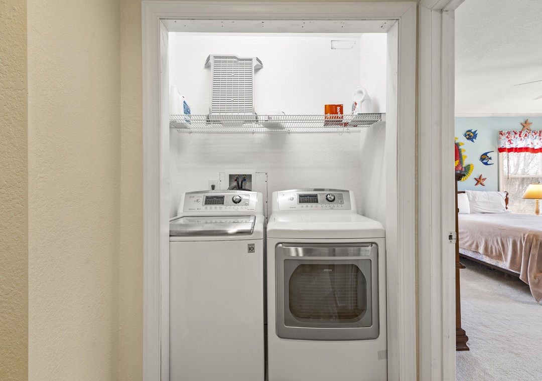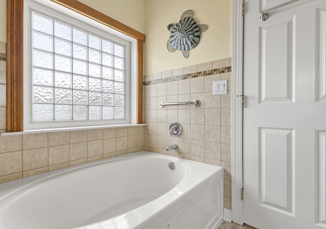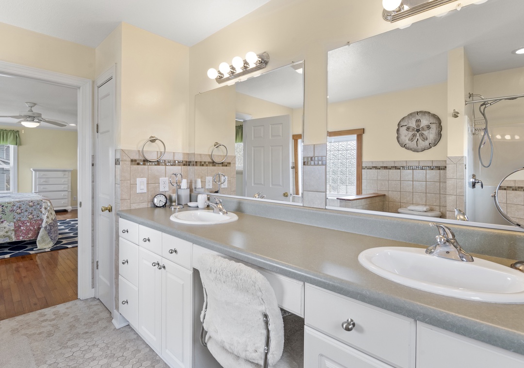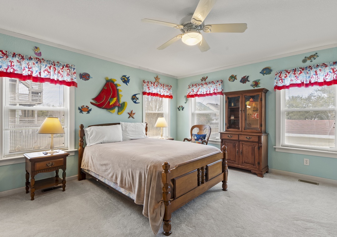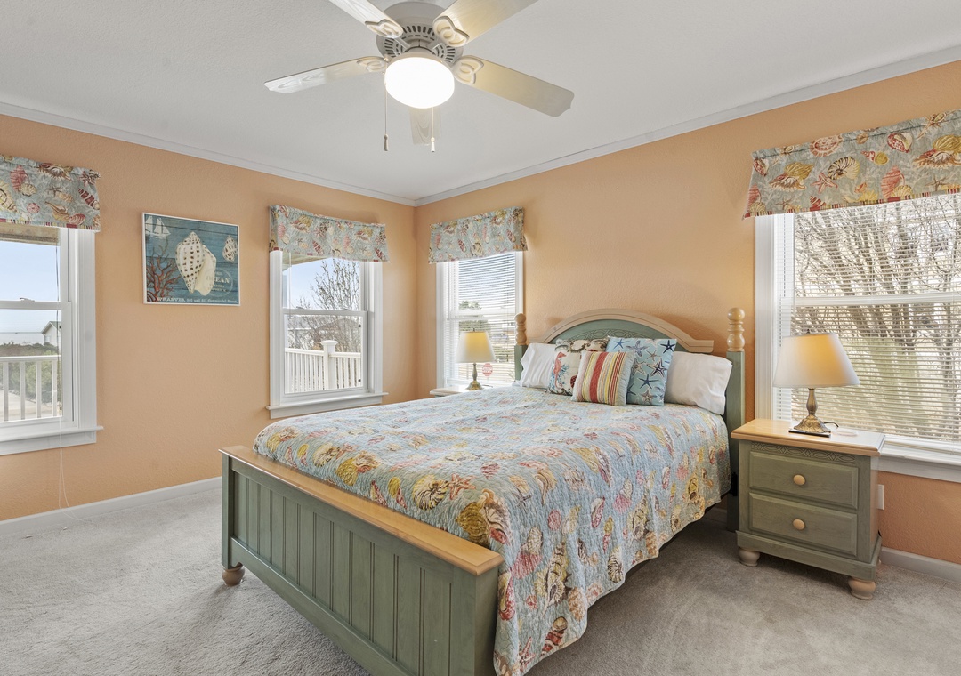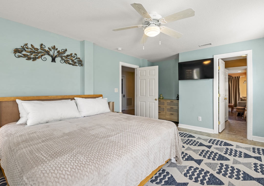 The middle level is all about comfort and convenience, featuring four queen bedrooms with ample closet and dresser space and wall‑mounted TVs throughout. Two jack‑and‑jill bathrooms serve the adjoining bedrooms, each complete with a large tub and shower, perfect for unwinding after a sandy day at the beach.
