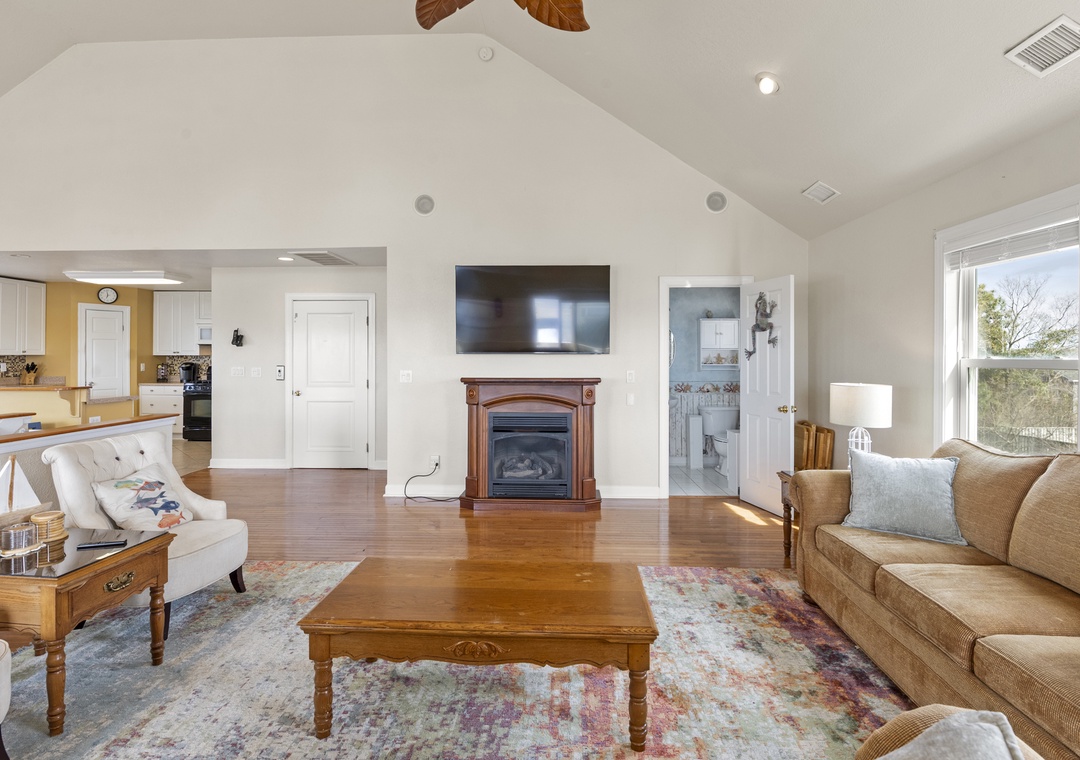 Head to the top level and you’ll find the heart of the home, where the open living area invites everyone to gather. The fully equipped kitchen boasts a gas stove, dishwasher, pantry, Keurig, and a large dining table for meals and memories, plus a breakfast bar for extra seating. Step onto the balcony to take in beautiful sound views or retreat to the king ensuite with a soaking jacuzzi tub, dual vanity, and spacious shower for a little vacation luxury.