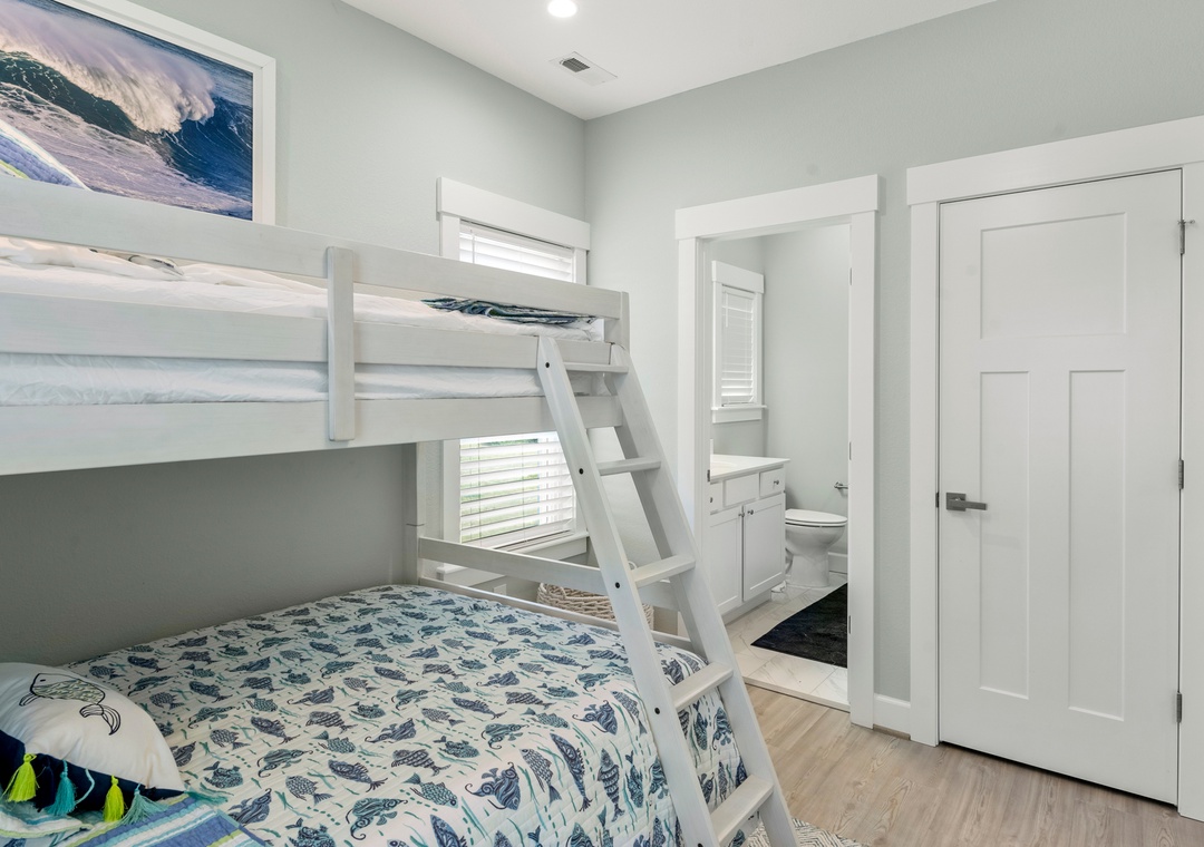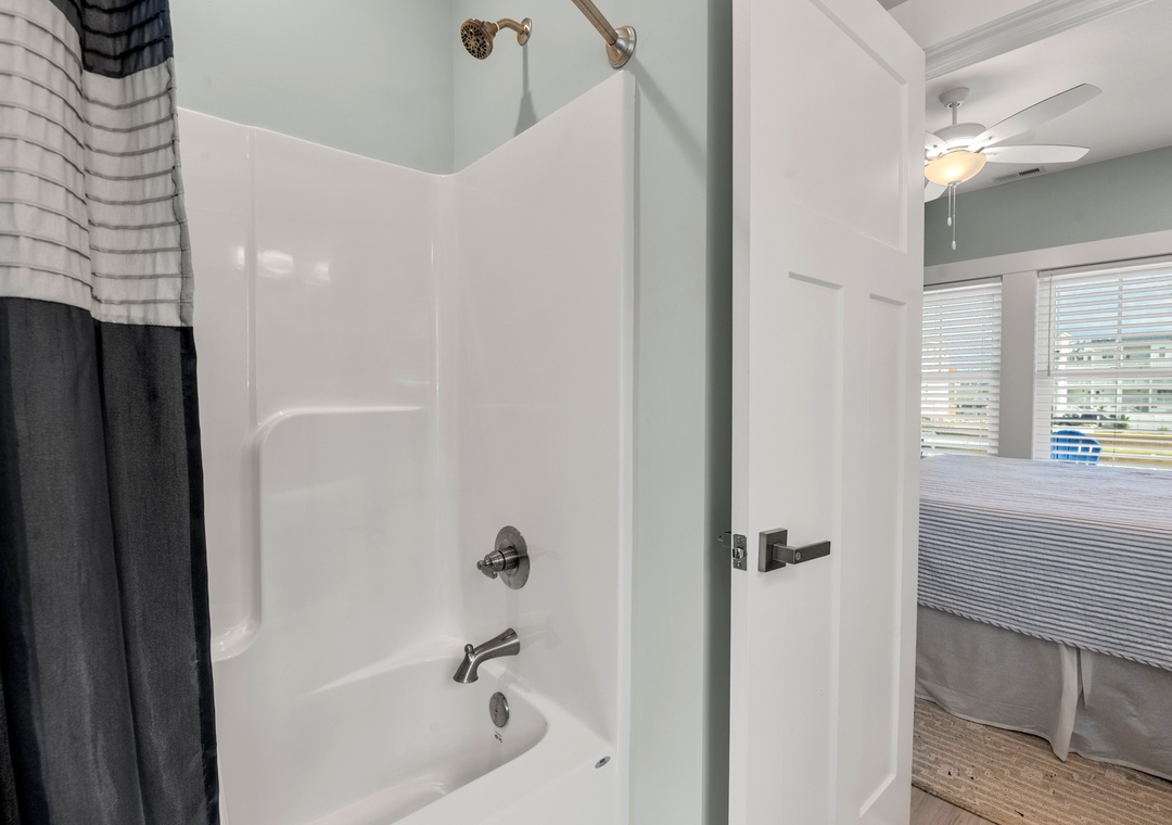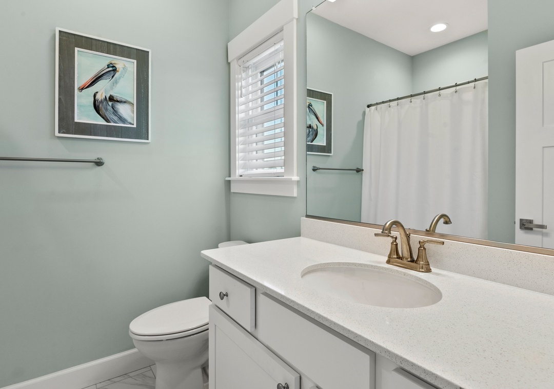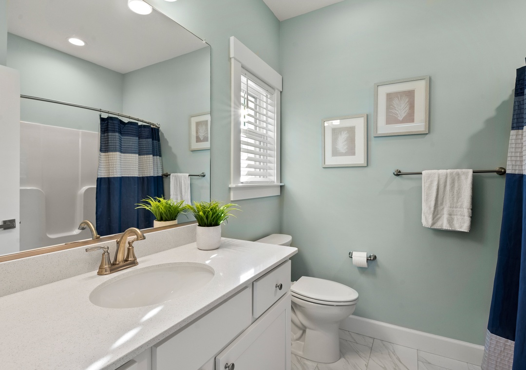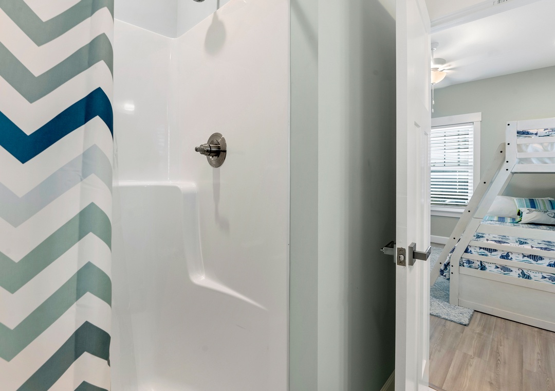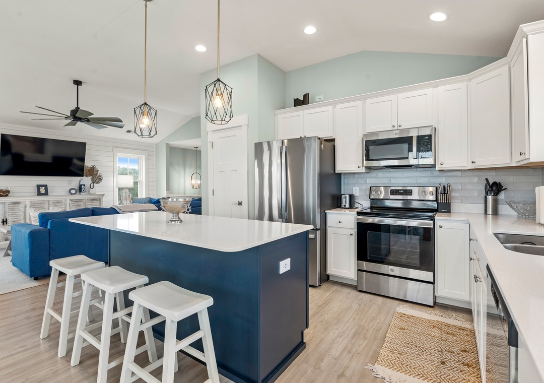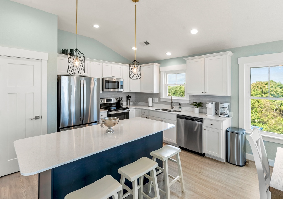 After a day of fun in the sun, come home to the open-concept great room where you can kick back and relax with family and friends. This comfortably furnished gathering space features vaulted ceilings, a coastal-inspired shiplap accent wall and access to a covered deck overlooking the private pool. When you're not trying one of the fabulous nearby restaurants, embrace your inner chef in the well-equipped kitchen with granite countertops, stainless steel appliances and a large island with bar seating. At the end of the night, retreat to the top-level primary king bedroom and luxurious ensuite bath with dual vanities, custom tiled walk-in shower. Downstairs, the mid-level consists of two additional king ensuites along with a bunk bedroom. There's also a cozy den where you can curl up with a book or watch a movie. Downstairs, the ground level has been set up for the ultimate outdoor living experience. After a refreshing dip in the saltwater pool or relaxing soak in the bubbly hot tub, rinse off in the upgraded outdoor shower before grabbing a cold beverage from the outdoor wet bar with mini fridge and icemaker. The pool can be heated certain times of the year, perfect for off-season getaways.