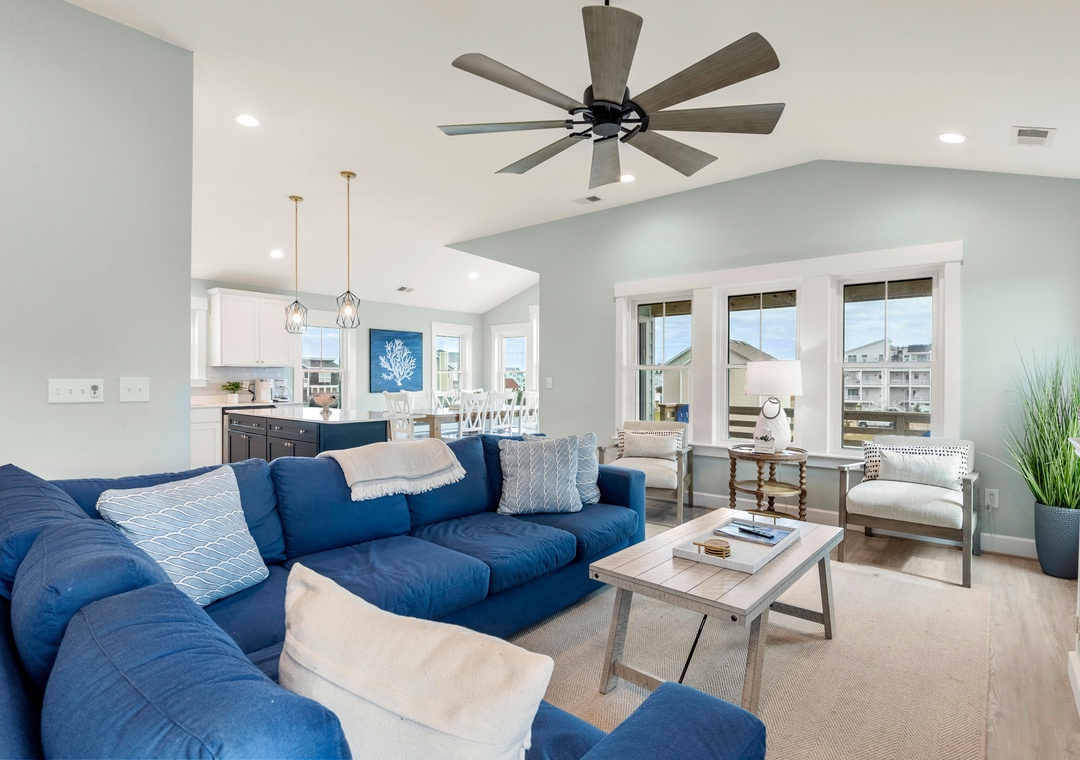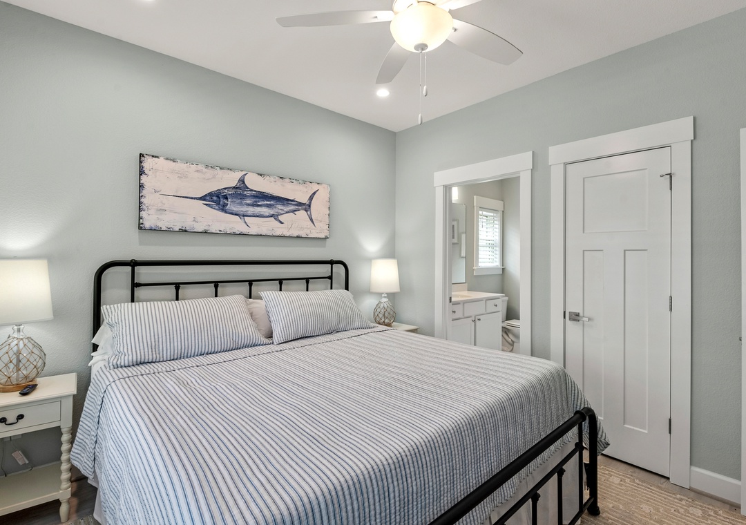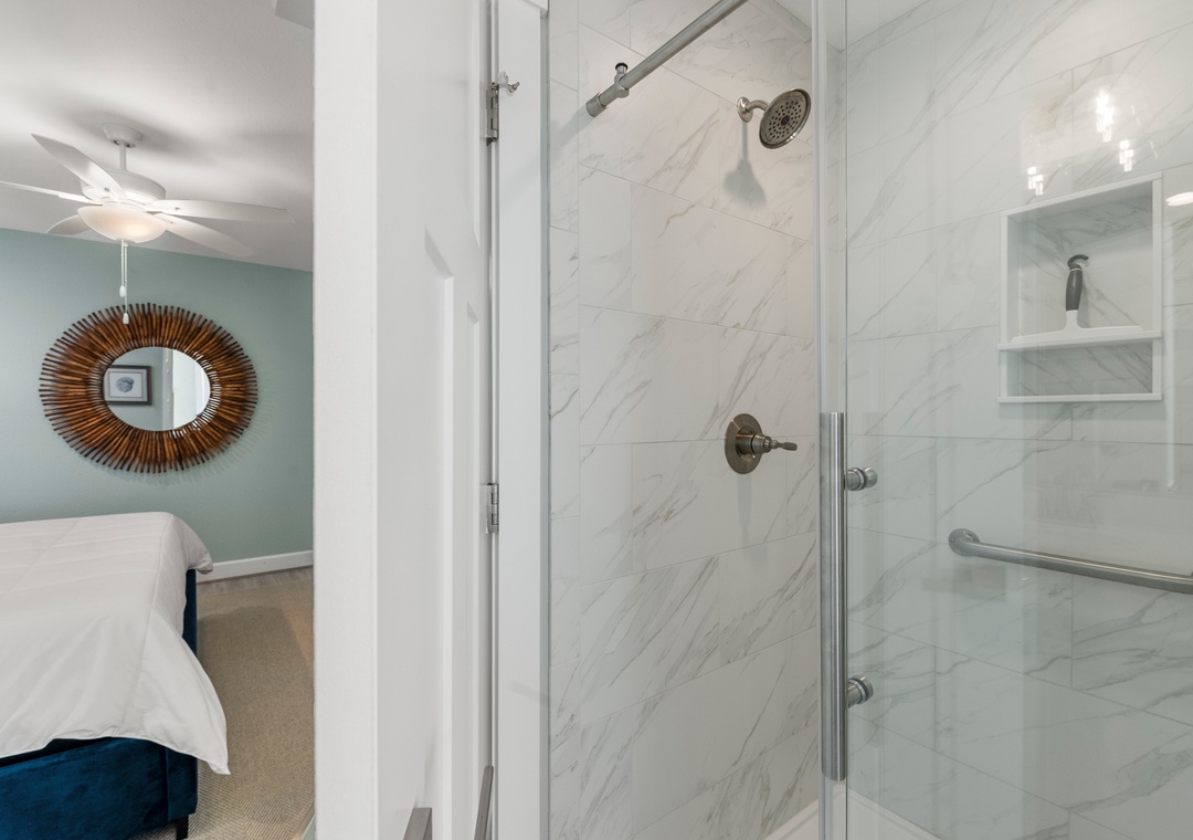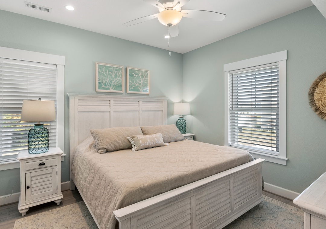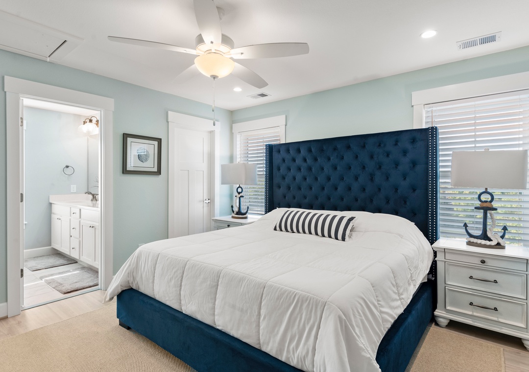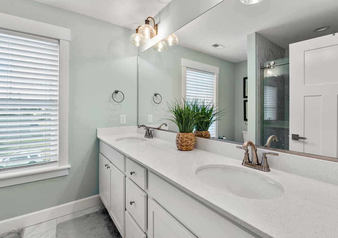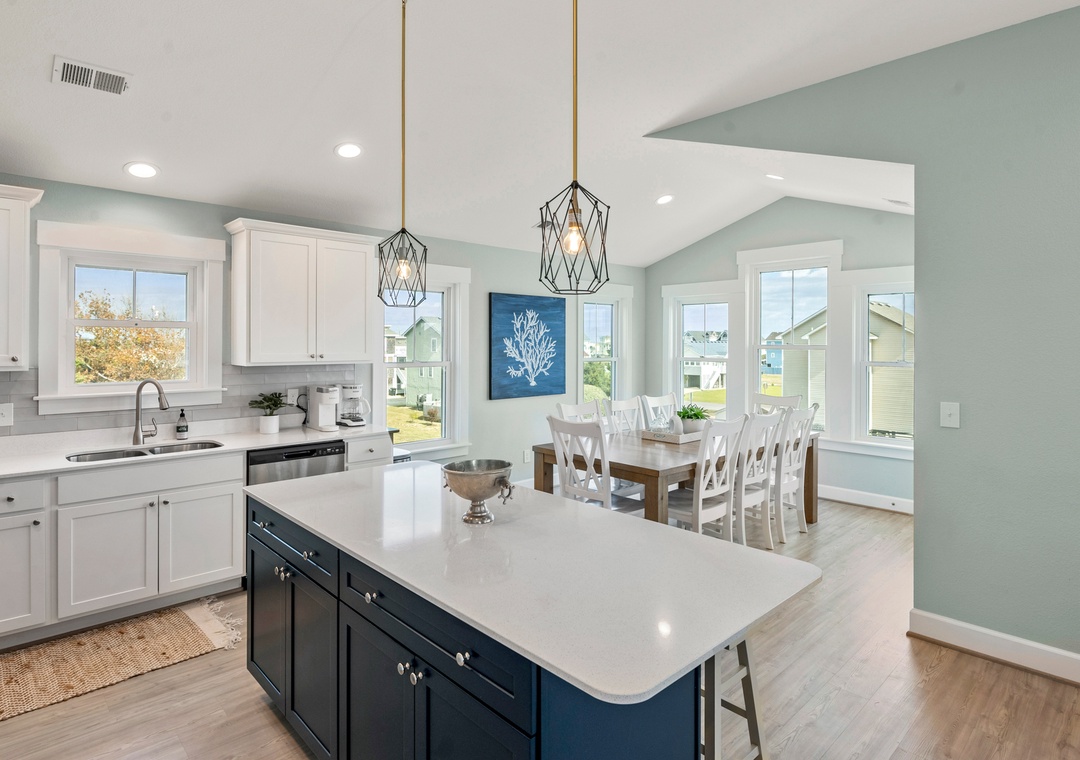 After a day of fun in the sun, come home to the open-concept great room where you can kick back and relax with family and friends. This comfortably furnished gathering space features vaulted ceilings, a coastal-inspired shiplap accent wall and access to a covered deck overlooking the private pool. When you're not trying one of the fabulous nearby restaurants, embrace your inner chef in the well-equipped kitchen with granite countertops, stainless steel appliances and a large island with bar seating. At the end of the night, retreat to the top-level primary king bedroom and luxurious ensuite bath with dual vanities, custom tiled walk-in shower. Downstairs, the mid-level consists of two additional king ensuites along with a bunk bedroom. There's also a cozy den where you can curl up with a book or watch a movie. Downstairs, the ground level has been set up for the ultimate outdoor living experience. After a refreshing dip in the saltwater pool or relaxing soak in the bubbly hot tub, rinse off in the upgraded outdoor shower before grabbing a cold beverage from the outdoor wet bar with mini fridge and icemaker. The pool can be heated certain times of the year, perfect for off-season getaways.
