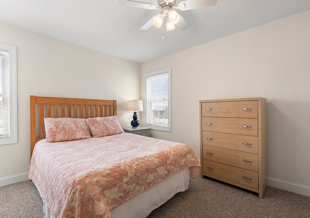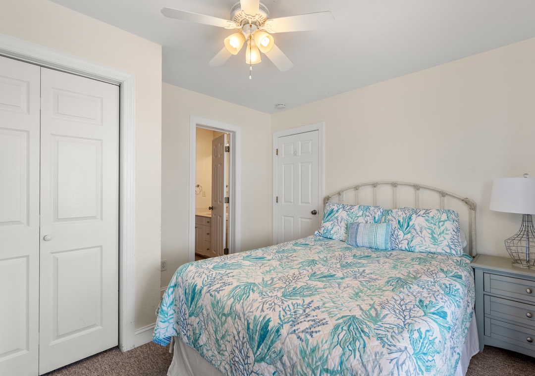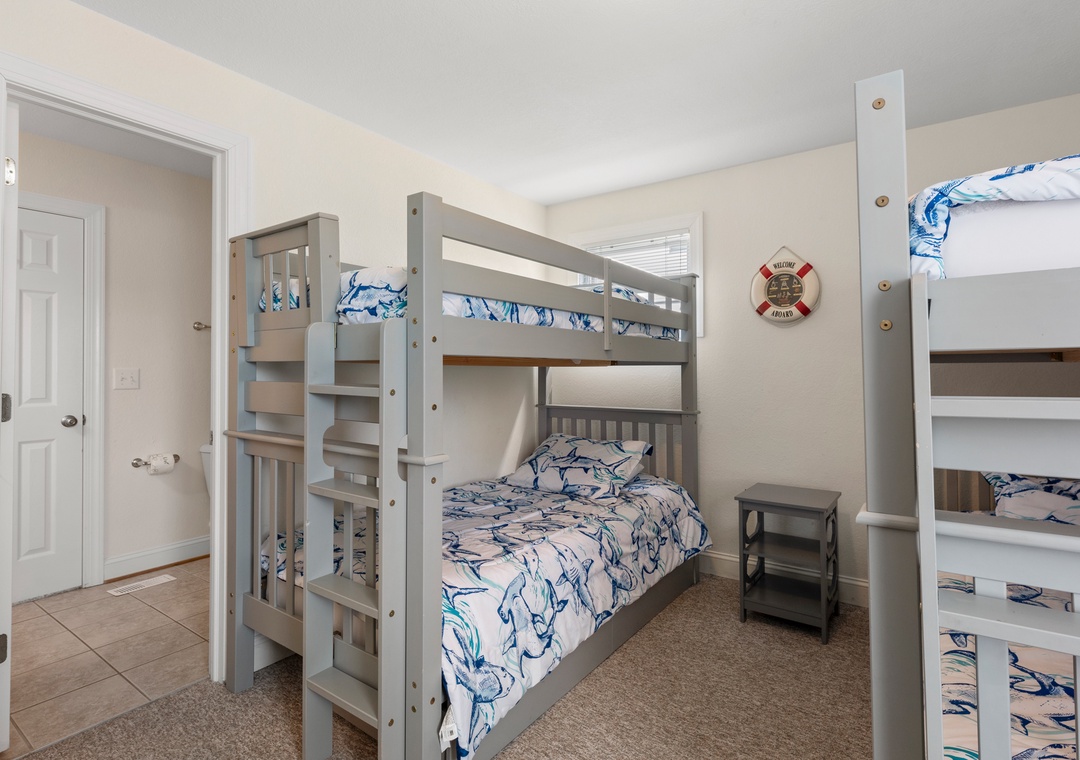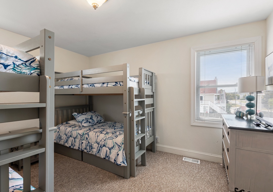 The mid-level includes two queen bedrooms suites as well as a bunk room. The first queen has its own full bathroom and the second bedroom shares a full bath with the bunk room.