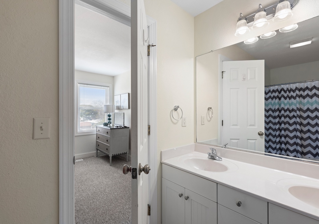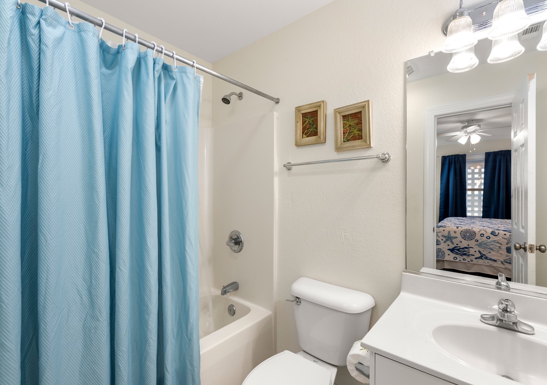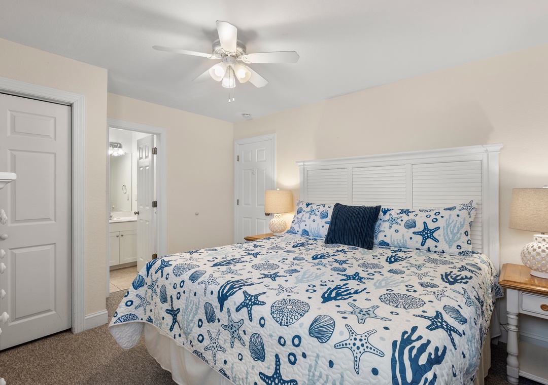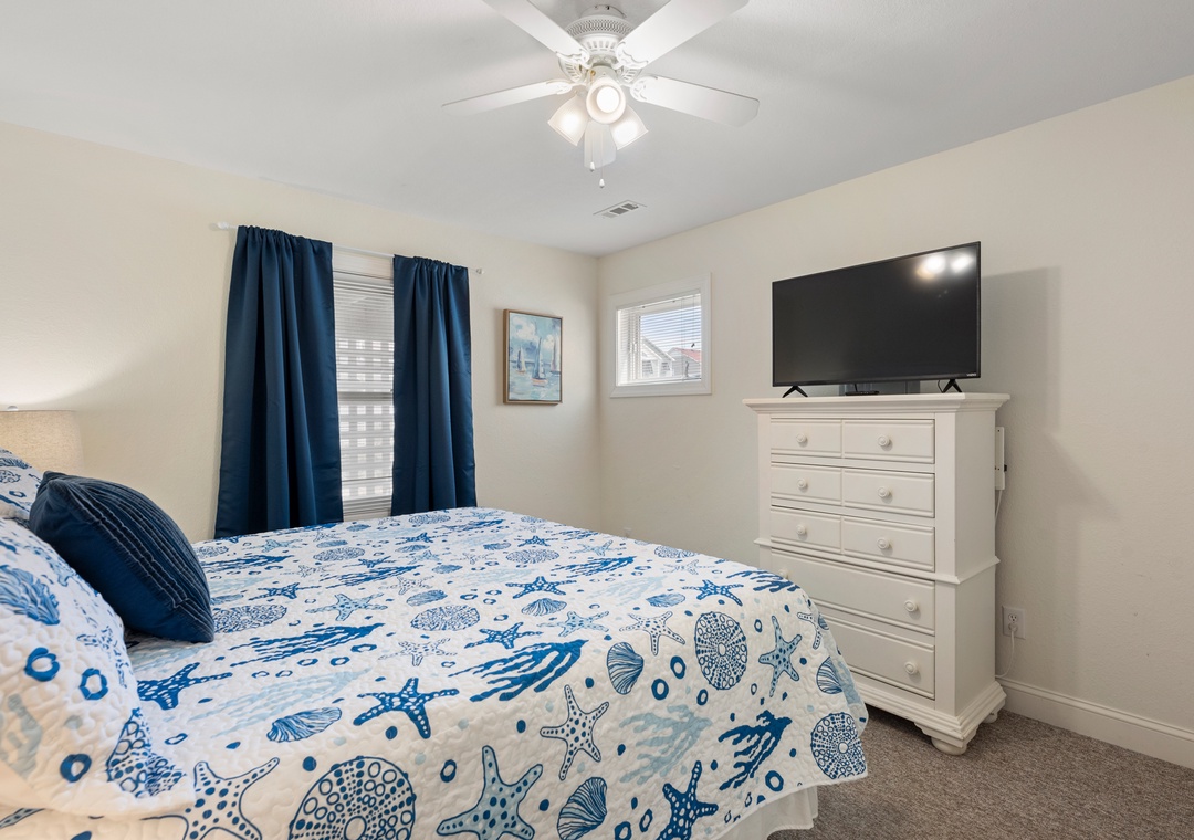 The mid-level includes two queen bedrooms suites as well as a bunk room. The first queen has its own full bathroom and the second bedroom shares a full bath with the bunk room.