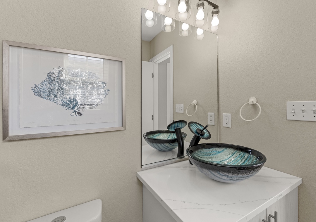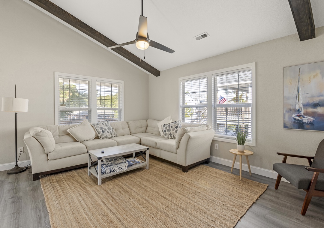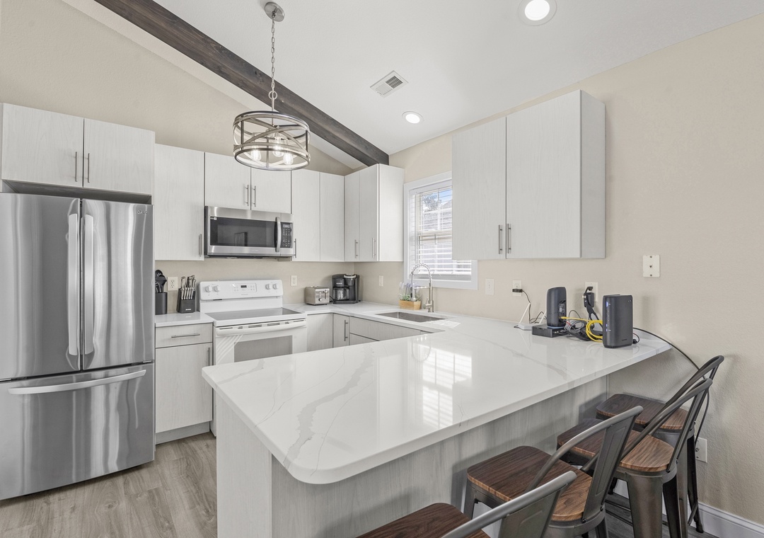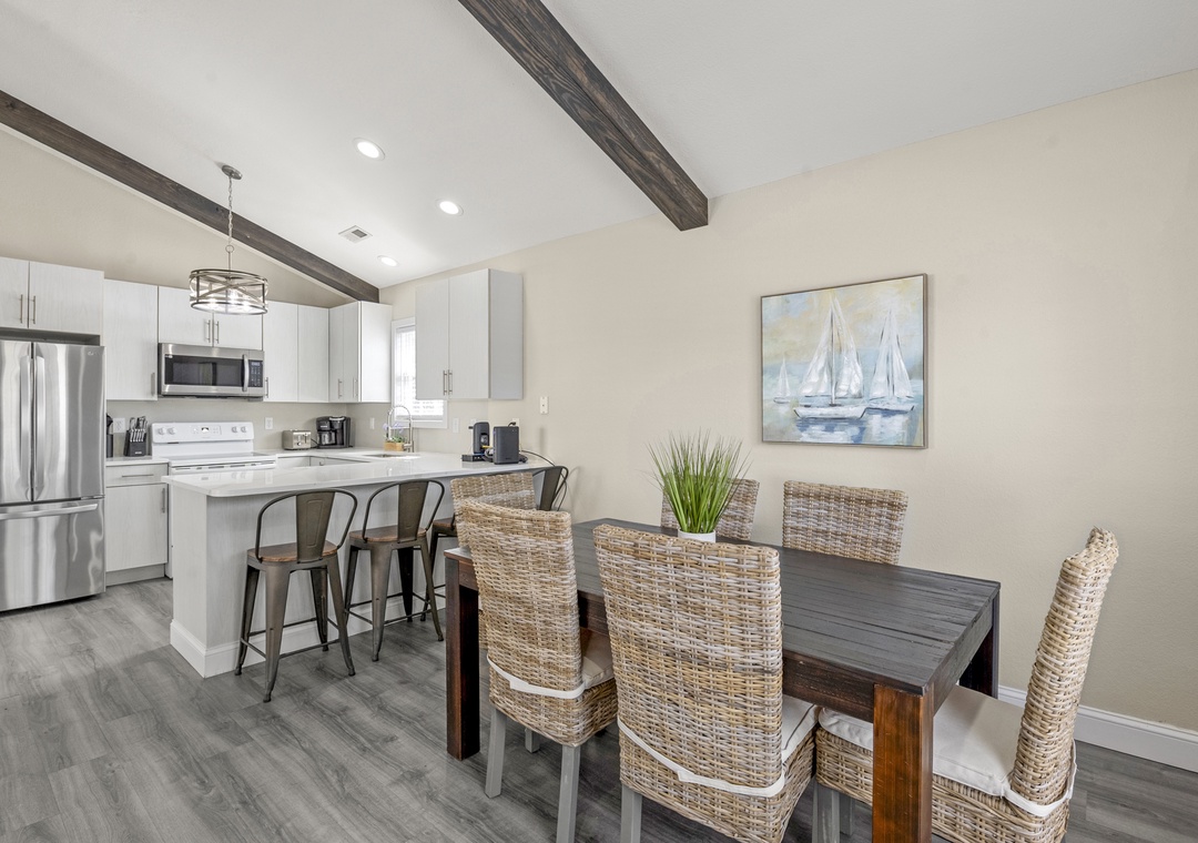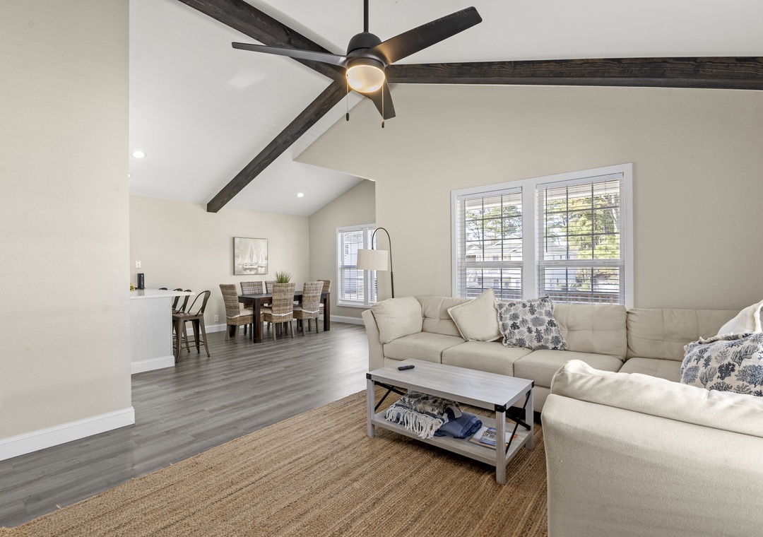 Back at the house, relax in the bright and airy open-concept great room with vaulted ceilings and laminate wood flooring, ideal for sandy feet and paws returning from the beach. When you're not dining out, use the well-equipped kitchen with quartz countertops and a peninsula with bar seating where the family can gather during meal prep. The primary suite features a private bath with custom tiled walk-in shower and a unique, coastal-inspired vessel sink.