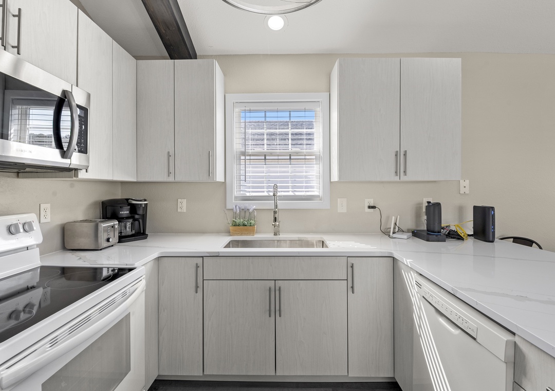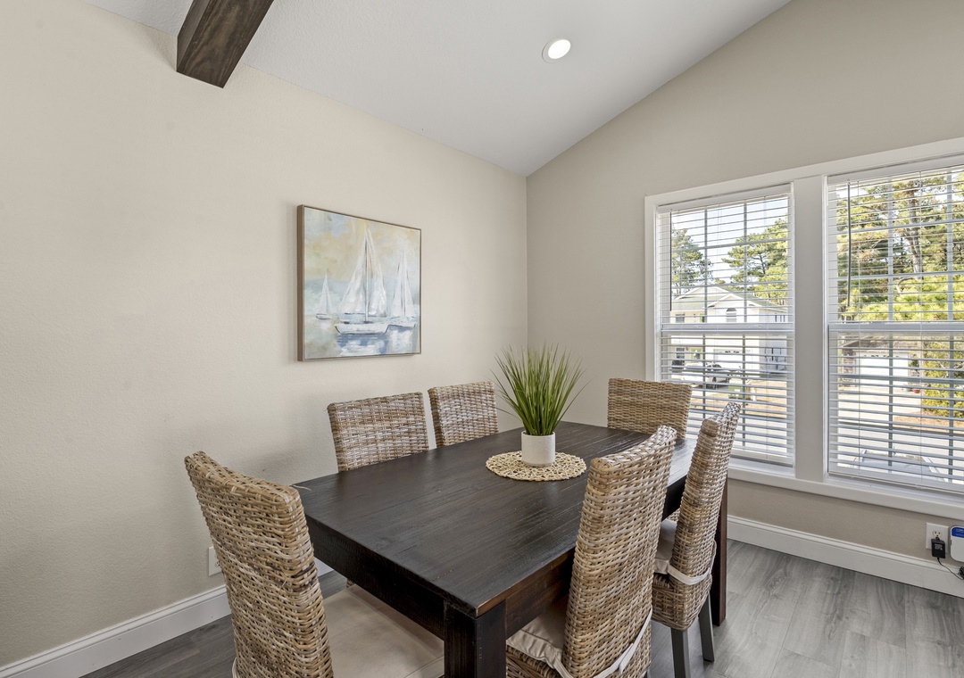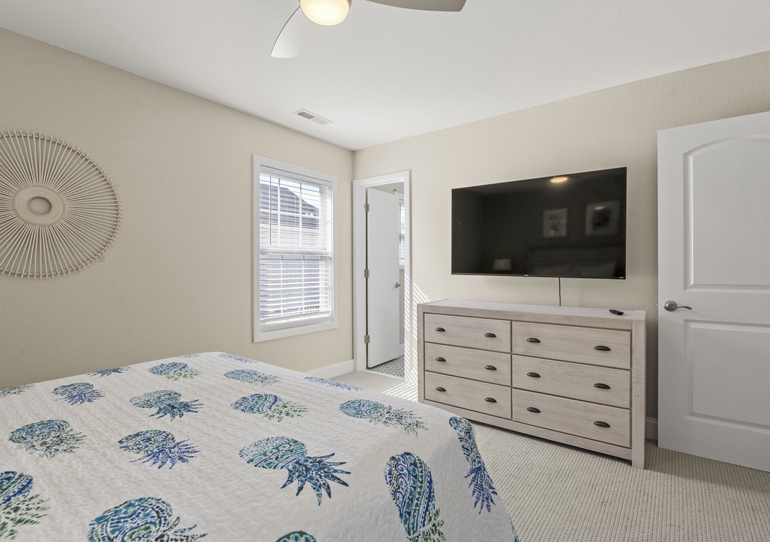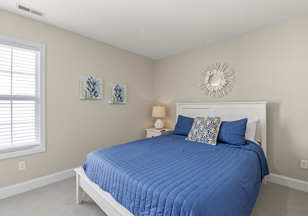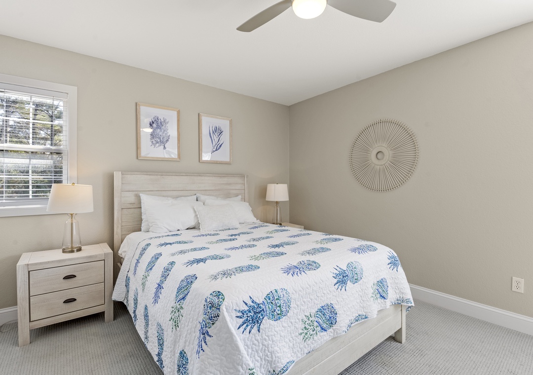 Back at the house, relax in the bright and airy open-concept great room with vaulted ceilings and laminate wood flooring, ideal for sandy feet and paws returning from the beach. When you're not dining out, use the well-equipped kitchen with quartz countertops and a peninsula with bar seating where the family can gather during meal prep. The primary suite features a private bath with custom tiled walk-in shower and a unique, coastal-inspired vessel sink.