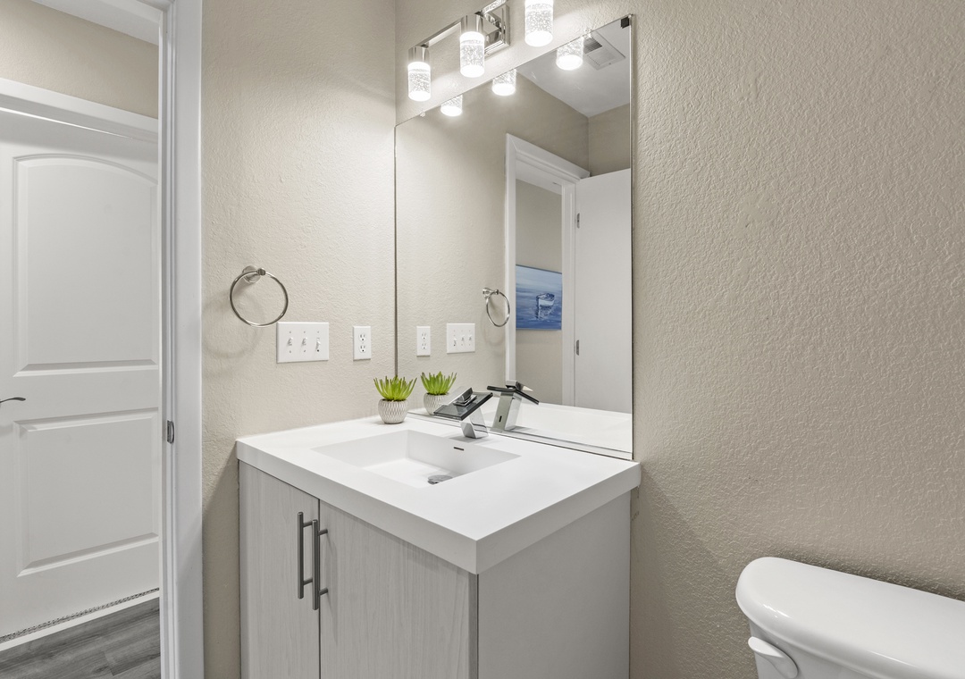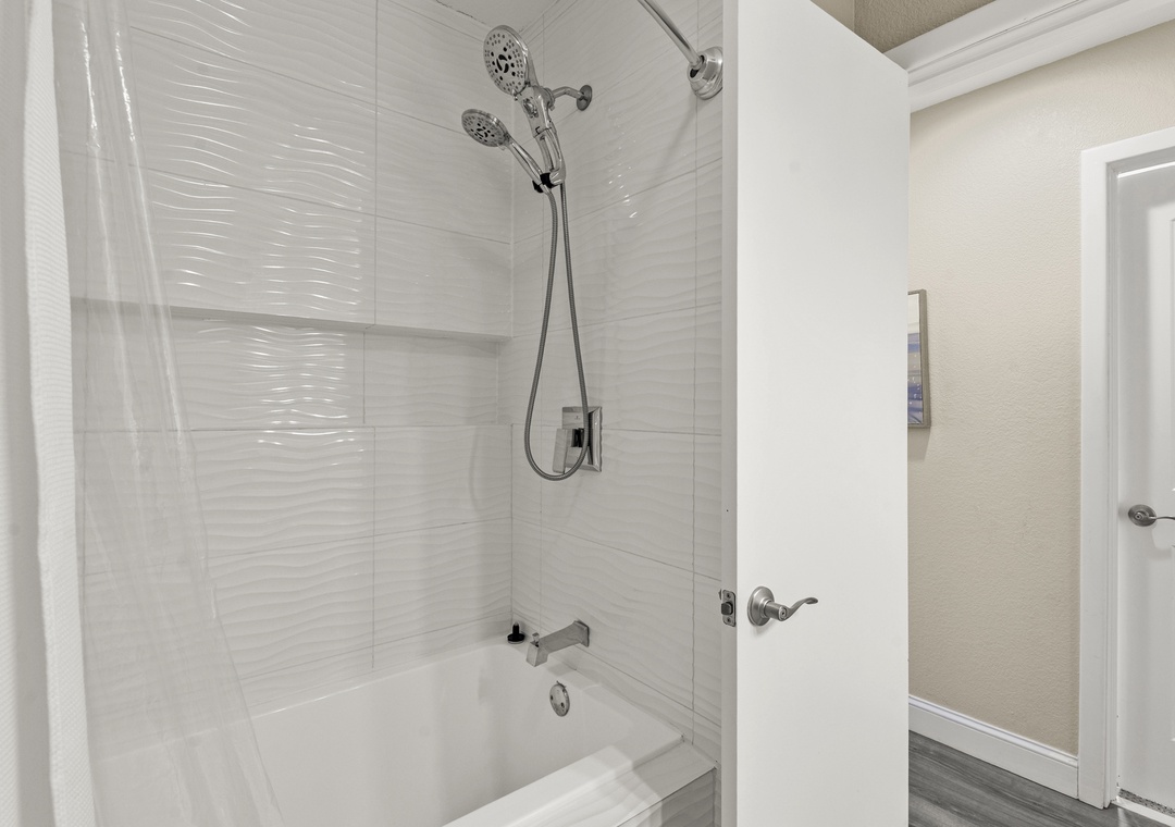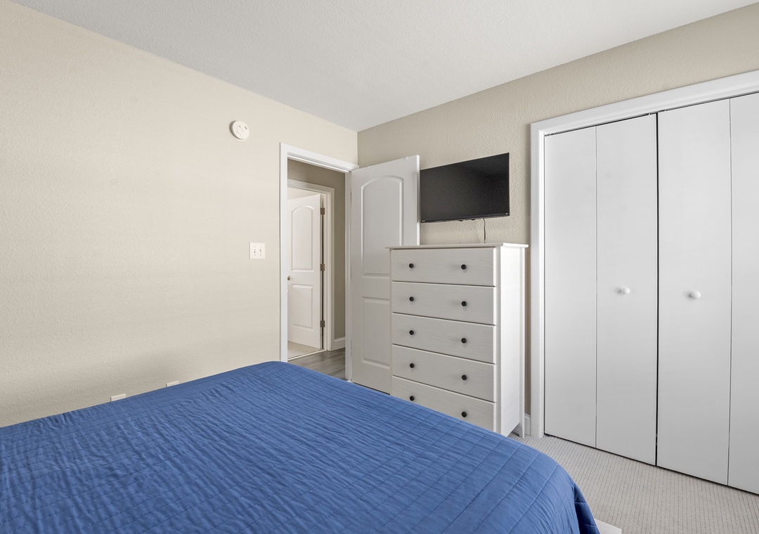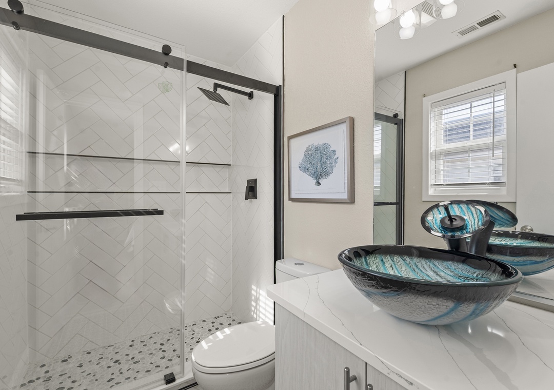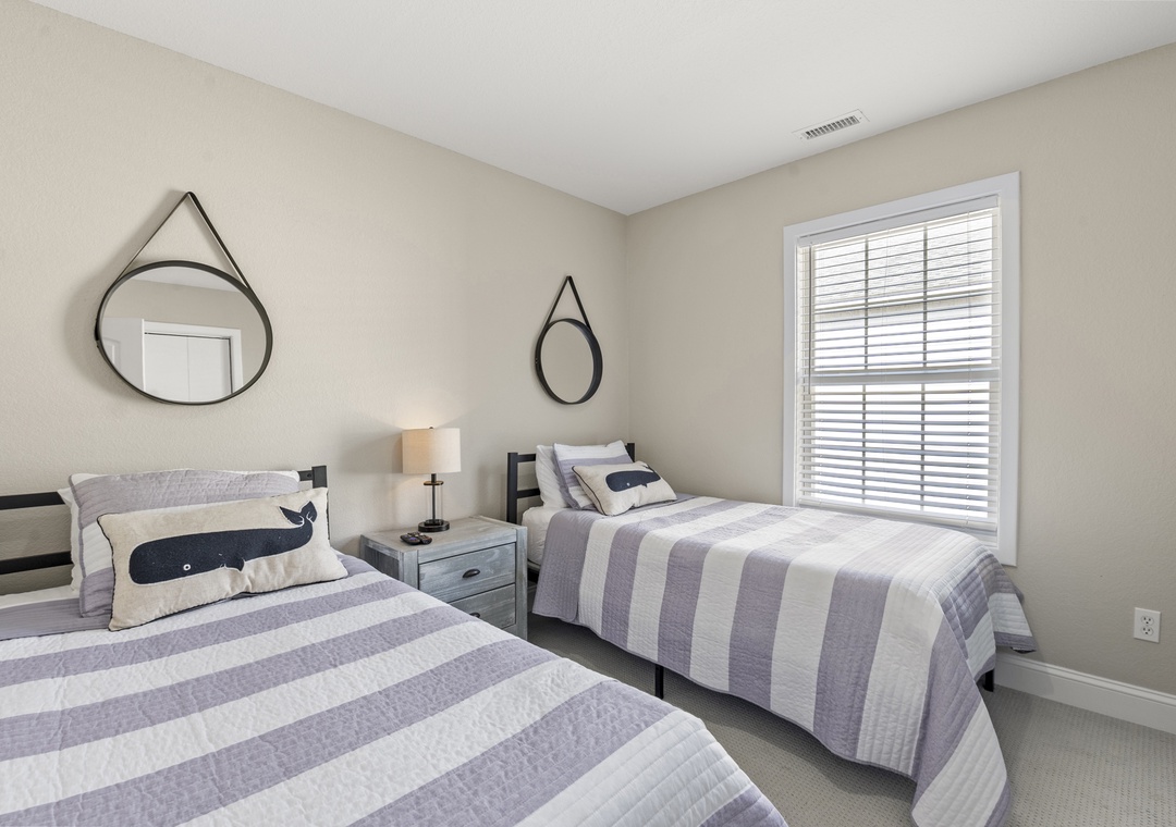Back at the house, relax in the bright and airy open-concept great room with vaulted ceilings and laminate wood flooring, ideal for sandy feet and paws returning from the beach. When you're not dining out, use the well-equipped kitchen with quartz countertops and a peninsula with bar seating where the family can gather during meal prep. The primary suite features a private bath with custom tiled walk-in shower and a unique, coastal-inspired vessel sink.